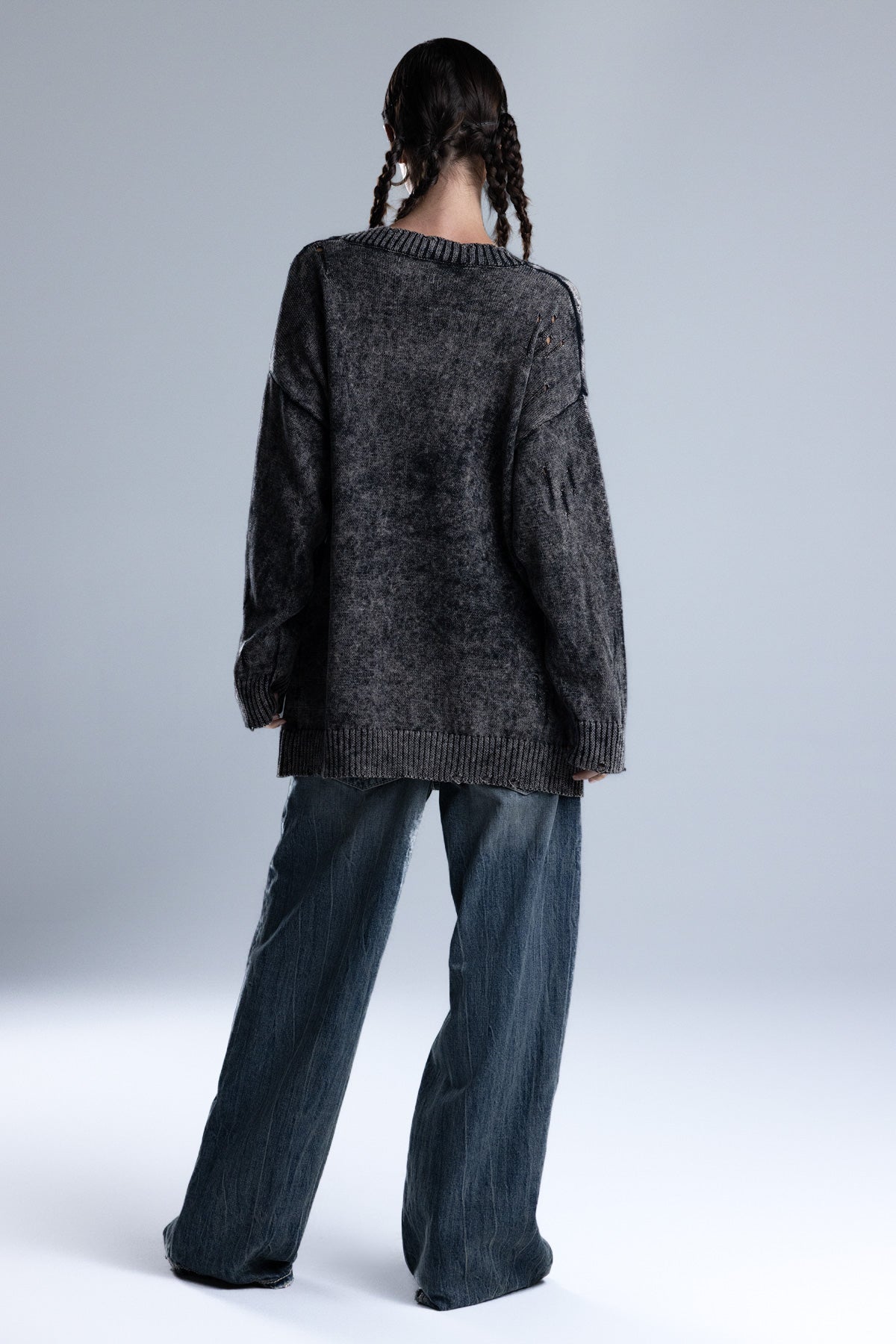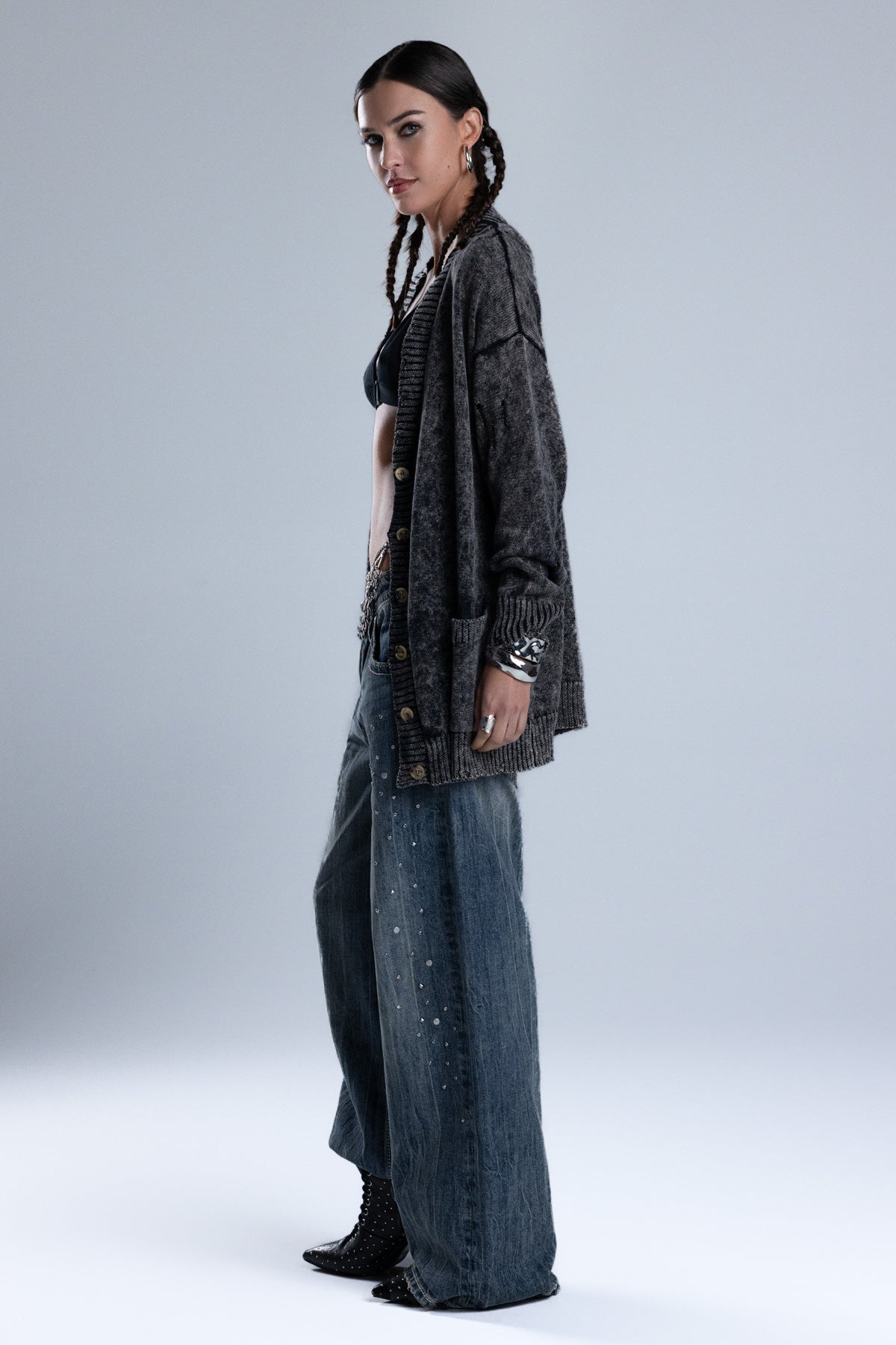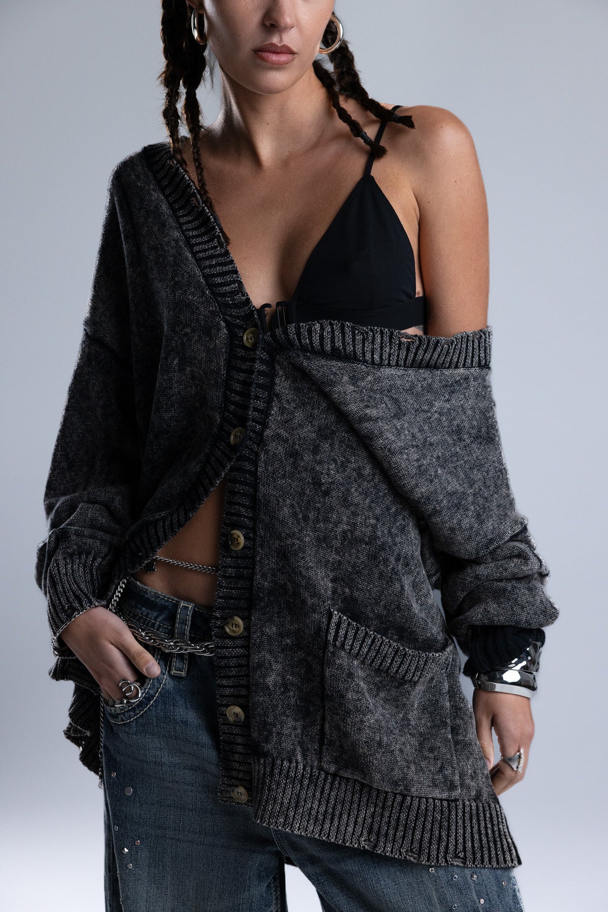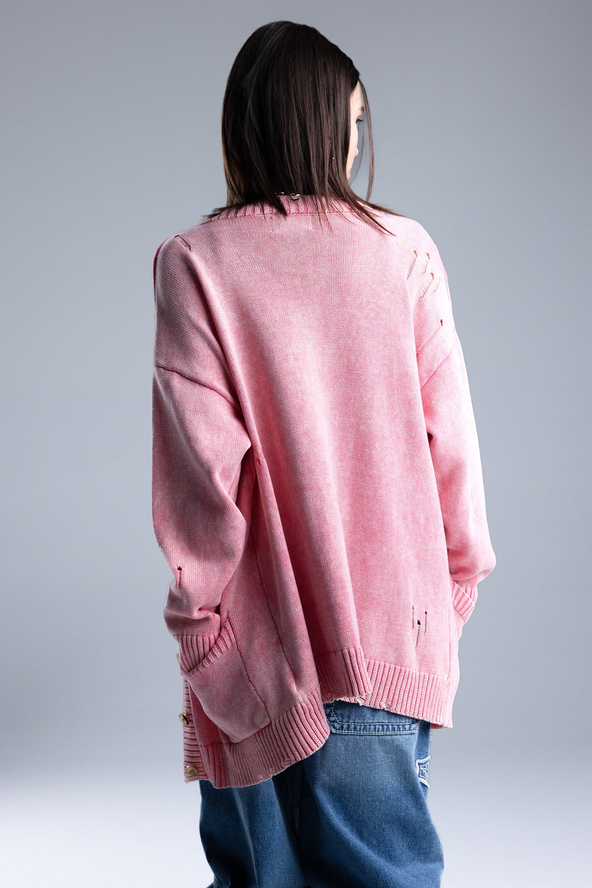 Oversized, ribbed knit cardigan – Acid-washed finish – Tonal rib-knit trim – Lightly distressed detailing – Button-front closure – Open-front V-neckline Style No. BMSW0031L-ROSE PINK, BMSW0031L-CHRC BLACK