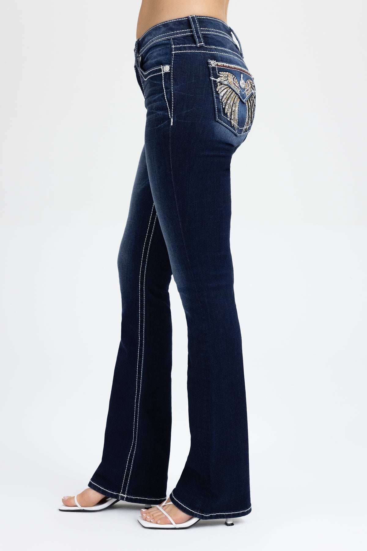 Washed finish, mid-rise bootcut jeans – Embroidered metallic sequin wing design in bronze, gold, and silver tones – Stitched leather appliqué highlights – Sequin and rhinestone rivet accents – Embossed black leather cross Miss Me brand patch – Whiskering details – Functional flap back pockets – 5-pocket design Style No. M5082B226L-D1160, M5082B226S-D1160. M5082B226V-D1160