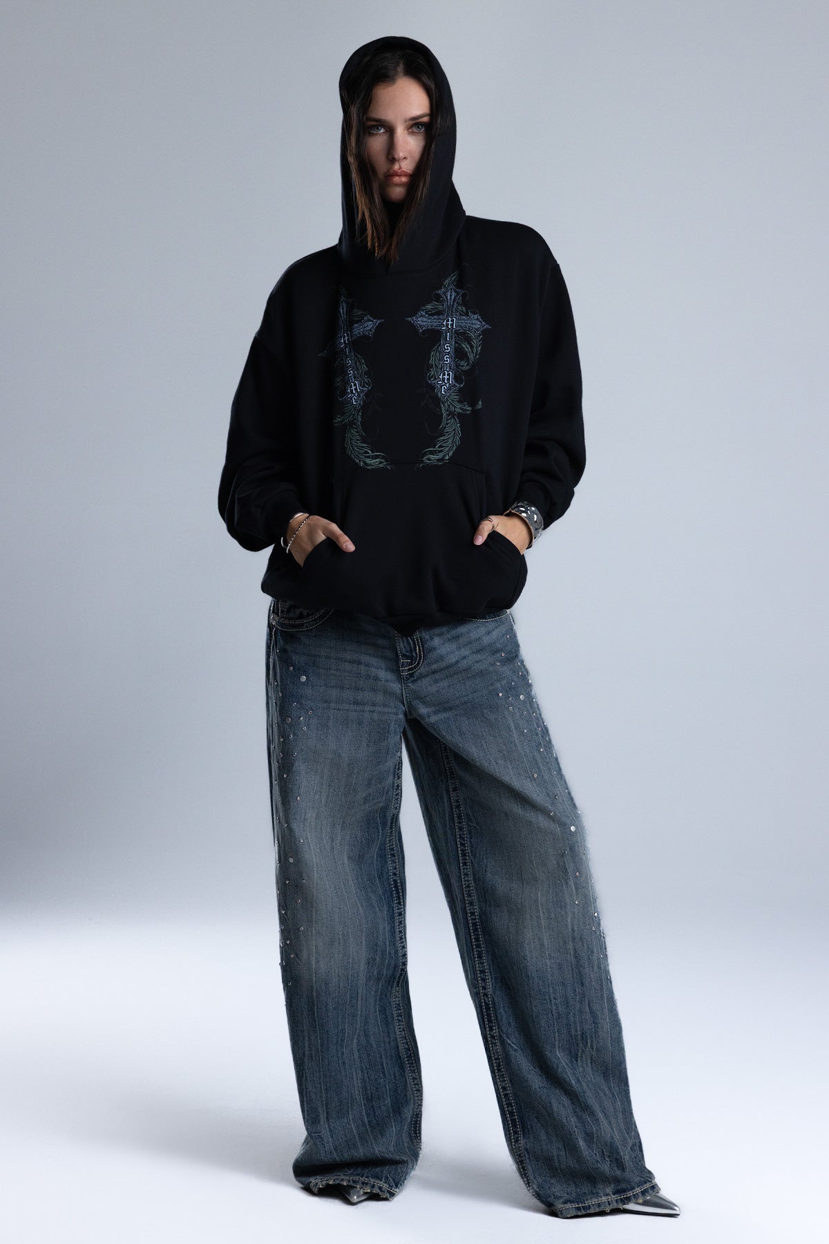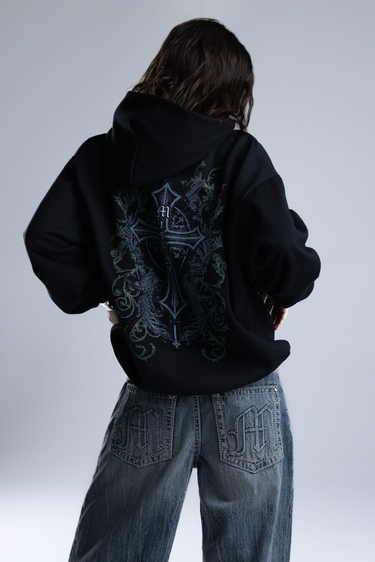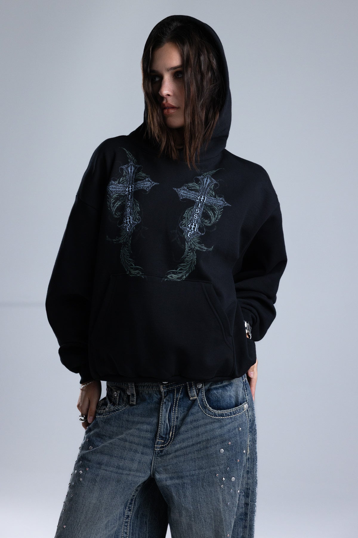 Relaxed fit pullover hoodie – Baroque gothic cross graphic design – Feathered and vine-inspired filigree scrollwork – Miss Me scripture – Ribbed cuffs and hem – Kangaroo pocket Style No. BMT0166L-CHRC BLK