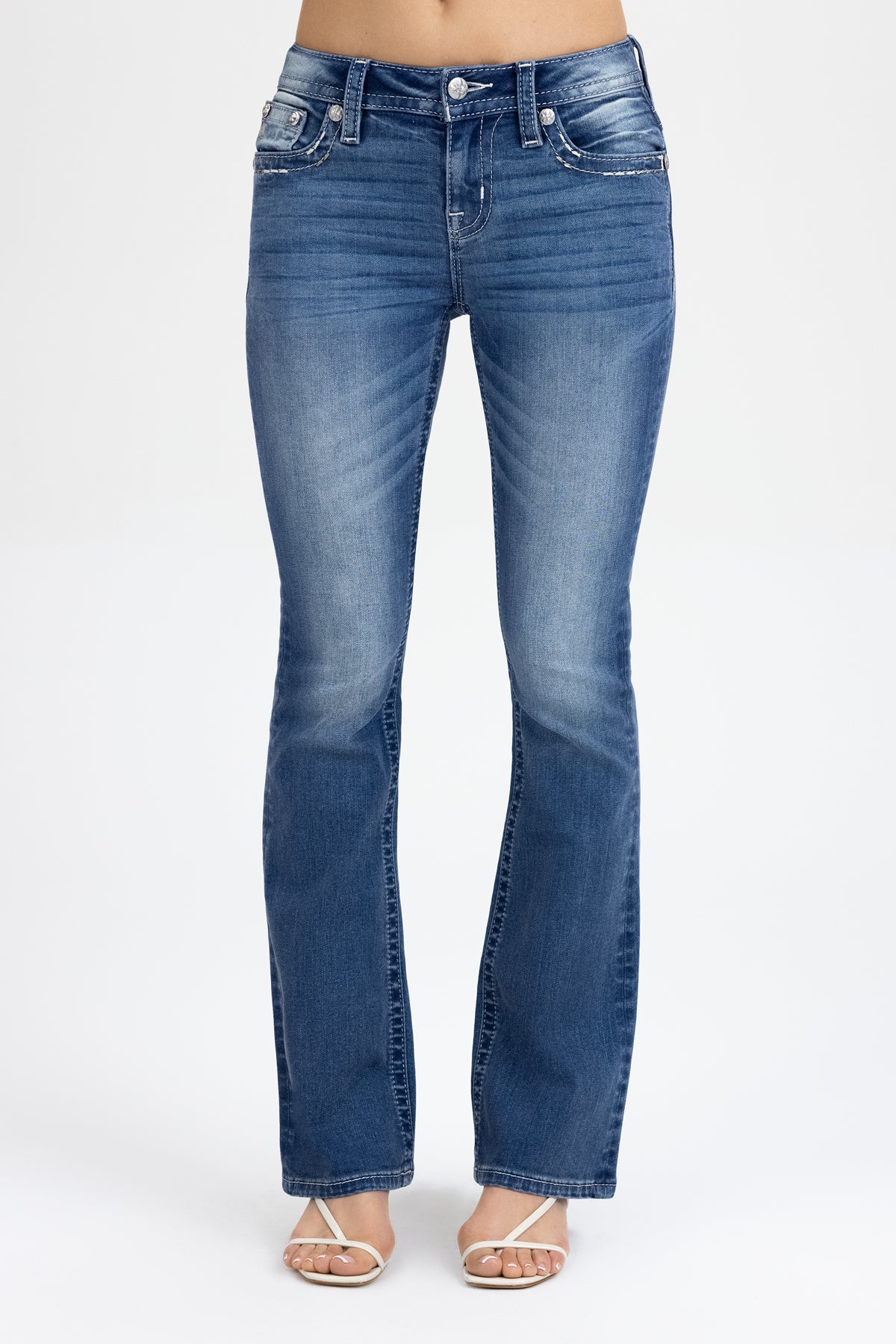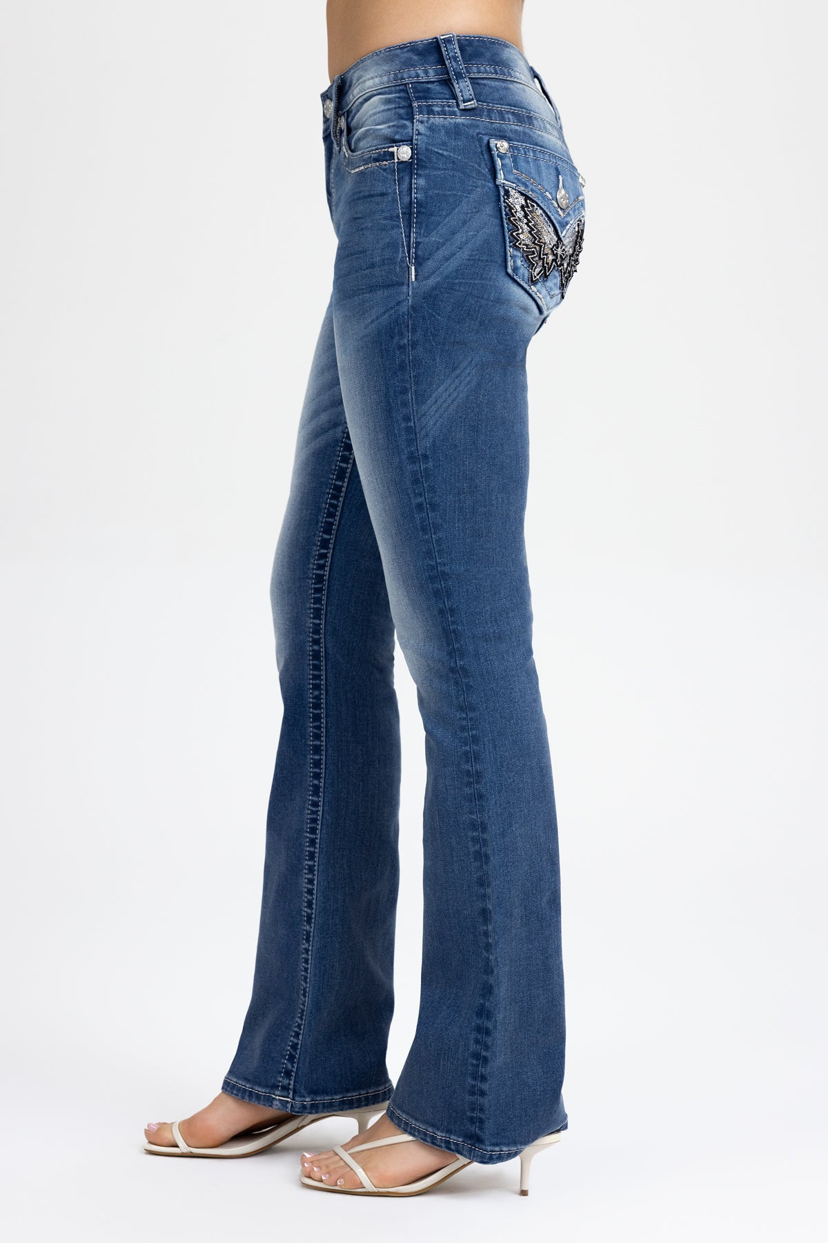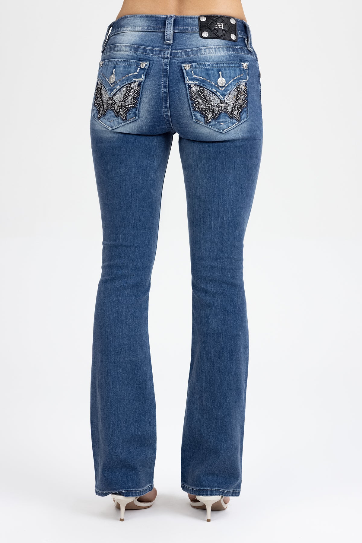 Washed finish, mid-rise bootcut jeans – Embroidered leather appliqué winged cross design – Spiral and saddle-stitched detailing – Sequin and rhinestone rivet accents – Embossed black studded leather cross Miss Me brand patch – Whiskering details – Functional back pockets – 5-pocket design Model is wearing size: 25 Model Measurements: Height: 5’8″ Bust: 32B Waist: 25″ Hips: 35″ Fabric Content: 93% Cotton, 6% Polyester, 1% Elastane Care: Gentle machine wash inside-out with like colors in cold water. Tumble dry low. Style No. M3080B86L-M1092, M3080B86S-M1092, M3080B86V-M1092
