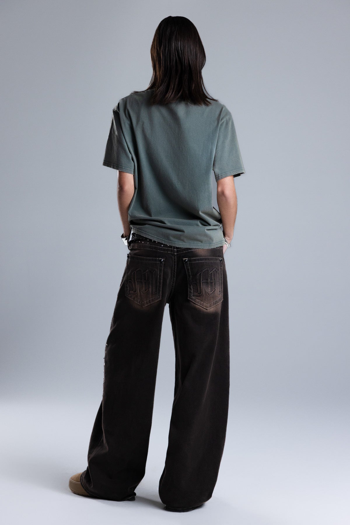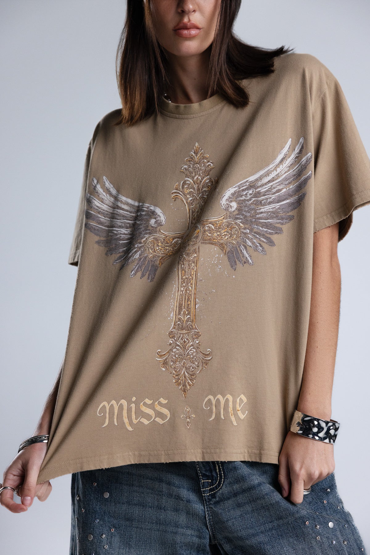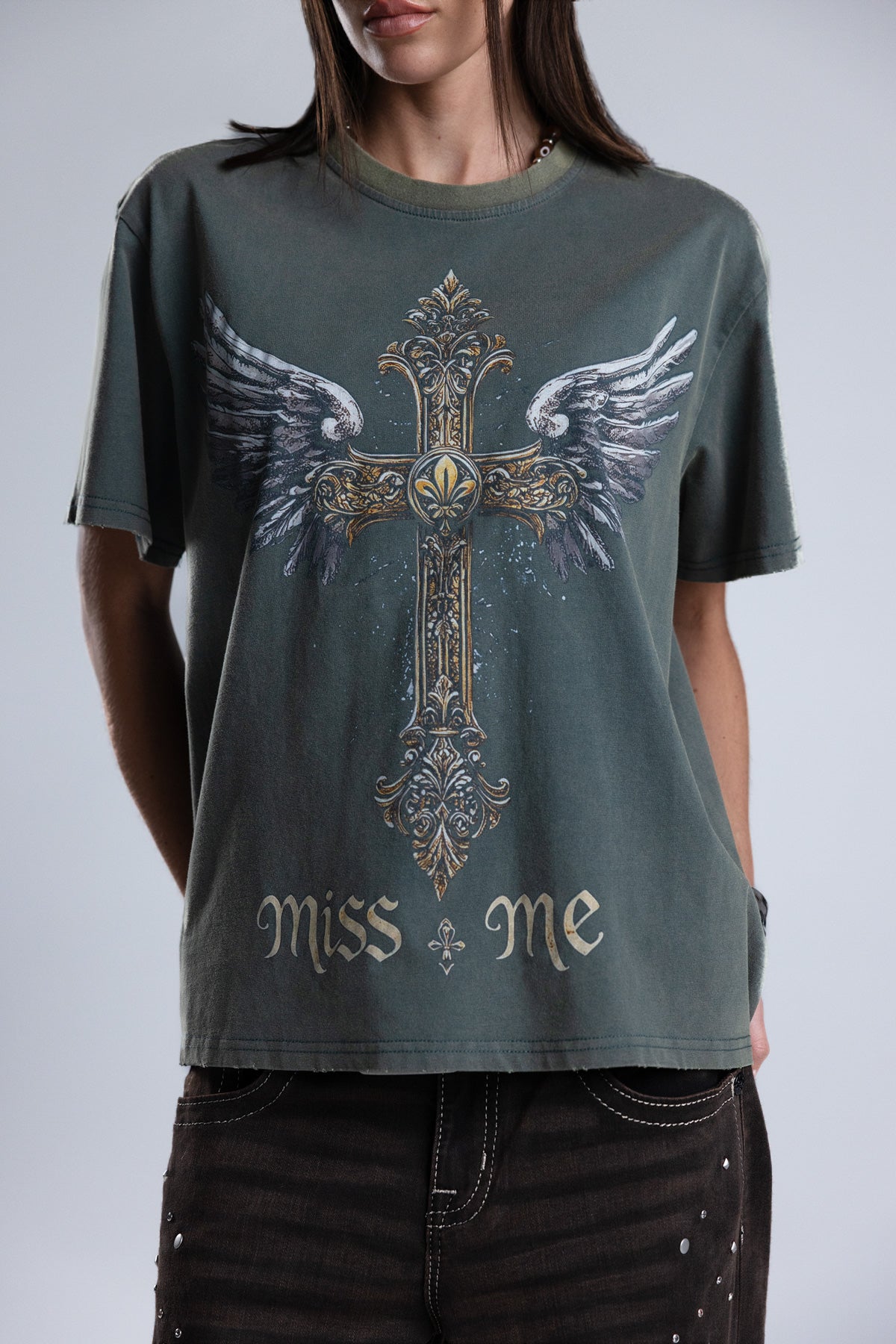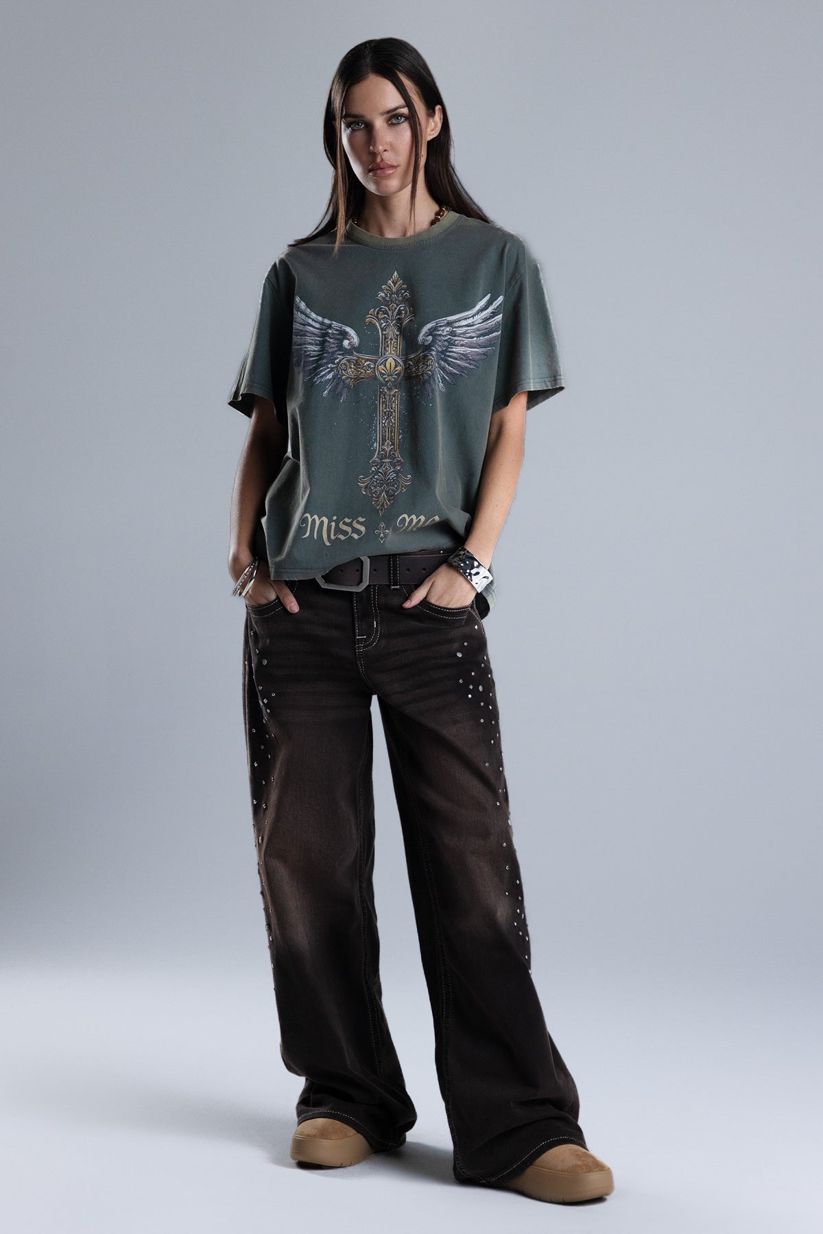 Relaxed fit graphic tee – Baroque winged cross graphic design – Miss Me script – Raw-edge cuff and hem detailing – Classic crew neckline Style No. BMT0872S-TAUPE BEIG, BMT0872S-GREEN