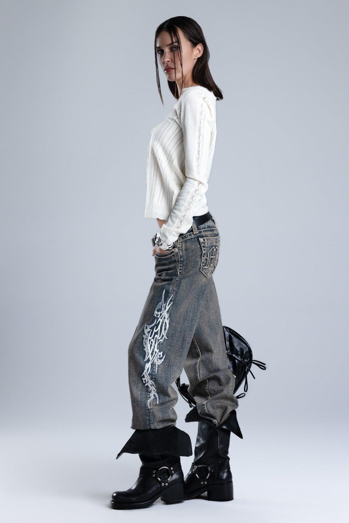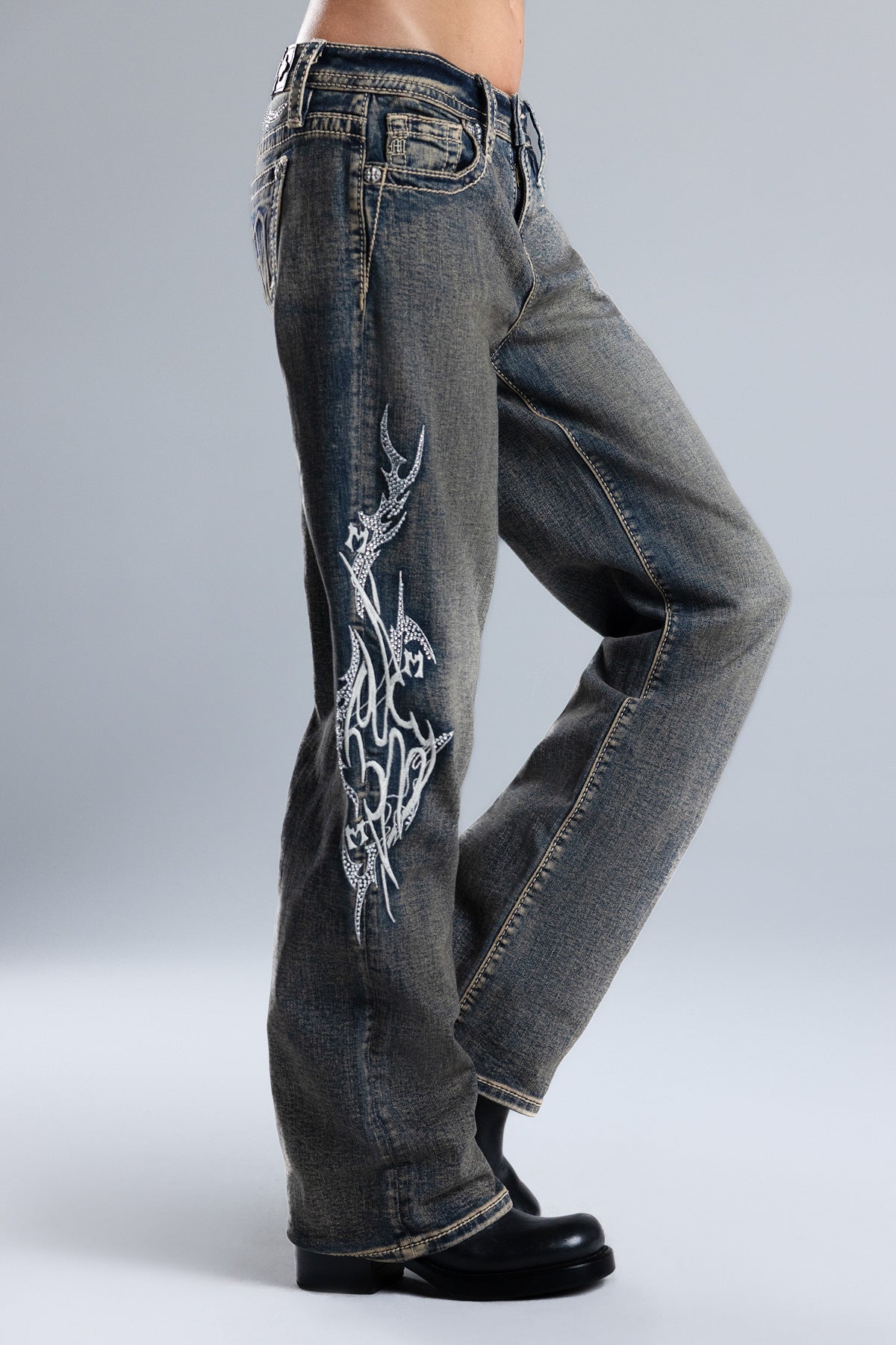 Mid-rise slim wide jeans – Embroidered filigree scrollwork design – Raised monogram logo – Studded rhinestone embellishments – Embossed black leather cross Miss Me brand patch – 5-pocket design Style No. M9467SW11S-V171, M9467SW11V-V171