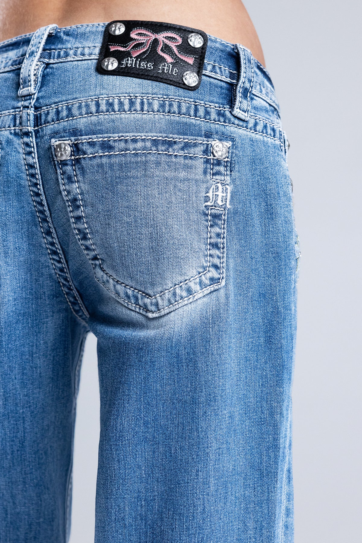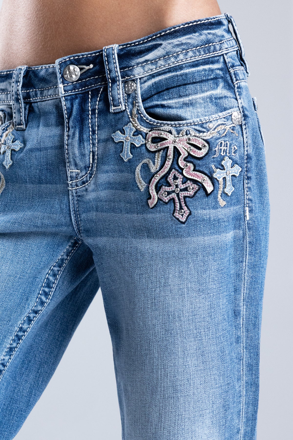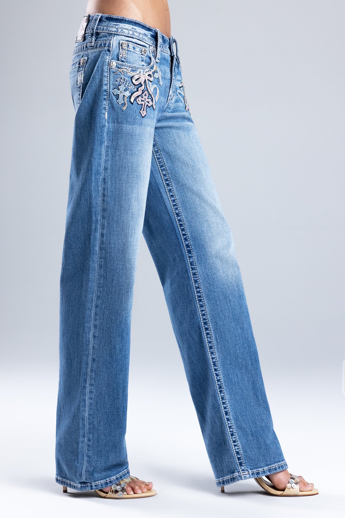 Mid-rise, slim wide jeans – Leather appliqué ribbon front pocket design – Embroidered and leather-overlay cross highlights – Rhinestone rivet detailing – Gothic Miss Me branding – Embossed pink-on-black studded leather ribbon Miss Me brand patch – Whiskering details – 5-pocket design Style No. M9509SWL-M1057, M9509SWV-M1057, M9509SWS-M1057