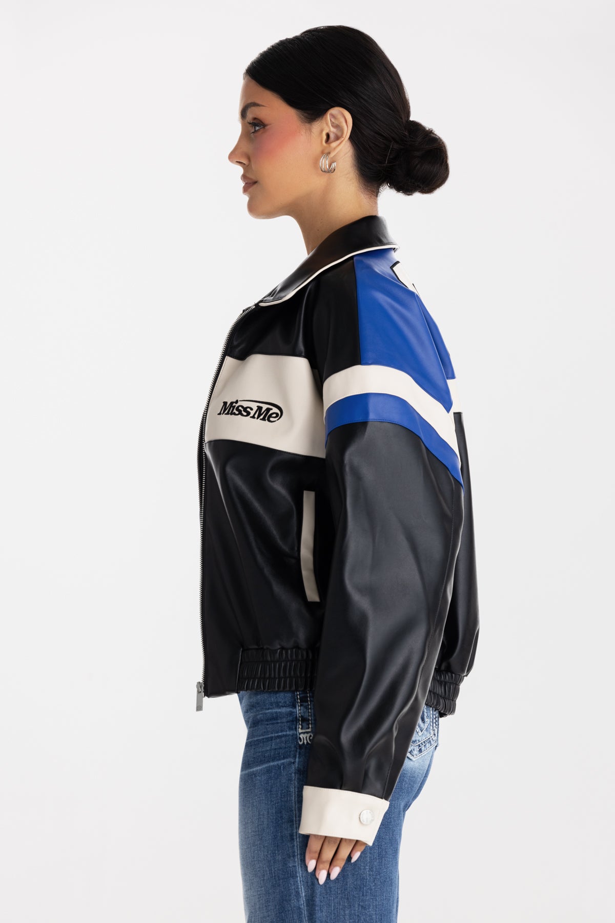 Faux tri-panel leather jacket – Embroidered vintage-inspired Miss Me branding – Embossed 01 and fleur-de-lis design – Cinched waist hem – Sleeve button closure detail – 2-pocket design – Zip-front closure Model is wearing size: S Model Measurements: Height: 5????Bust: 34B Waist: 25??Hips: 36??Fabric Content: Self/Faux: 50% Polyurethane, 50% Polyester; Cont1/Faux: 50% Polyurethane, 50% Polyester; Cont2/Faux: 50% Polyurethane, 50% Polyester Care: Gentle machine wash inside-out with like colors in cold water. Hang to dry Style No. BMJ0044L-BLACK