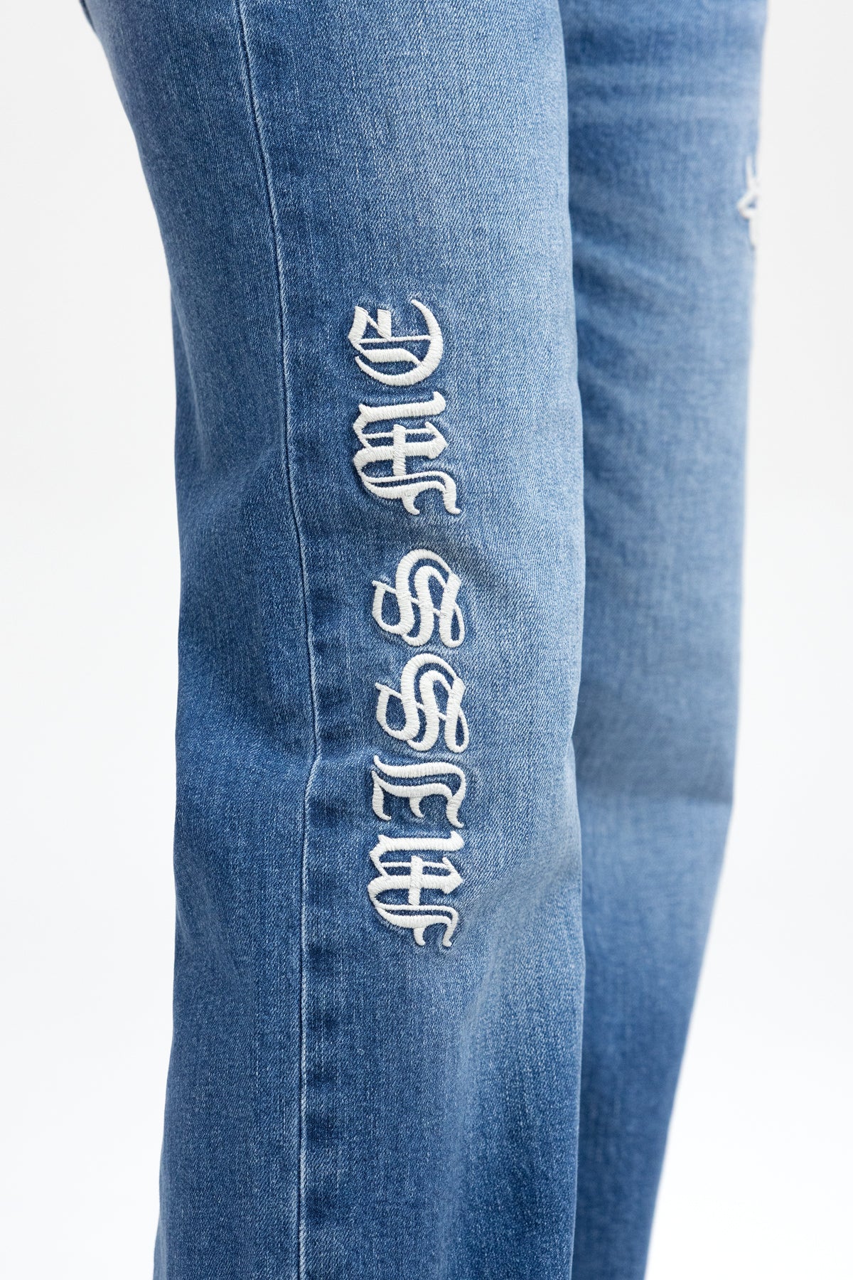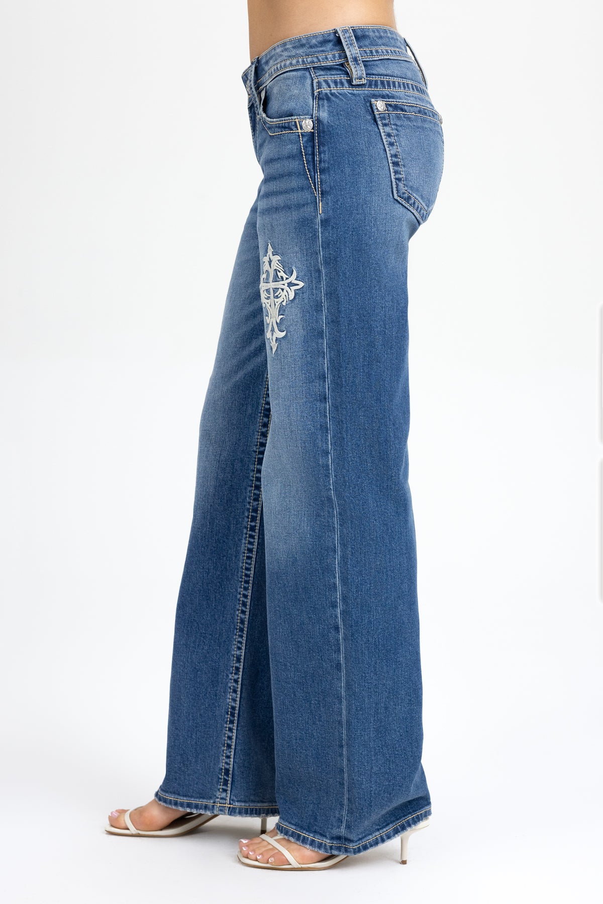 Washed, low-rise wide-leg jeans – Embroidered Gothic Miss Me statement and cross design – Worn-in pocket edges – Embossed black studded leather cross Miss Me brand patch – Whiskering details – 5-pocket design Model is wearing size: 25 Model Measurements: Height: 5’9″ Bust: 34B Waist: 25″ Hips: 36″ Fabric Content: 99% Cotton, 1% Elastane Care: Gentle machine wash inside-out with like colors in cold water. Tumble dry low. Style No. L9513WS-M1060, L9513WV-M1060