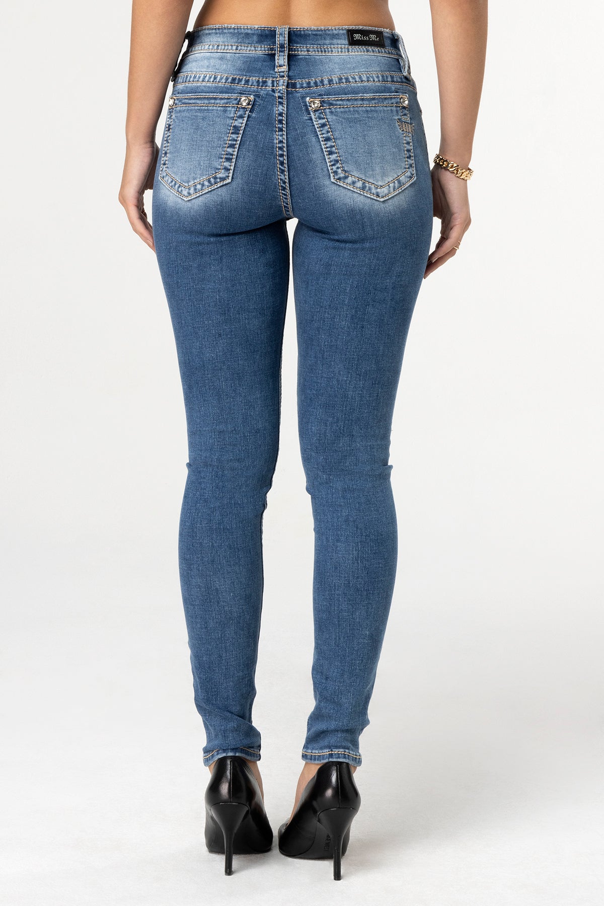 High-rise, medium-washed skinny jeans – Golden mini Miss Me logo with wing embroidery on standard back pocket – Rhinestone rivets – Slight fading and whiskering details – 5-pocket design – Embossed black leather Miss Me brand patch Style No. H3636S92-M937