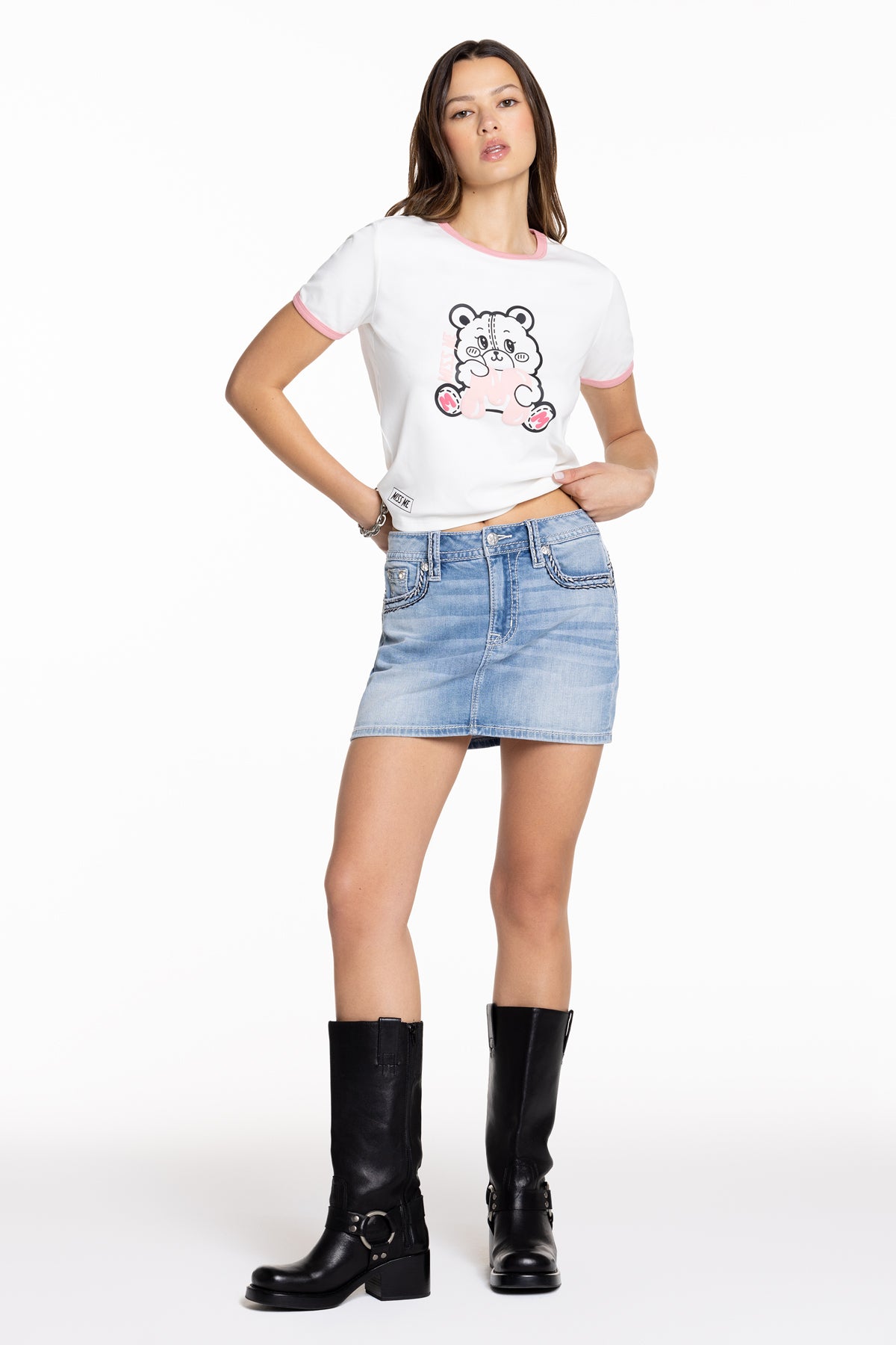 Washed, mid-rise denim skirt – Saddle-stitched border design – Embroidered mini Miss Me logo – Faux flap pockets with rhinestone rivet accents – Embossed white leather cross Miss Me brand patch – Whiskering details – 5-pocket design Model is wearing size: 25 Model Measurements: Height: 5’9.5″ Bust: 34″ Waist: 24″ Hips: 35″ Fabric Content: 99% Cotton, 1% Elastane Care: Gentle machine wash inside-out with like colors in cold water. Tumble dry low. Style No. M5014N419-L301