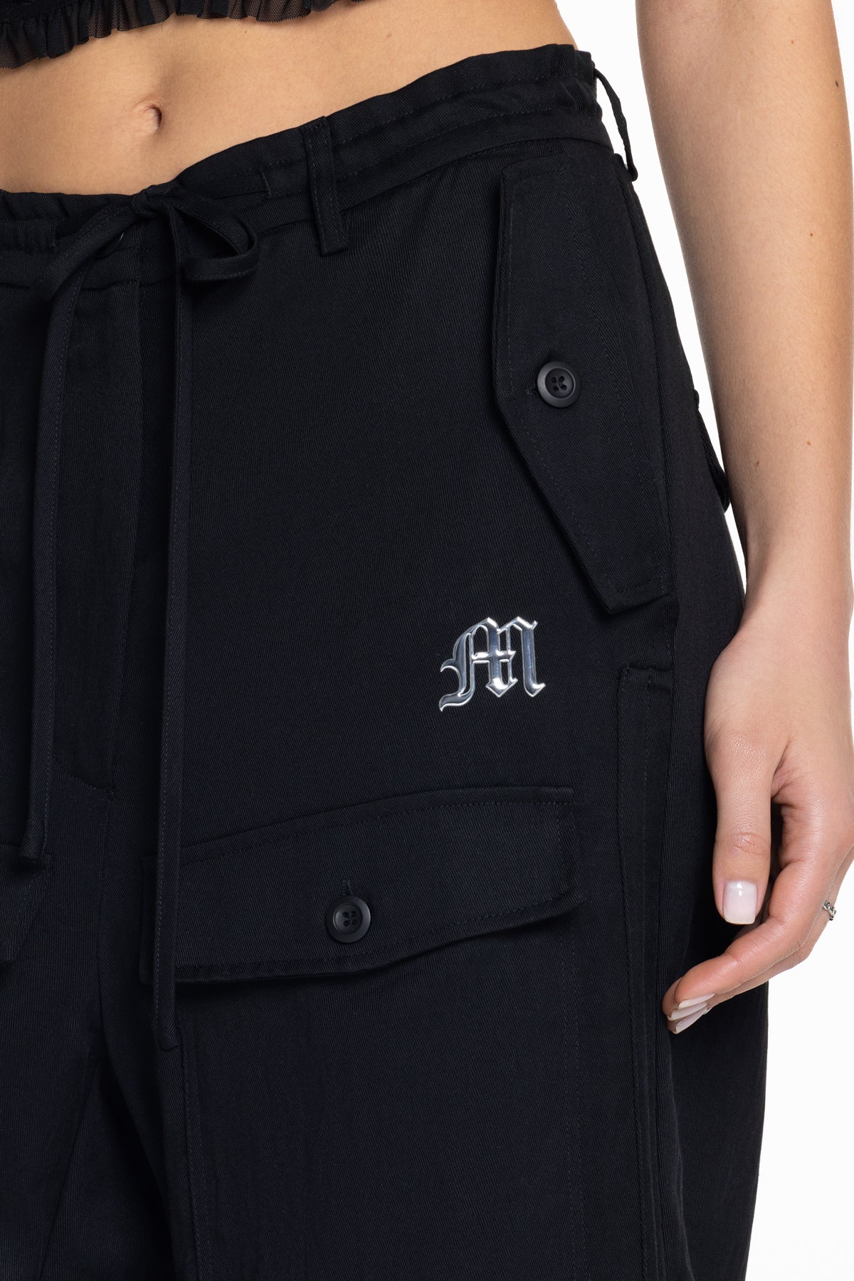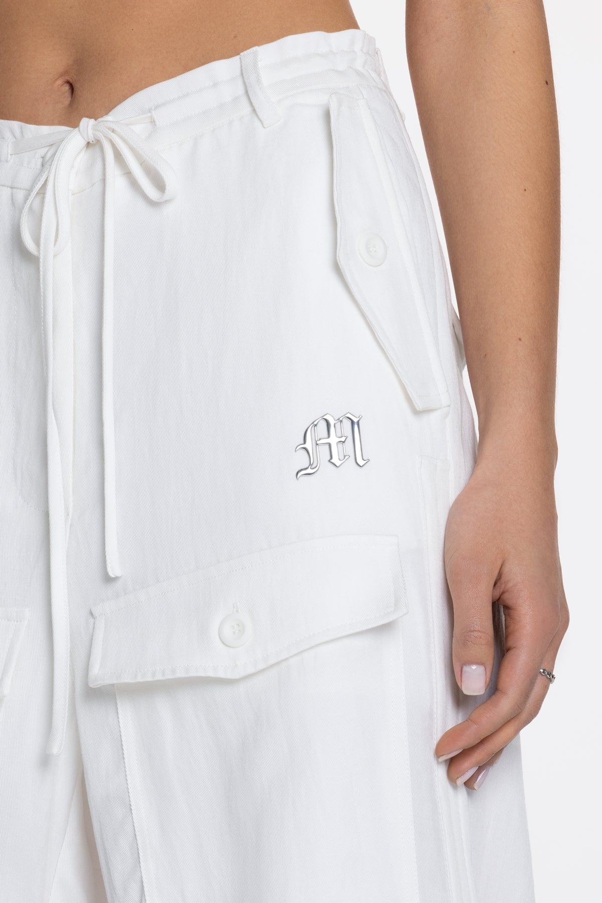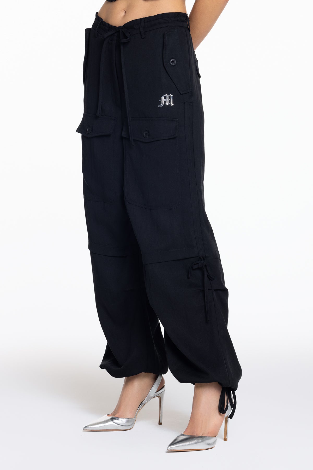 Light-weight cargo pants – Breathable crepe fabric texture – Embossed mini gothic Miss Me logo branding – Dual cargo pockets with button closures – Functional front pockets with flap closure – Faux back pockets – Adjustable drawstrings at waist, knees and hem Model is wearing size: S Model Measurements: Height: 5’9.5″ Bust: 34″ Waist: 24″ Hips: 35″ Fabric Content: Self: 65% Tencel, 30% Rayon, 5% Nylon; Lining: 100% Rayon Care: Gentle machine wash inside-out with like colors in cold water. Tumble dry low. Style No. BMP0003L-BLACK, BMP0003L-WHITE