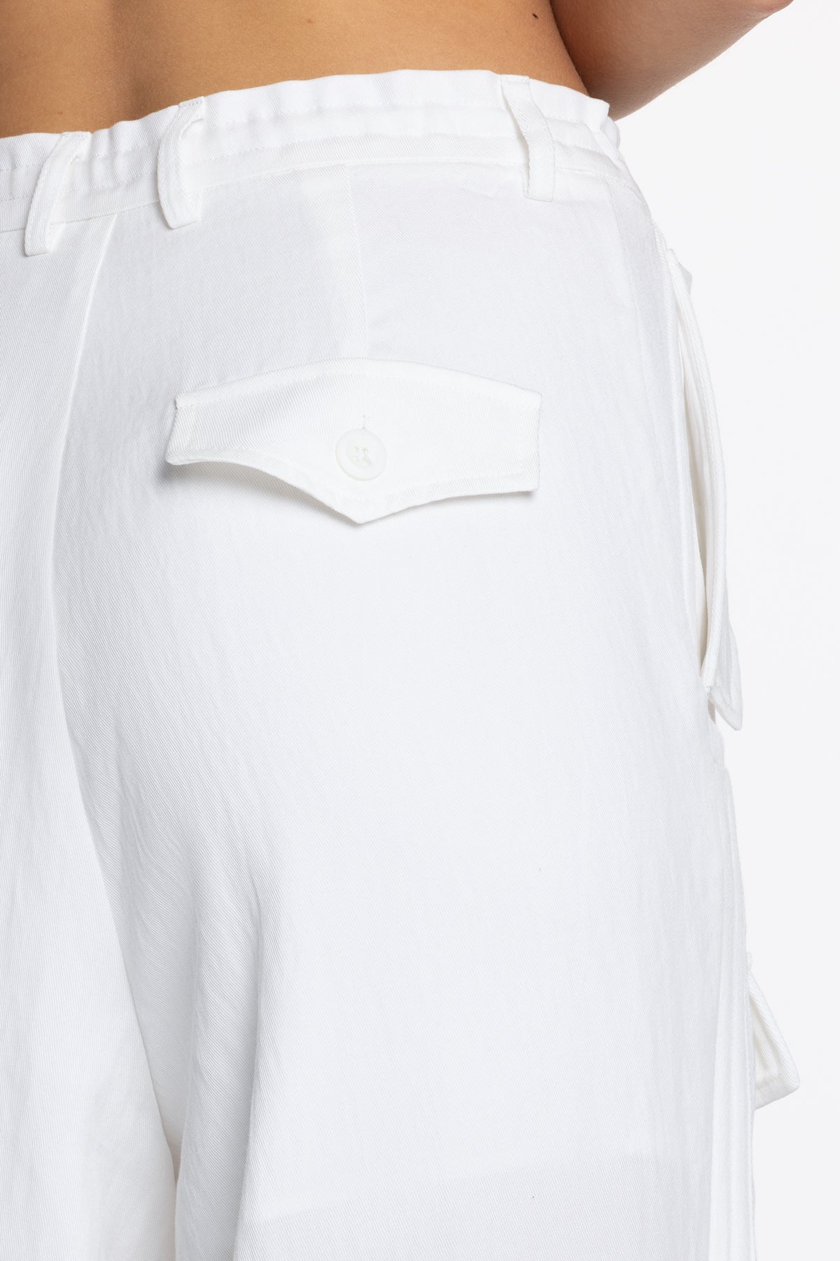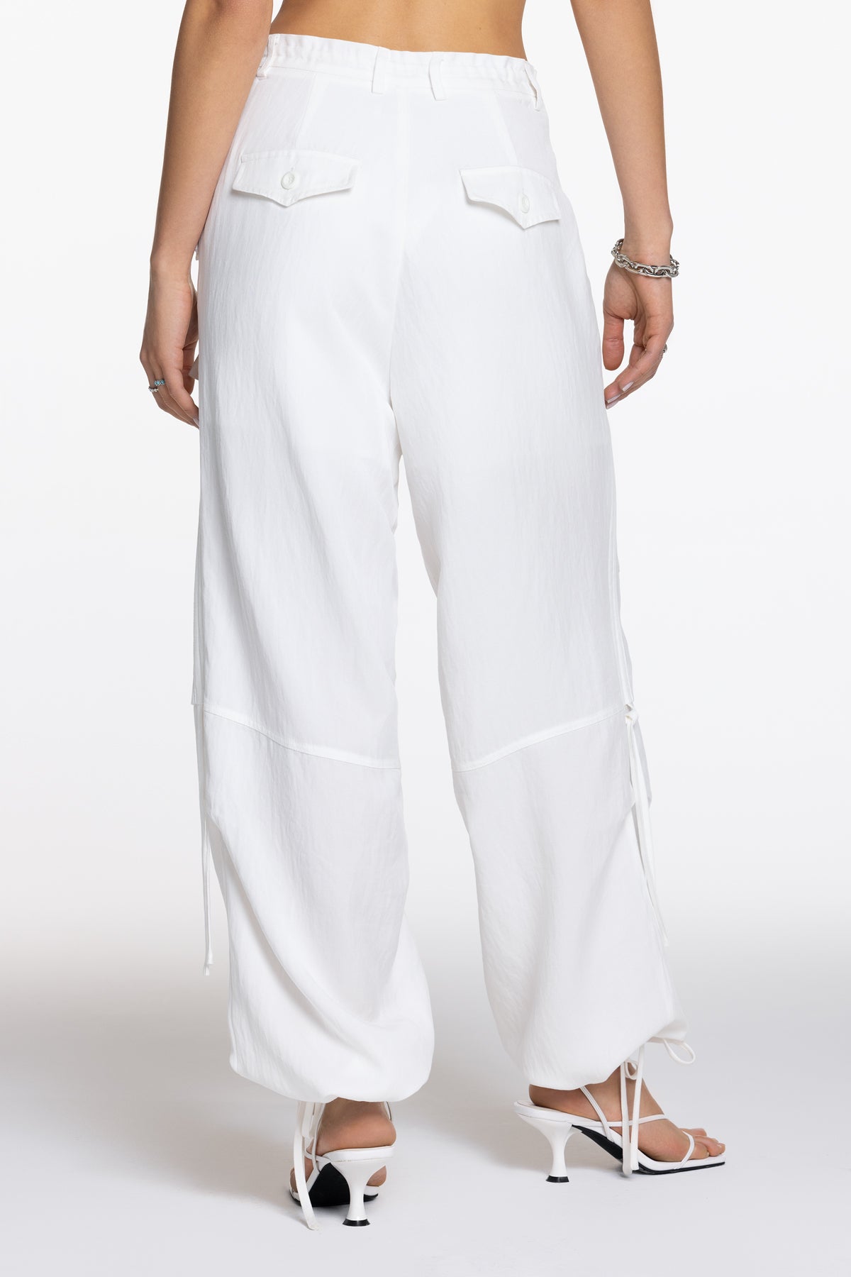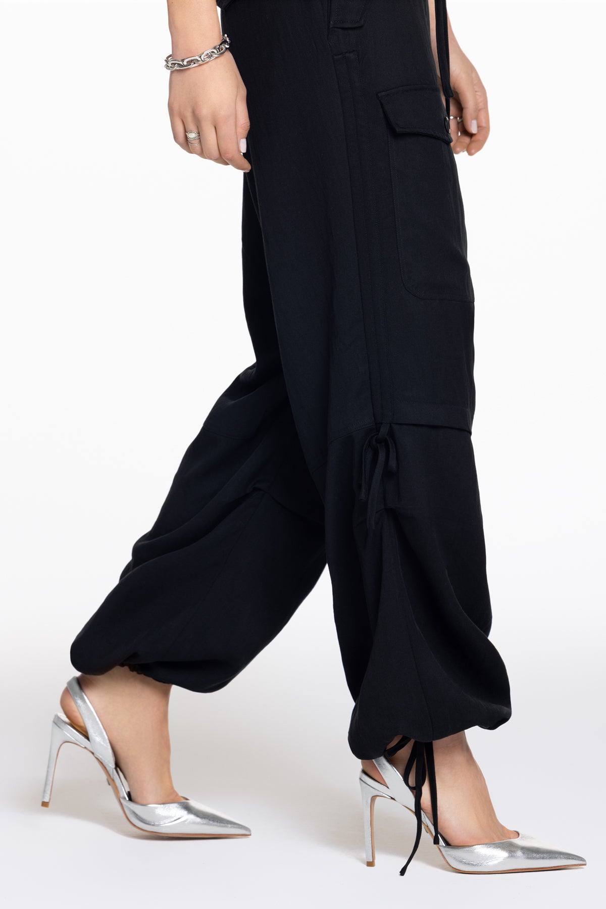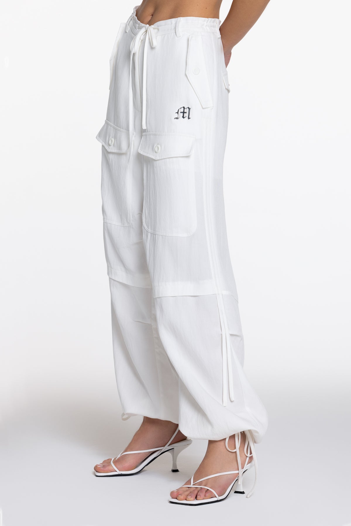 Light-weight cargo pants – Breathable crepe fabric texture – Embossed mini gothic Miss Me logo branding – Dual cargo pockets with button closures – Functional front pockets with flap closure – Faux back pockets – Adjustable drawstrings at waist, knees and hem Model is wearing size: S Model Measurements: Height: 5’9.5″ Bust: 34″ Waist: 24″ Hips: 35″ Fabric Content: Self: 65% Tencel, 30% Rayon, 5% Nylon; Lining: 100% Rayon Care: Gentle machine wash inside-out with like colors in cold water. Tumble dry low. Style No. BMP0003L-BLACK, BMP0003L-WHITE
