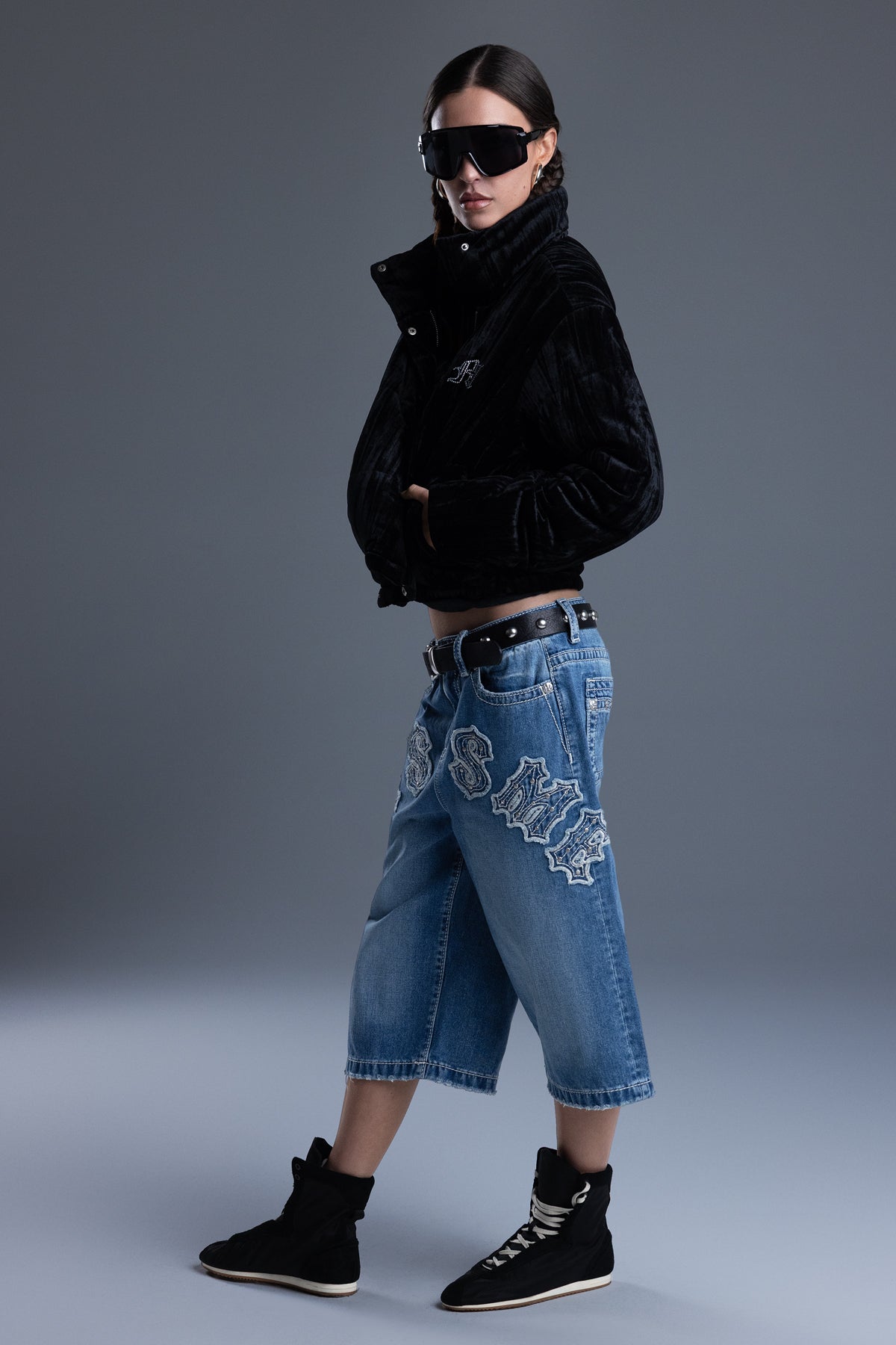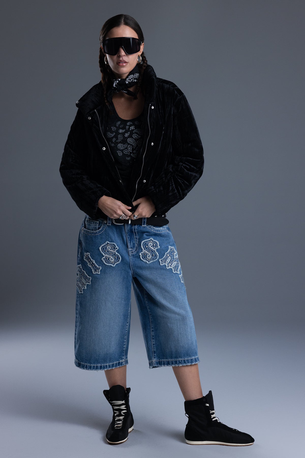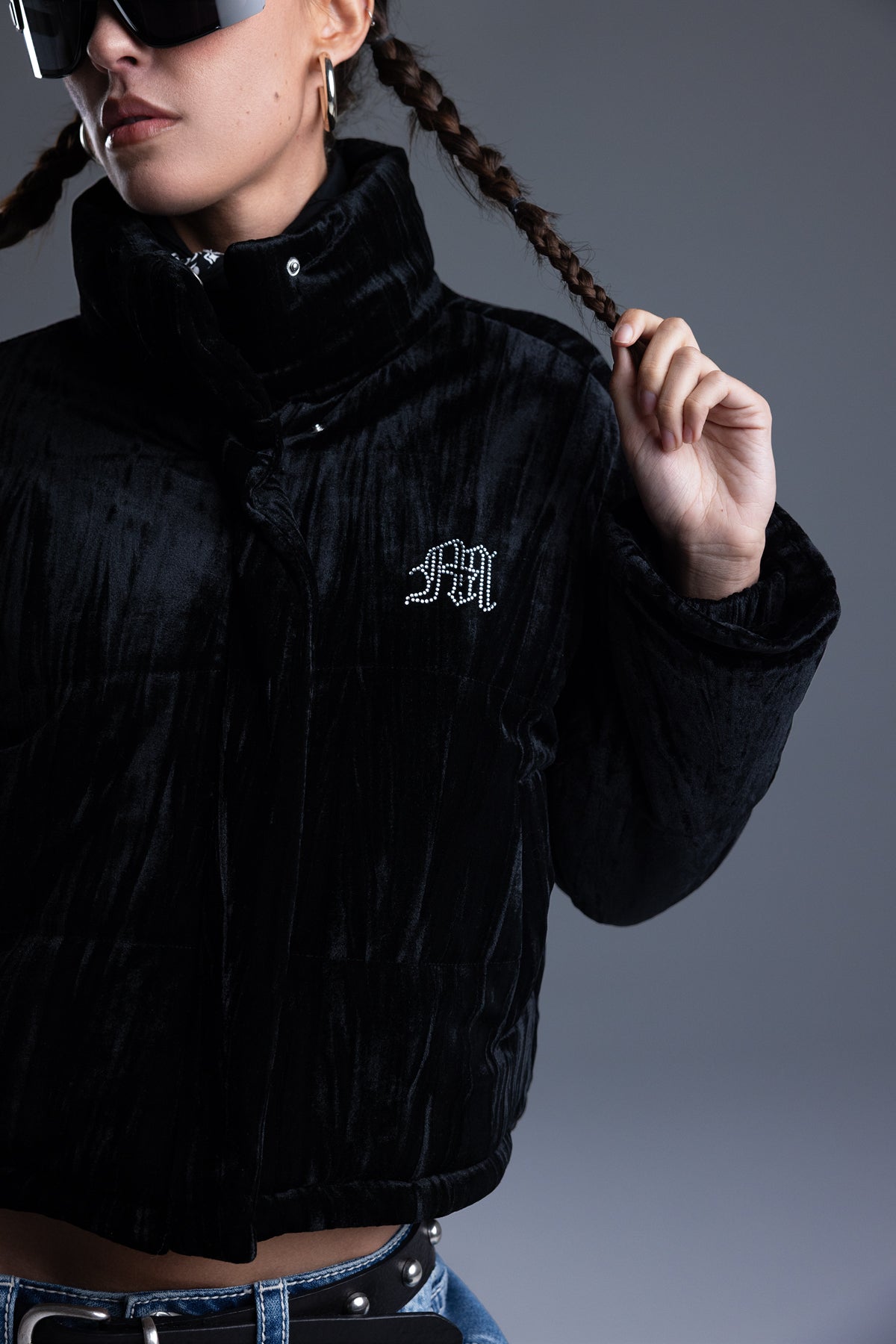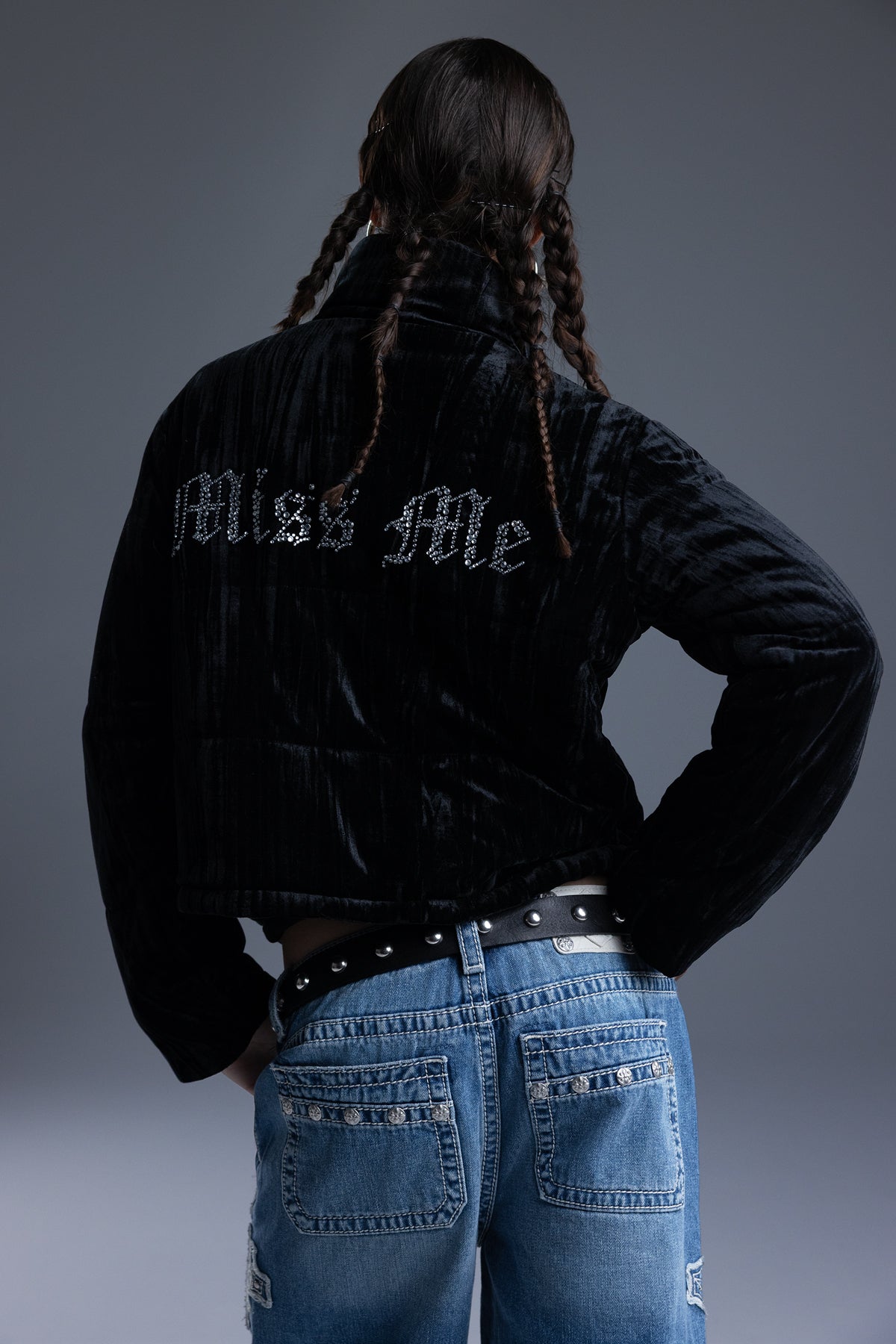 Fitted crushed velvet puffer jacket – Rhinestone-embellished Miss Me branding – Plush quilted construction – Logo zipper pull tab – Zip-front closure – Magnetic snap placket – Mock neckline Model is wearing size: 25 Model Measurements: Height: 5????Bust: 32A Waist: 24??Hips: 34??Fabric Content: Self: 95% Polyester, 5% Spandex / Lining: 100% Polyester Care: Gentle machine wash inside-out with like colors in cold water. Tumble dry low. Style No. BMJ0085L-A-BLACK