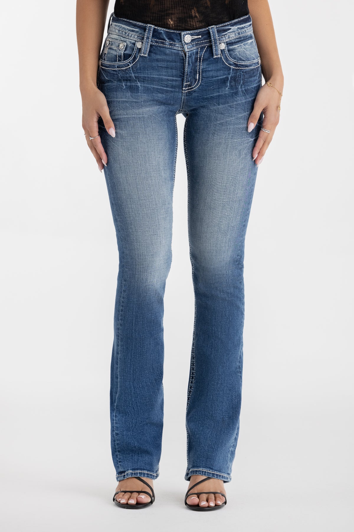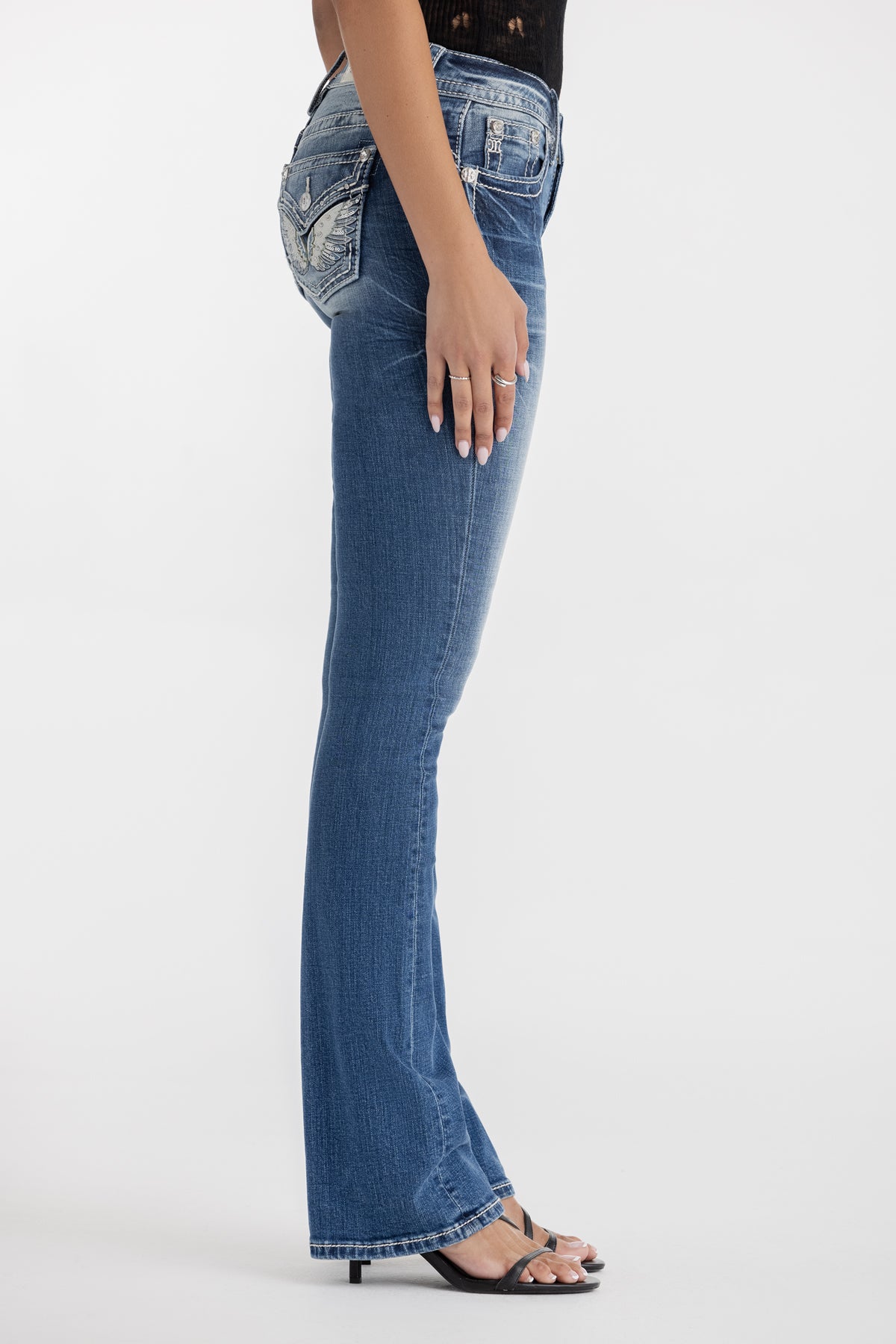 Washed, mid-rise bootcut jeans – Embroidered upward sweep wing design – Quilted leather appliqué accents – Sequins, studs, and rhinestone rivet accents – Embossed white leather cross Miss Me brand patch – Whiskering details – 5-pocket design Model is wearing size: 25 Model Measurements: Height: 5’9″ Bust: 34B Waist: 25″ Hips: 36″ Fabric Content: 99% Cotton, 1% Elastane Care: Gentle machine wash inside-out with like colors in cold water. Tumble dry low. Style No. M3080B75L-K1495, M3080B75V-K1495