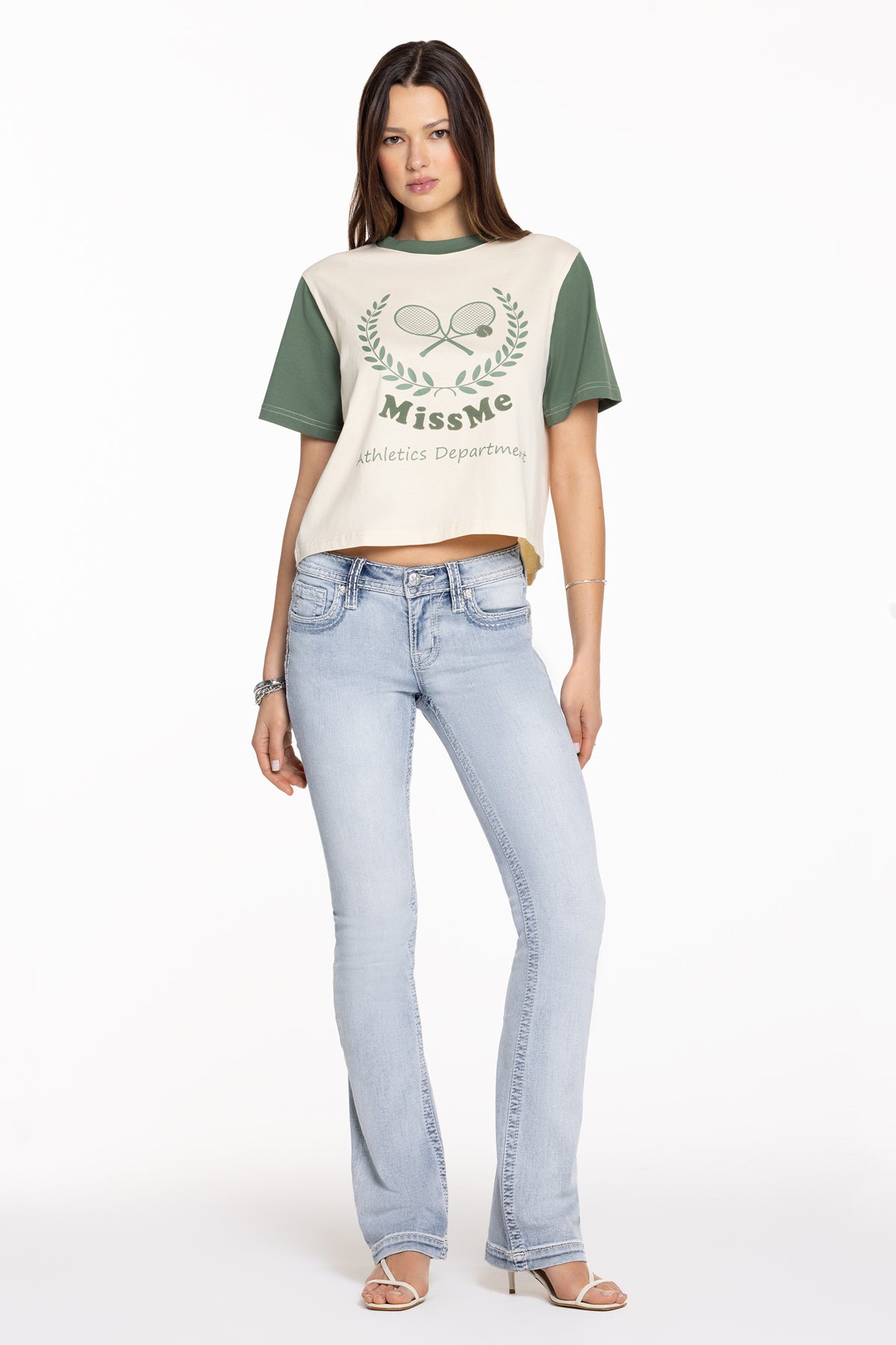 Cropped, graphic tee – Miss Me Athletics Department graphic design – Contrast sleeves and collar – Round neckline Model is wearing size: S Model Measurements: Height: 5’9.5″ Bust: 34″ Waist: 24″ Hips: 35″ Fabric Content: Self: 100% Cotton; Contrast: 100% Cotton Care: Gentle machine wash inside-out with like colors in cold water. Tumble dry low. Style No. BMT0020S-OLIVE GRN