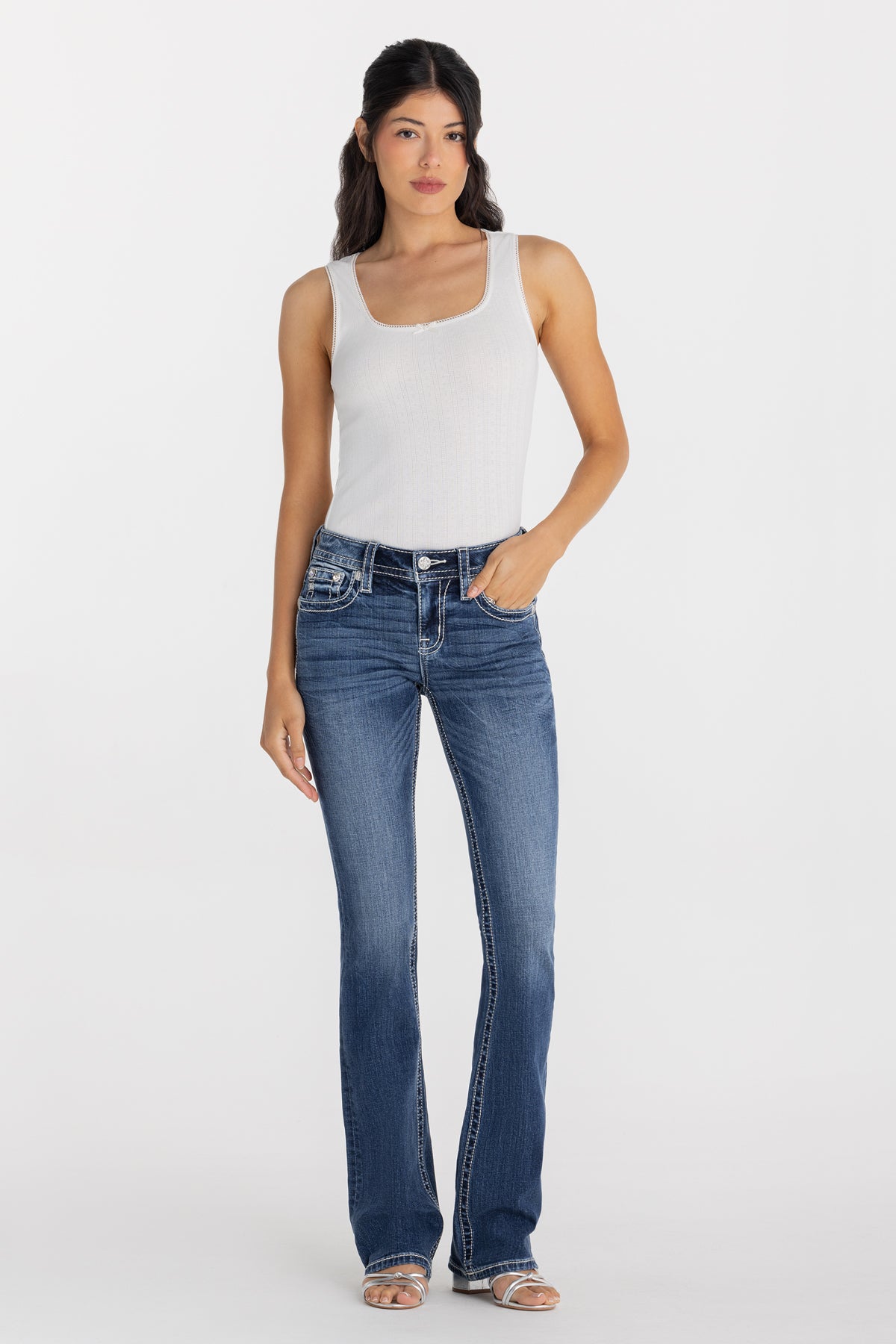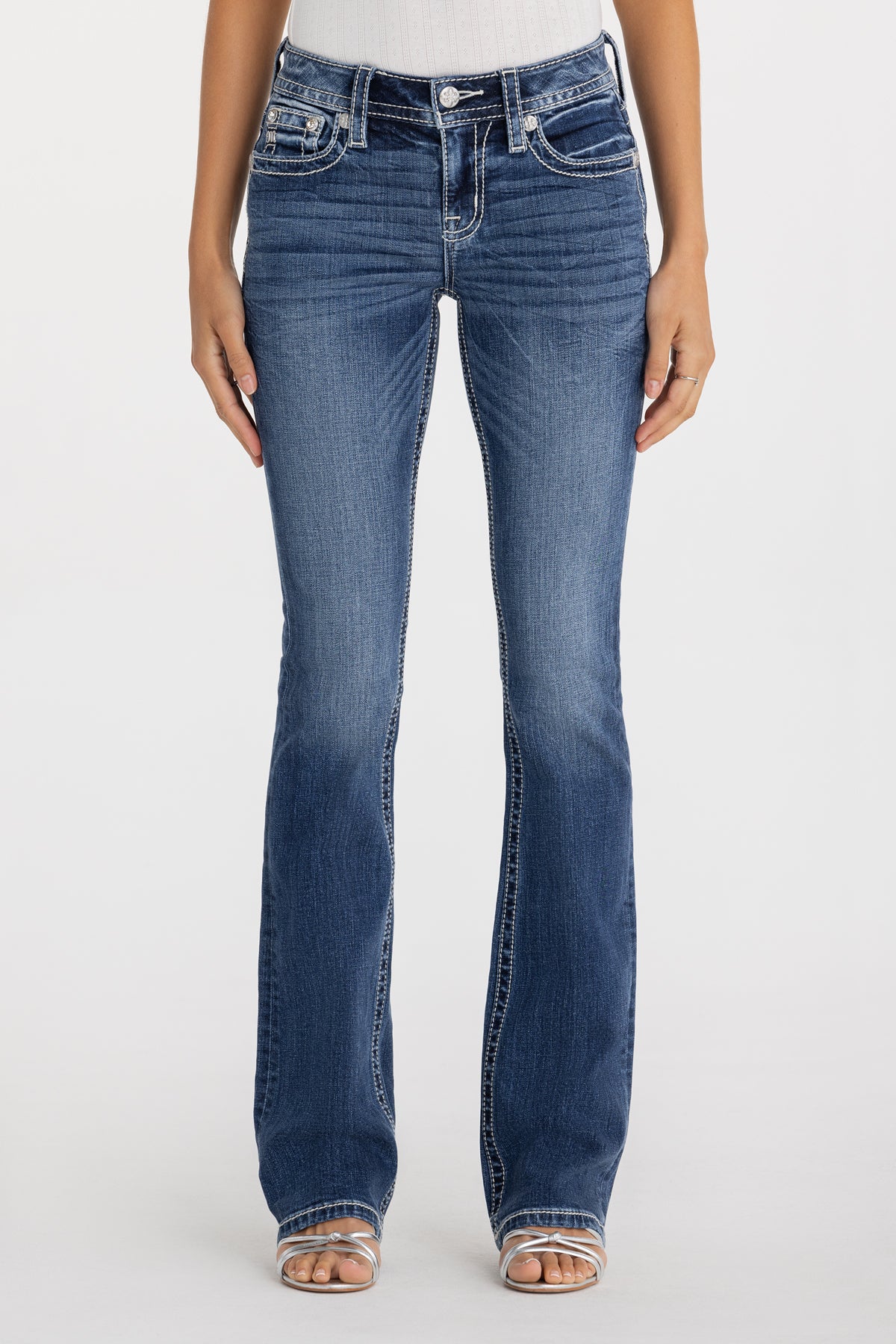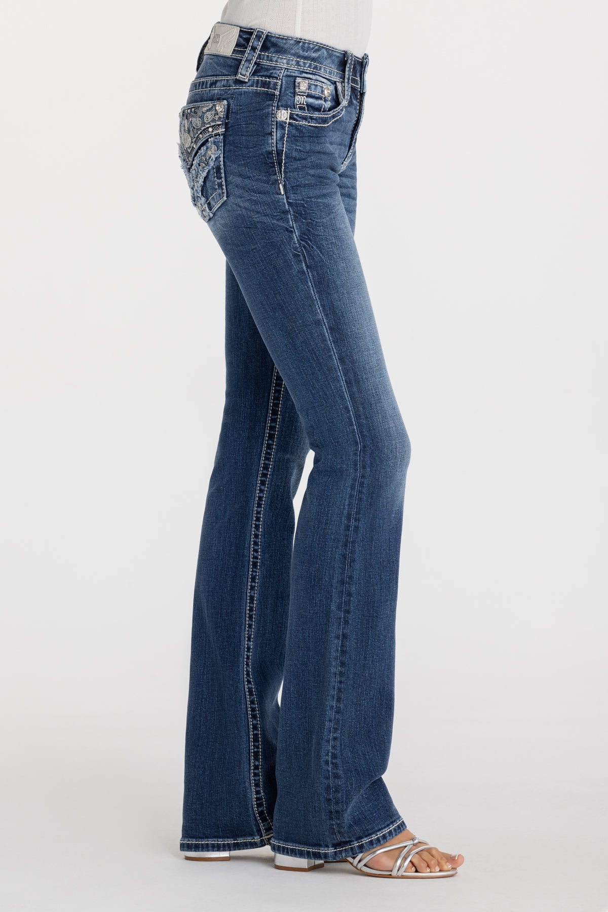 Washed, mid-rise bootcut jeans – Embroidered paisley scroll design – Heavily frayed cross-stitch embroidery with metallic mesh accents – Sequins, faux pearls, and rhinestone rivet embellishments – Embossed white leather wing Miss Me brand patch – Whiskering details – 5-pocket design Model is wearing size: 25 Model Measurements: Height: 5’8″ Bust: 32B Waist: 25″ Hips: 35″ Fabric Content: 99% Cotton, 1% Elastane Care: Gentle machine wash inside-out with like colors in cold water. Tumble dry low. Style No. M3444B146L-K1516, M3444B146S-K1516, M3444B145V-K1516
