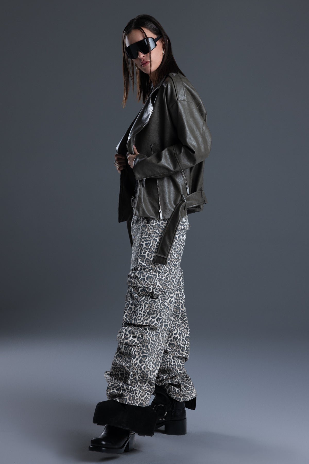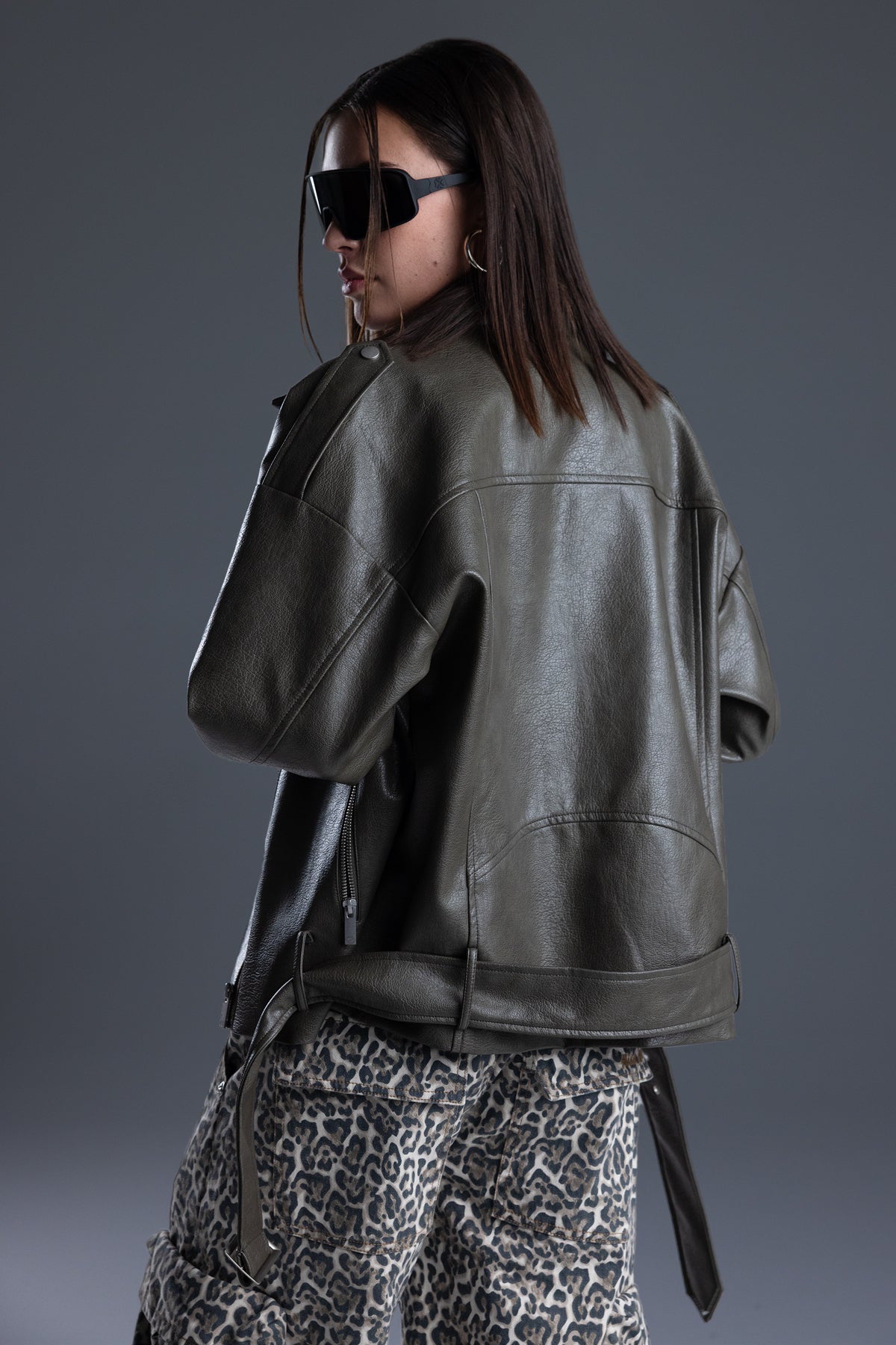 Oversized faux leather moto jacket – Snap-down lapel collar – Asymmetric front-zip design – Functional side zip pockets – Zippered sleeve vents – Paneled construction with adjustable belt – Smooth satin lining Model is wearing size: 25 Model Measurements: Height: 5????Bust: 32A Waist: 24??Hips: 34??Fabric Content: Self/Faux: 55% Cotton, 45% Pu / Lining: 100% Polyester Care: Gentle machine wash inside-out with like colors in cold water. Tumble dry low. Style No. BMJ0806L-GREEN