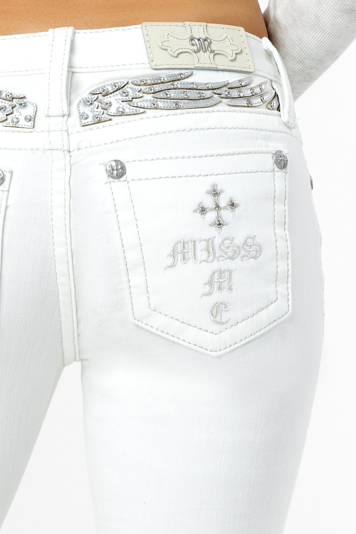 Low-rise bootcut jeans – Embroidered Miss Me and cross logo on classic back pocket – Rhinestone leather appliqué winged yoke design – Embossed white leather cross Miss Me brand patch – 5-pocket design Style No. L9469B2L-W01, L9469B2V-W01, L9469B2S-W01