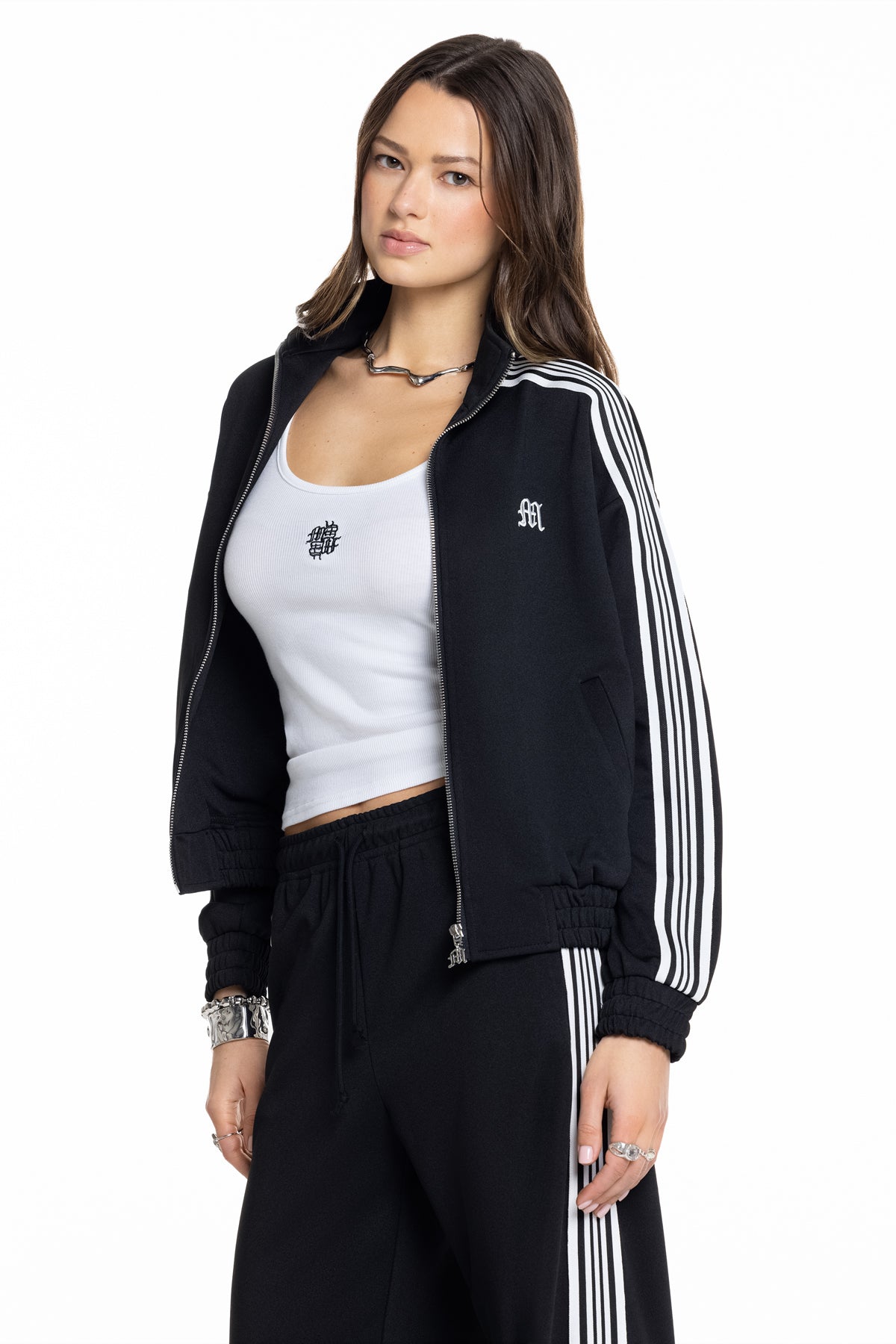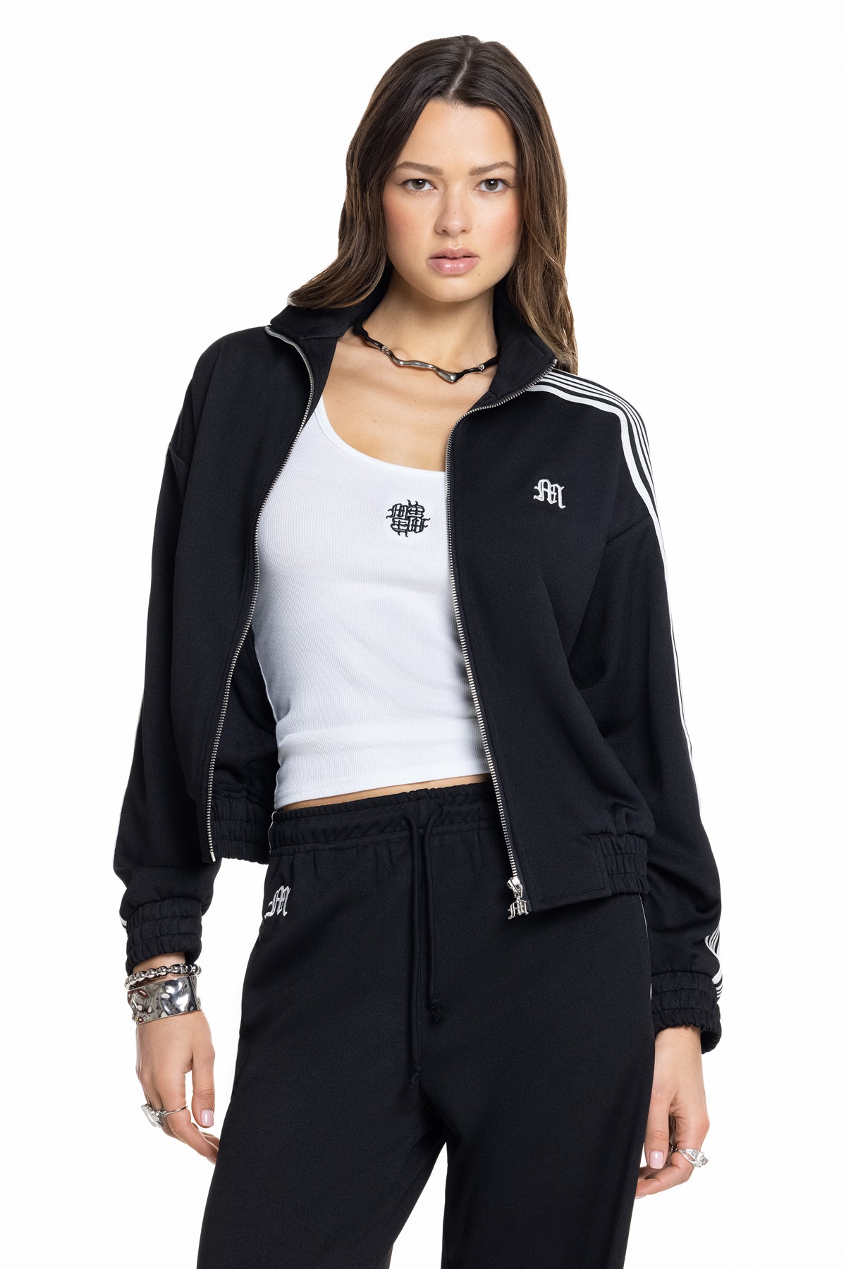 Long-sleeve track jacket – Contrast stripe sleeves – Gothic Miss Me branding – High-neck collar – Ribbed cuffs and hem – Zip-up front with logo pull tab Model is wearing size: S Model Measurements: Model is wearing size: S Black Model Measurements: Height: 5??.5??Bust: 34??Waist: 24??Hips:35 Model is wearing size: S White Model Measurements: Height: 5????Bust: 32A Waist: 24??Hips: 34??Fabric Content: Self: 100% Polyester; Trim: 100% Polyester Care: Gentle machine wash inside-out with like colors in cold water. Tumble dry low. Style No. MJ0780L-WHITE, MJ0780L-BLACK