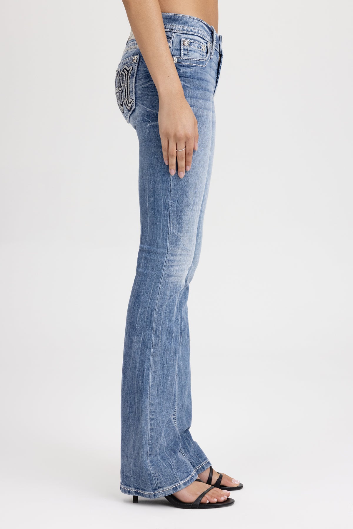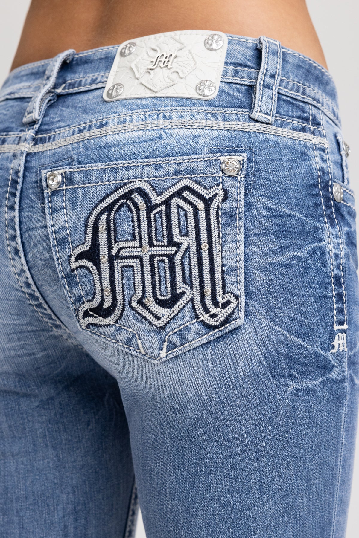 Washed, mid-rise bootcut jeans – Embroidered gothic “M” logo design – Mini contrast arrowhead stitch detailing – Rhinestone rivet accents – Embossed white studded leather cross Miss Me brand patch – Whiskering details – 5-pocket design Style No. Medium Wash: M9552BL-L350, M9552BS-L350, M9552BV-L350