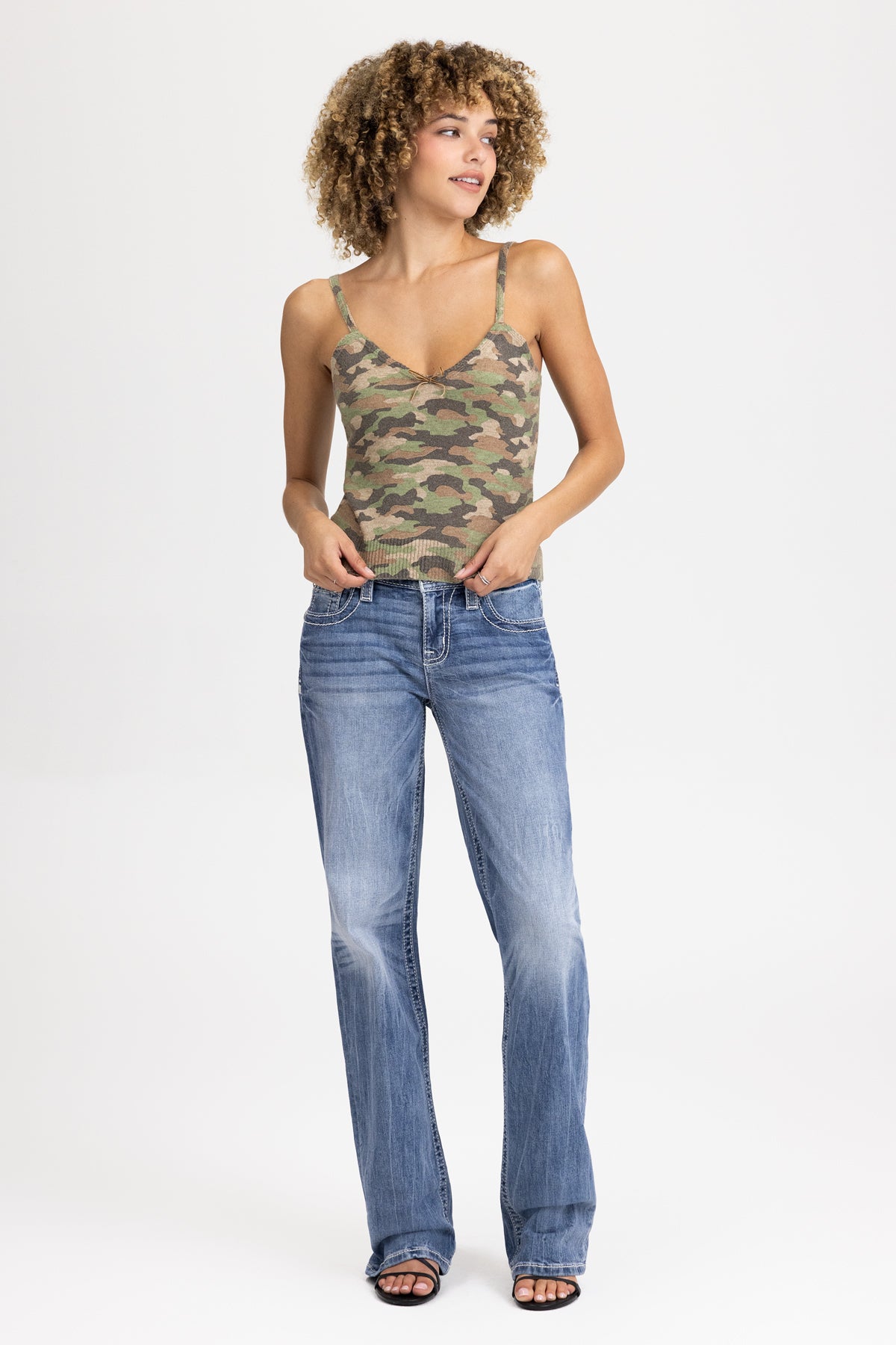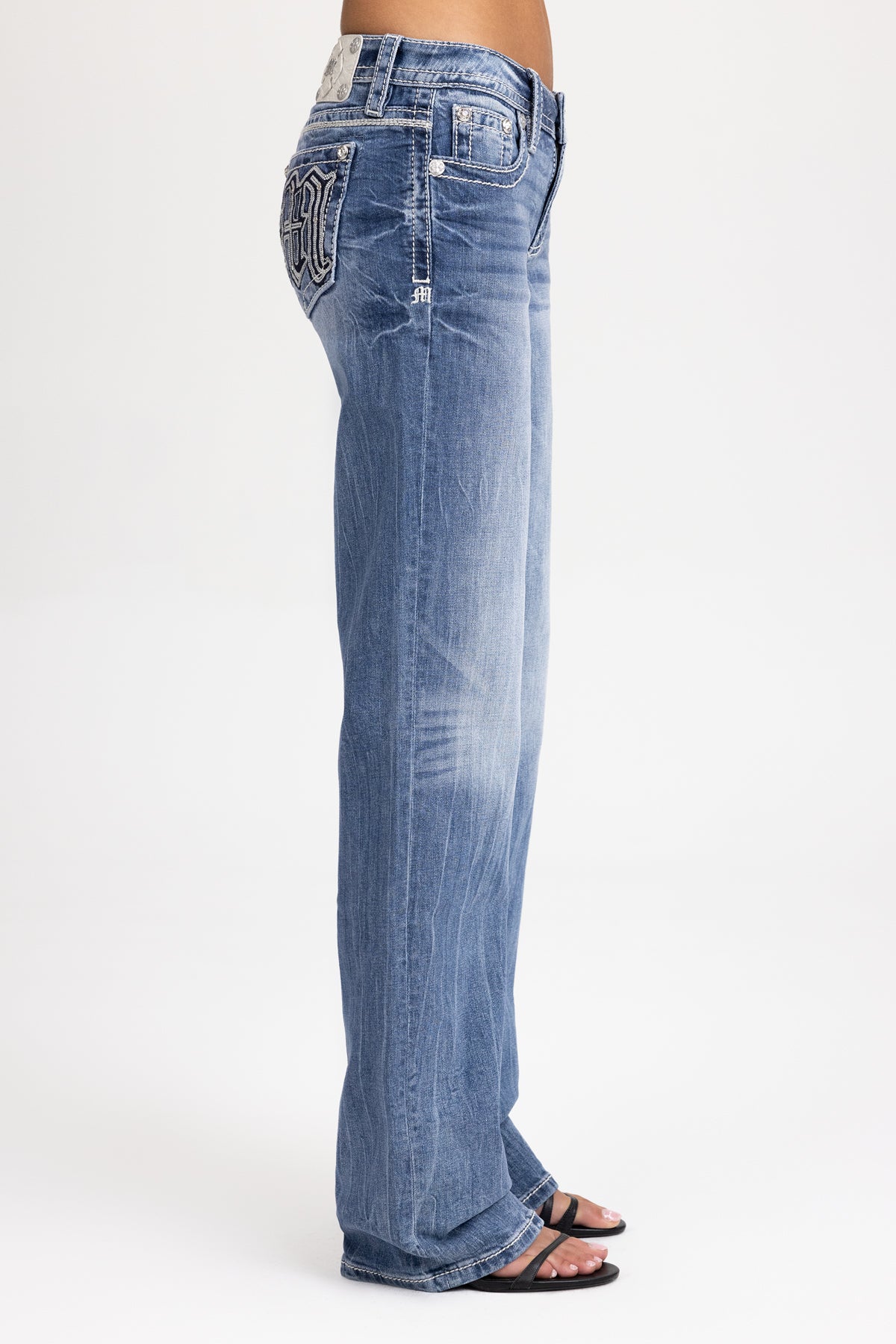 Washed, mid-rise slim-wide jeans – Embroidered gothic “M” logo design – Mini contrast arrowhead stitch detailing – Rhinestone rivet accents – Embossed white studded leather cross Miss Me brand patch – Whiskering details – 5-pocket design Model is wearing size: 25 Model Measurements: Height: 5????Bust: 32B Waist: 25??Hips: 34??Fabric Content: 99% Cotton, 1% Elastane Care: Gentle machine wash inside-out with like colors in cold water. Tumble dry low. Style No. Medium Wash: M9552SWL-L350, M9552SWS-L350, M9552SWV-L350