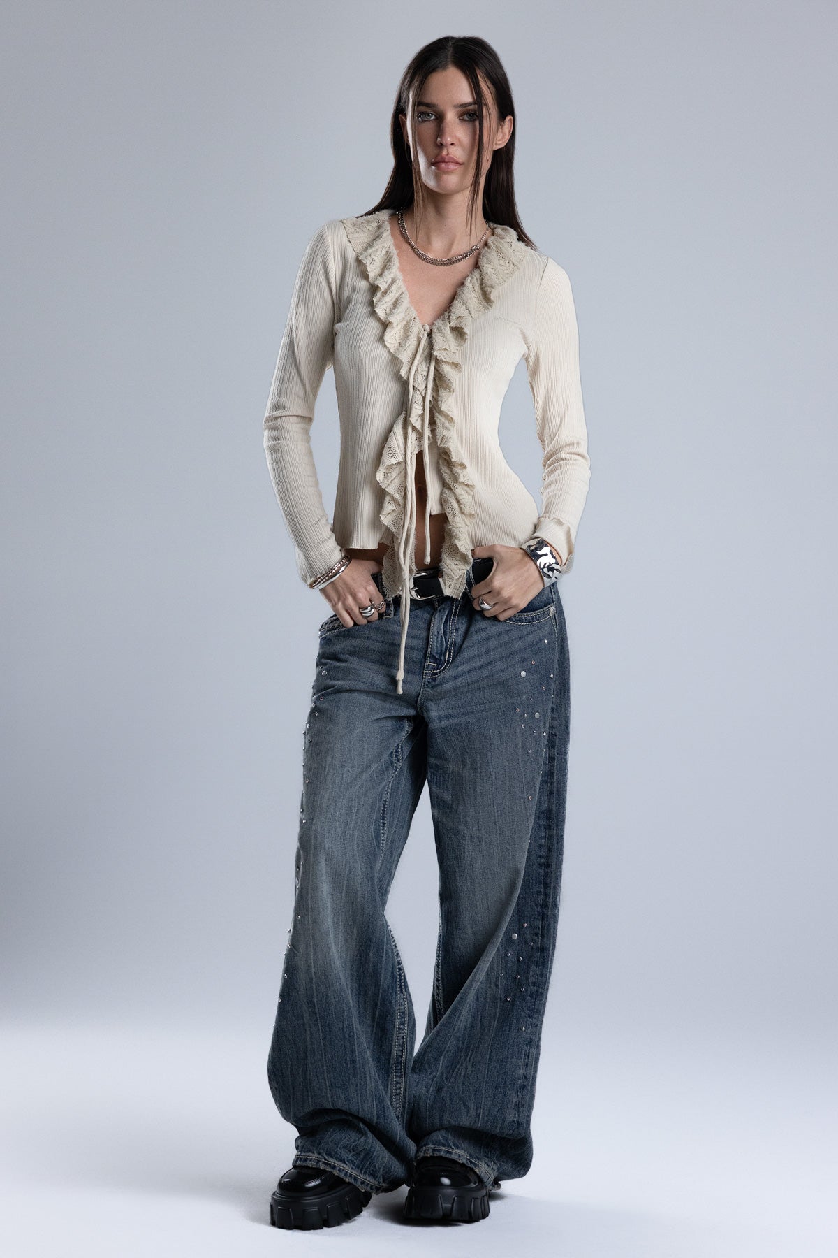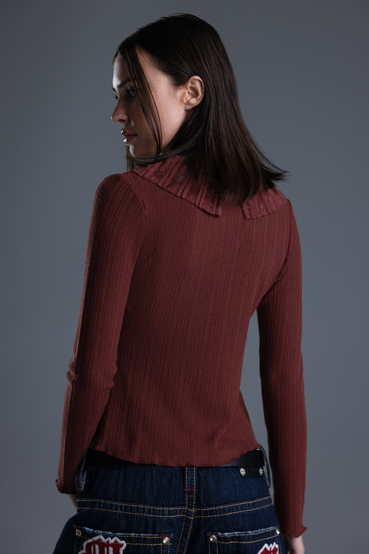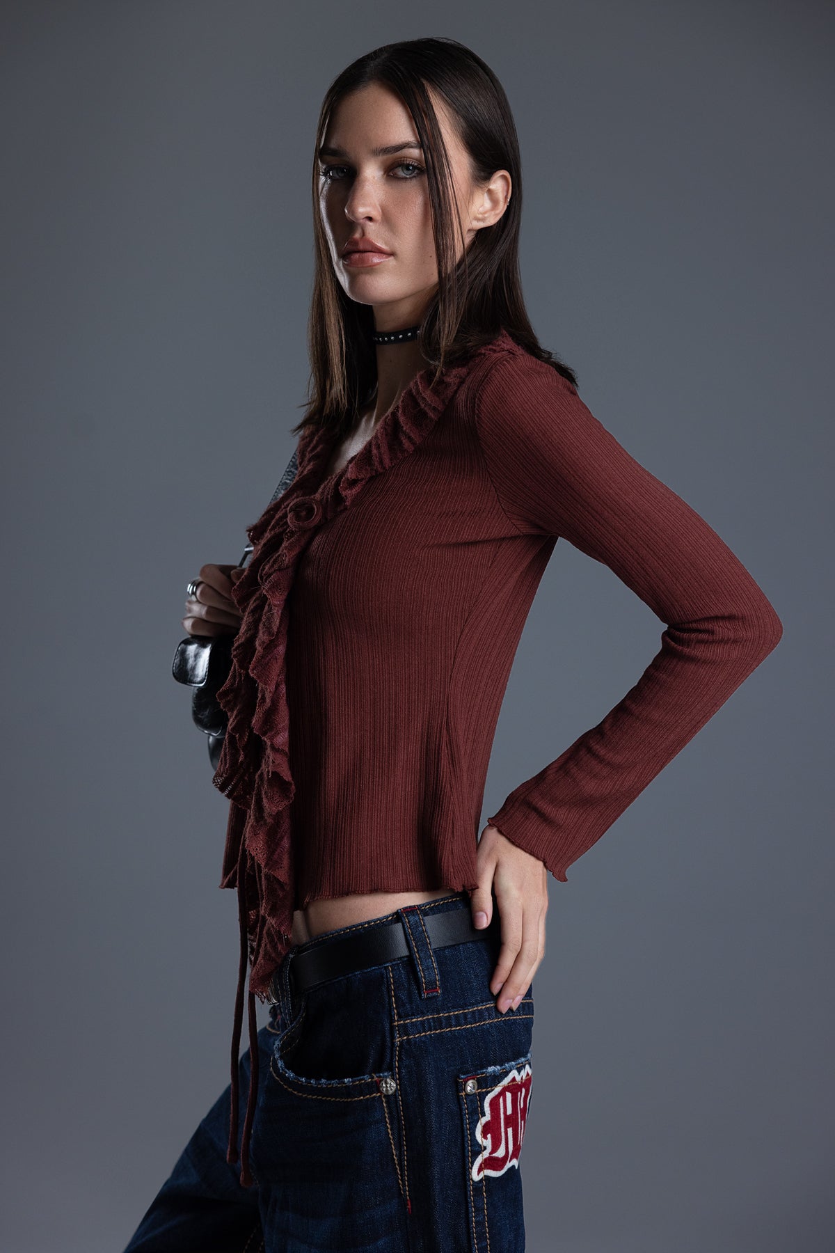 Ribbed long sleeve ruffle top – Pointelle lace trim – Layered ruffle accents – Knit hoop-and-latch button closure – Dual tie-front bow detailing – Soft V-neckline Style No. MT3235L-BEIGE, MT3235L-RUSSET RED
