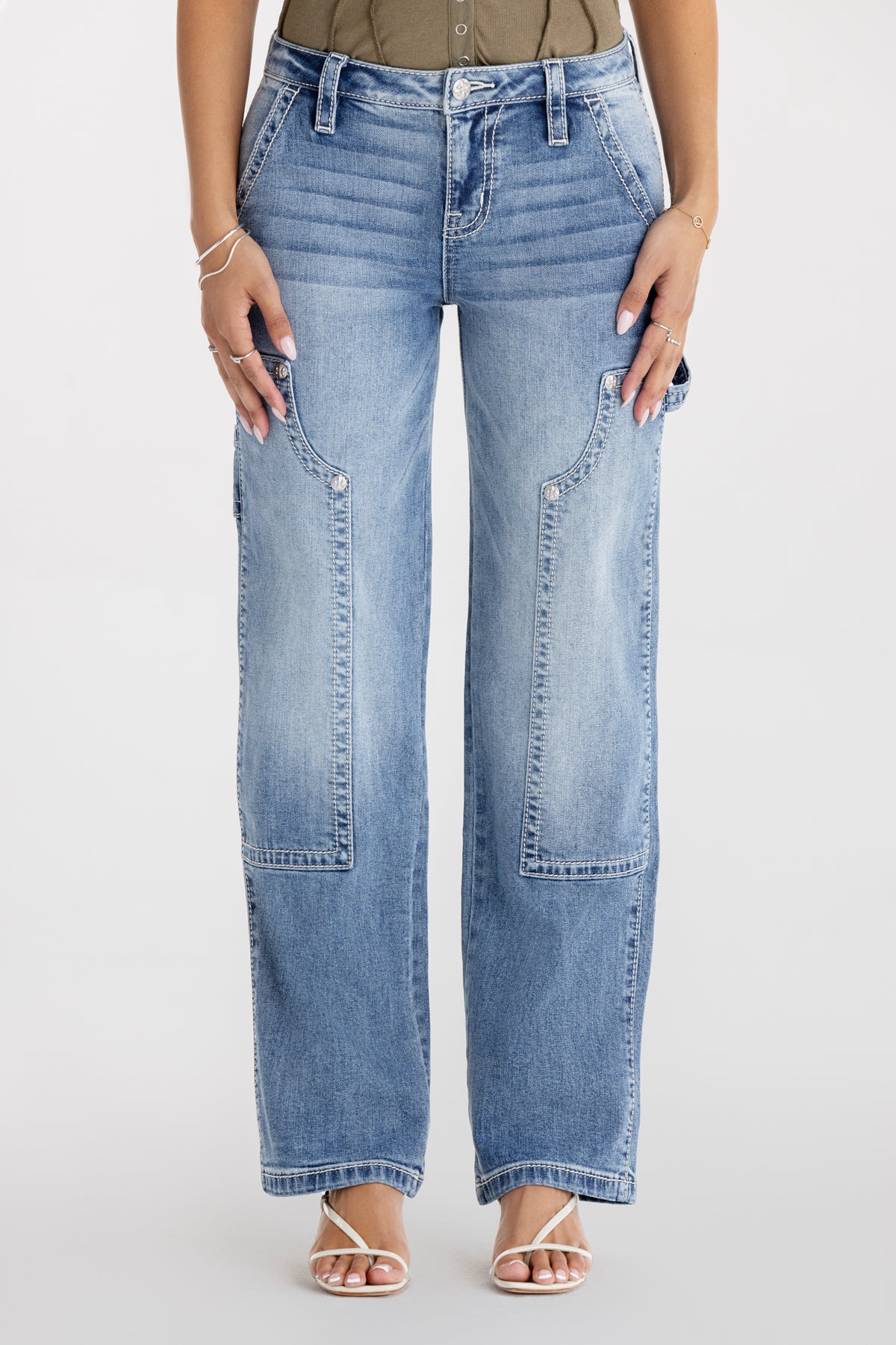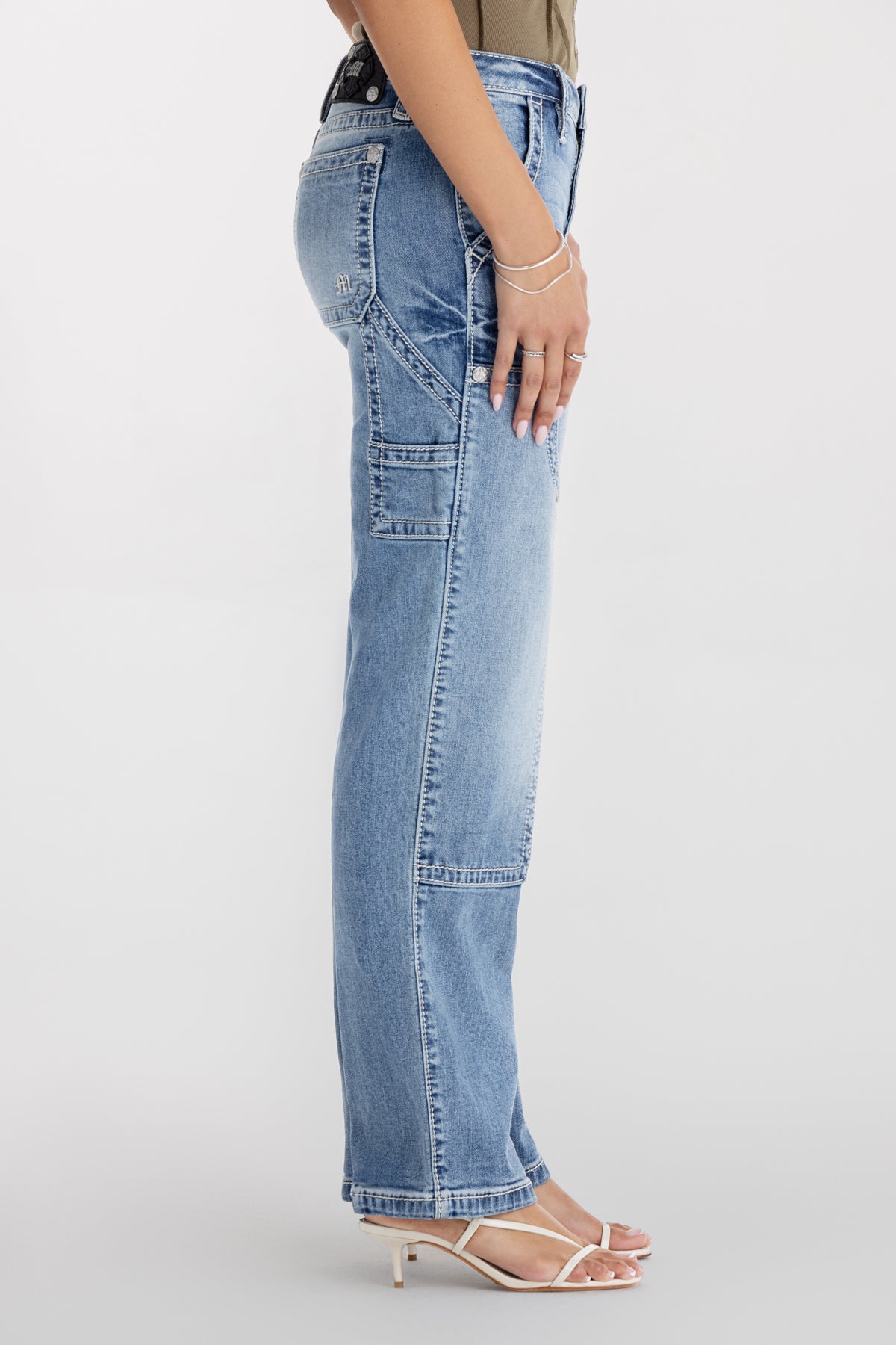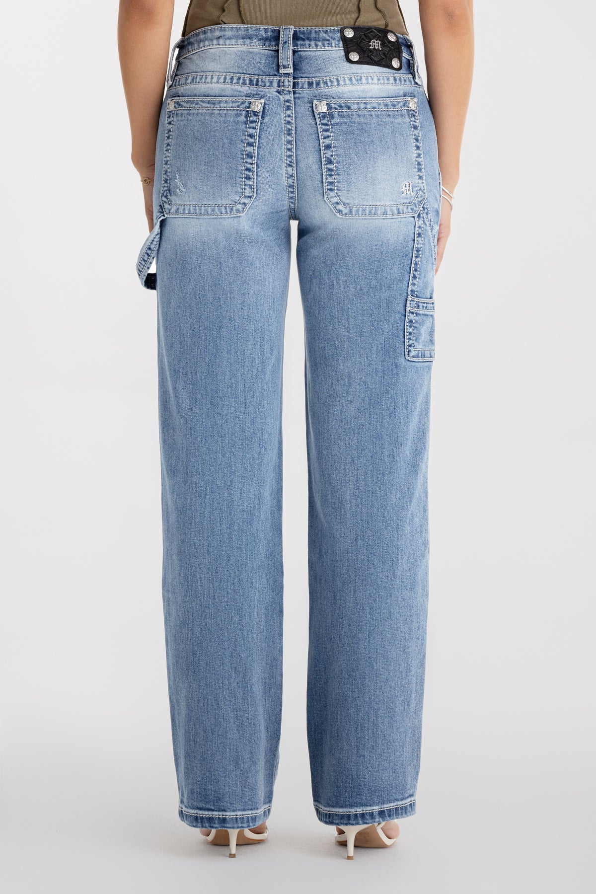 Washed, mid-rise slim-wide cargo jeans – Embroidered mini Gothic Miss Me logo – Layered cargo pocket design – Utility loop and paneled seaming details – Whiskering details with light distress – 5-pocket design Model is wearing size: 25 Model Measurements: Height: 5’9″ Bust: 34B Waist: 25″ Hips: 36″ Fabric Content: 99% Cotton, 1% Elastane Care: Gentle machine wash inside-out with like colors in cold water. Tumble dry low. Style No. M2380SWS-M1062, M2380SWV-M1062