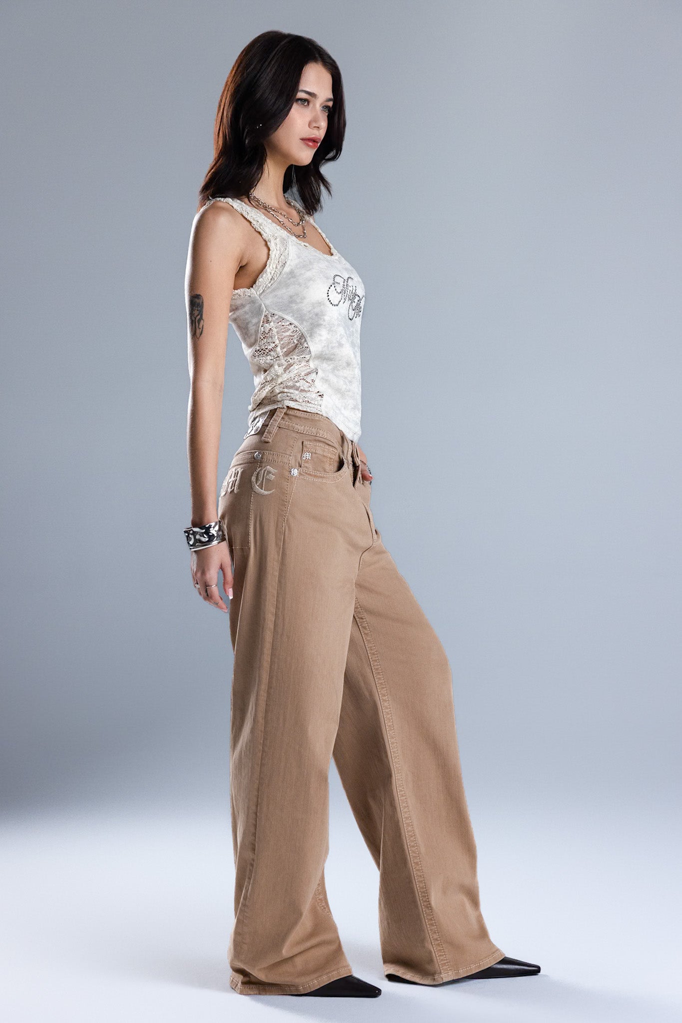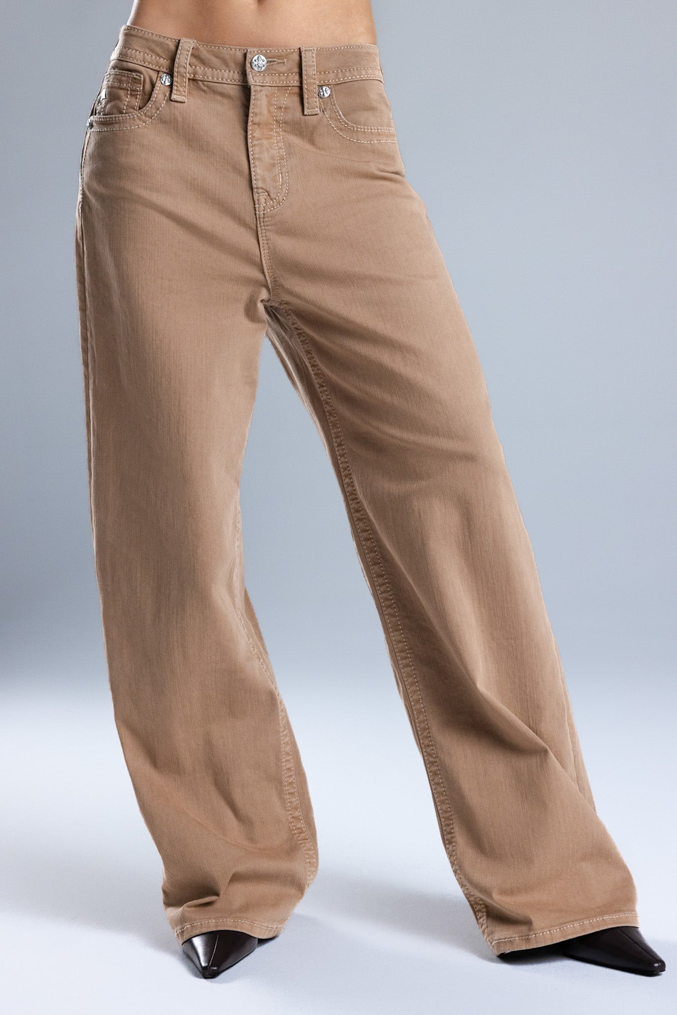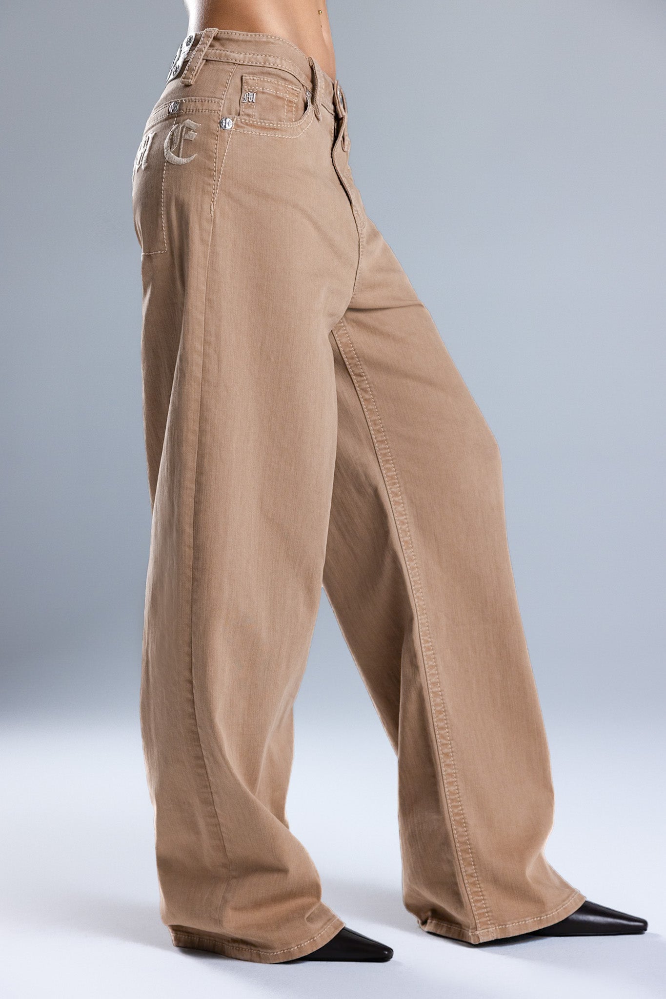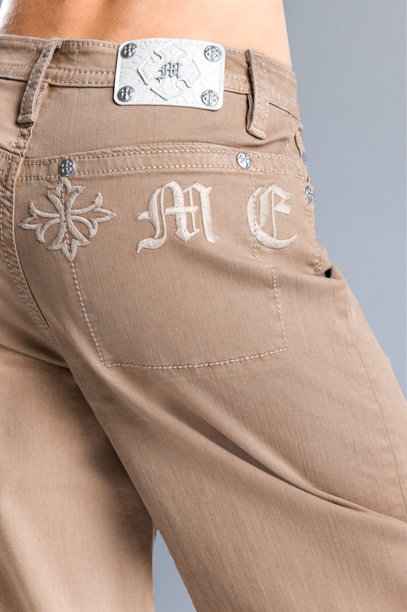 Low to mid-rise baggy wide khakis – Embroidered gothic Miss Me script design – Structured square back pocket construction – Embossed white studded leather cross Miss Me brand patch – 5-pocket design Style No. 2391BW2S-TAN, 2391BW2V-TAN