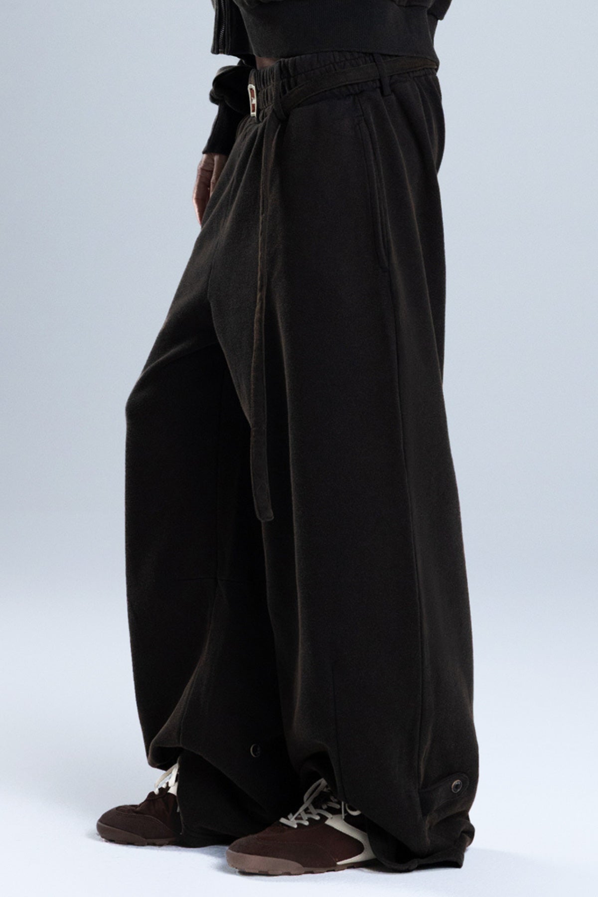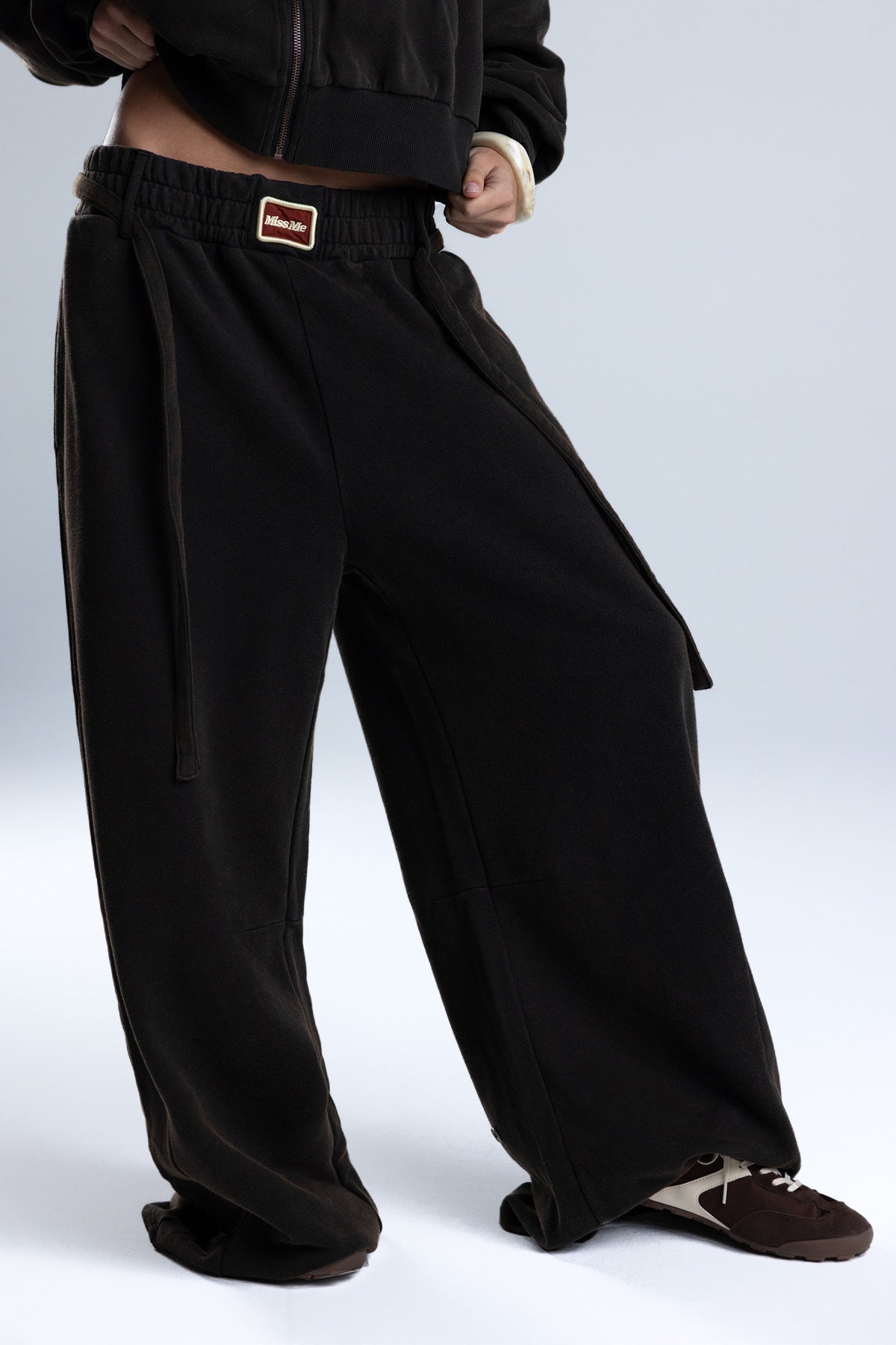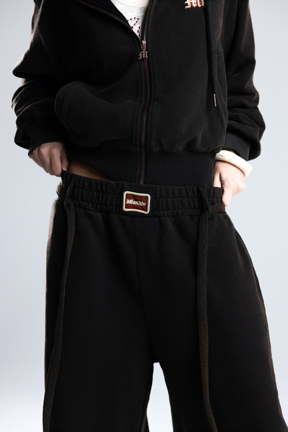 Relaxed fit wide-leg sweatpants – Embroidered gothic Miss Me graphic detailing – Framed branded waist patch accent – Cinched waistband – Exterior drawstring belt – Button-adjustable pant legs – 3-pocket design Style No. BMP0021L-B-CHRC BLK