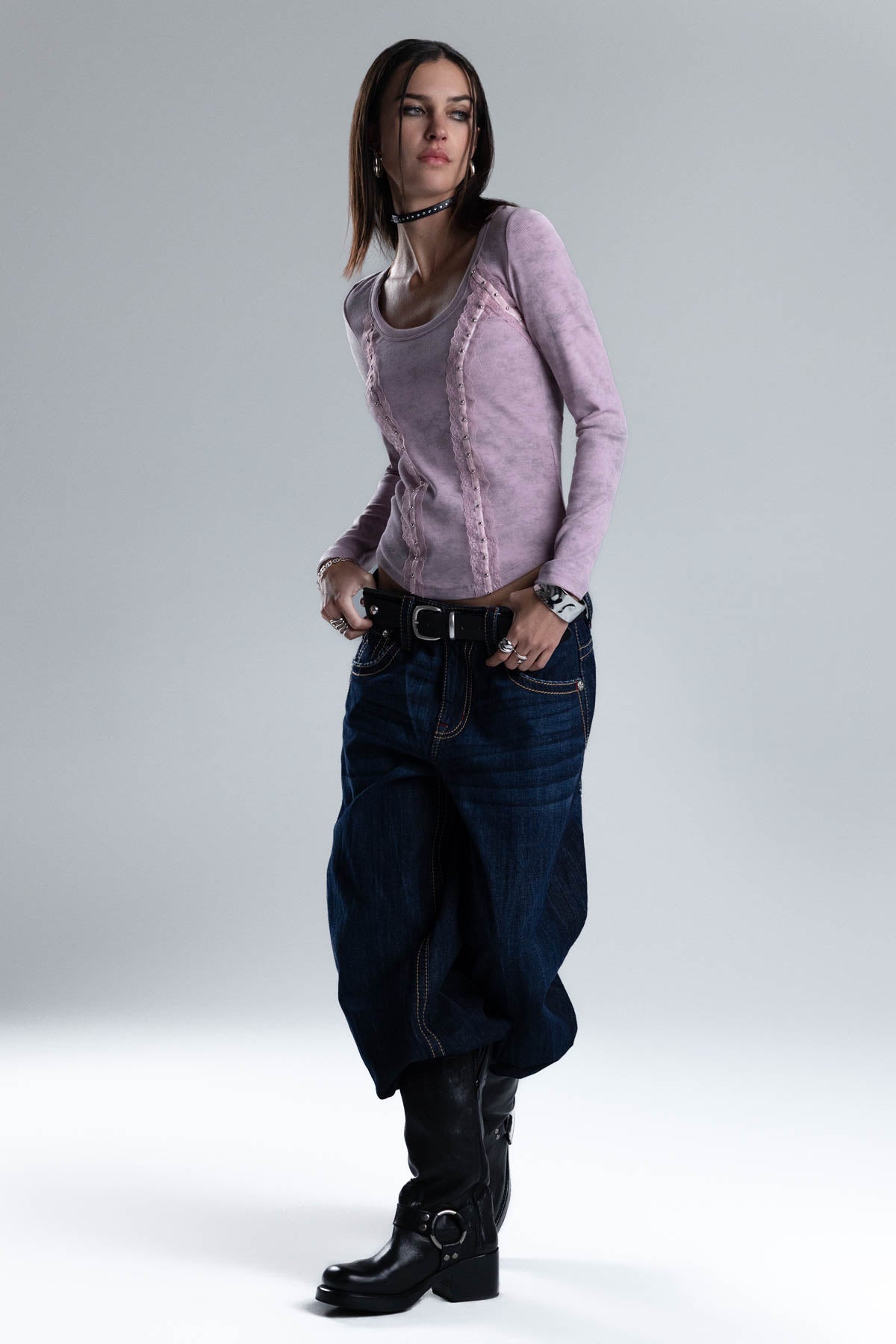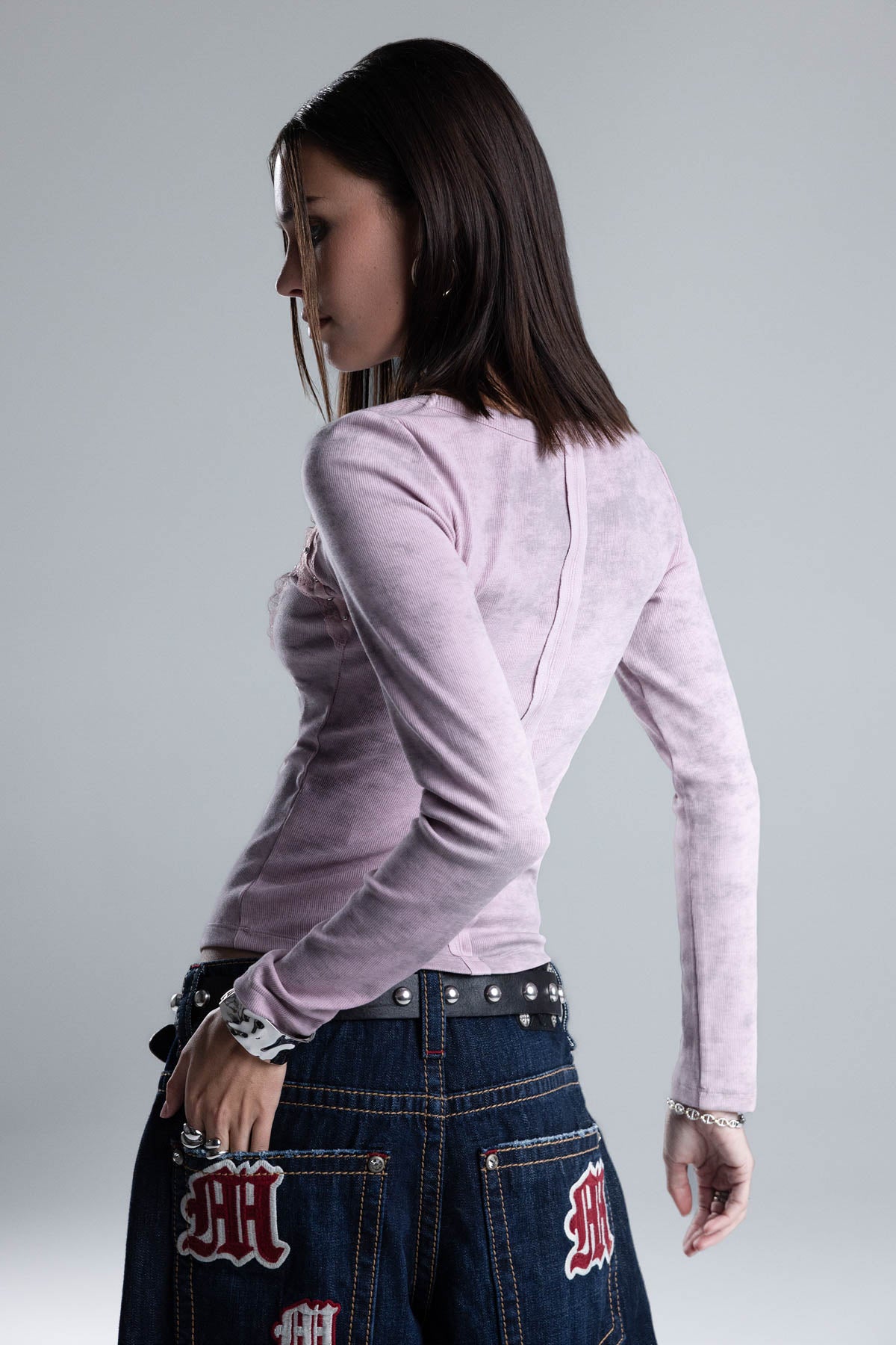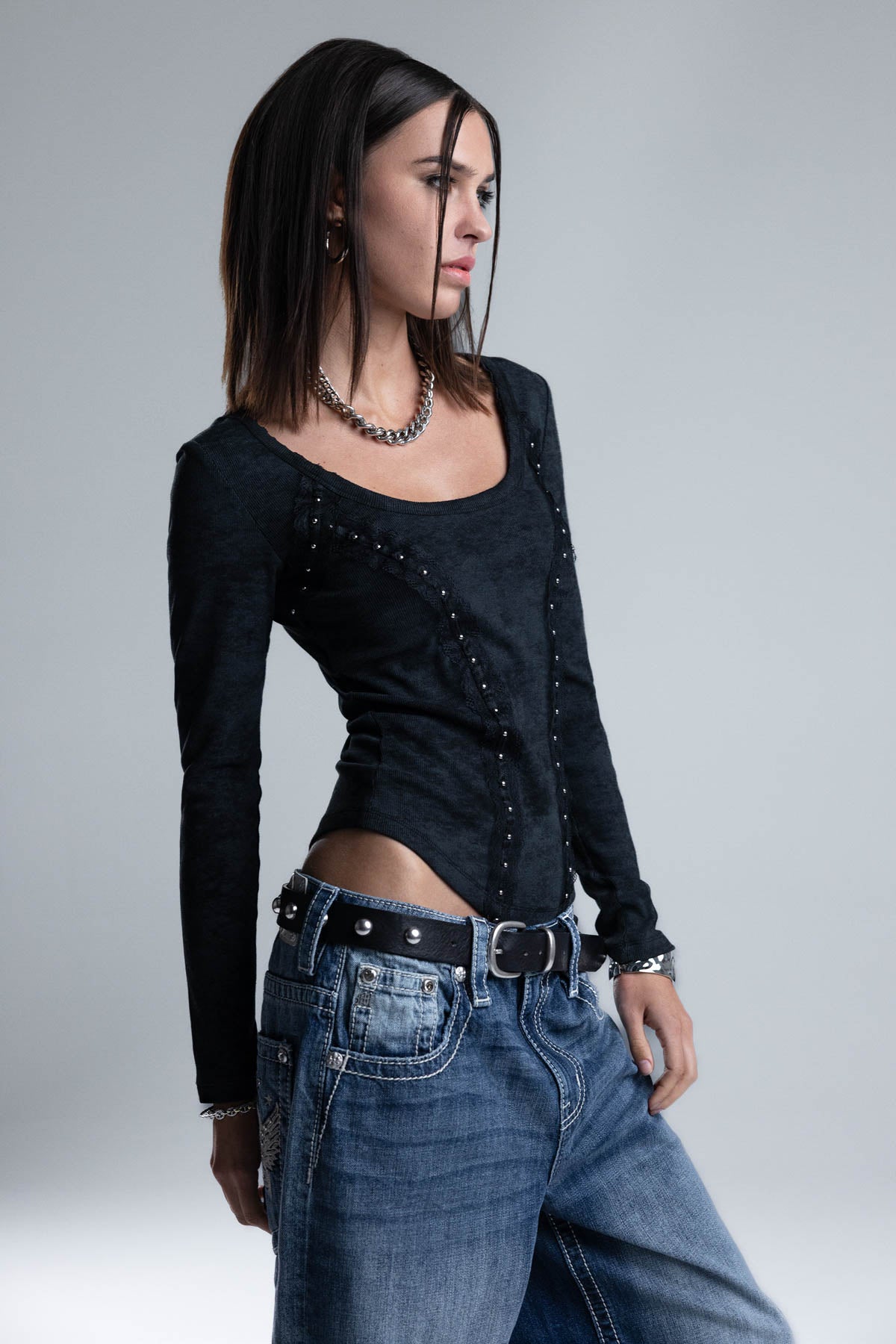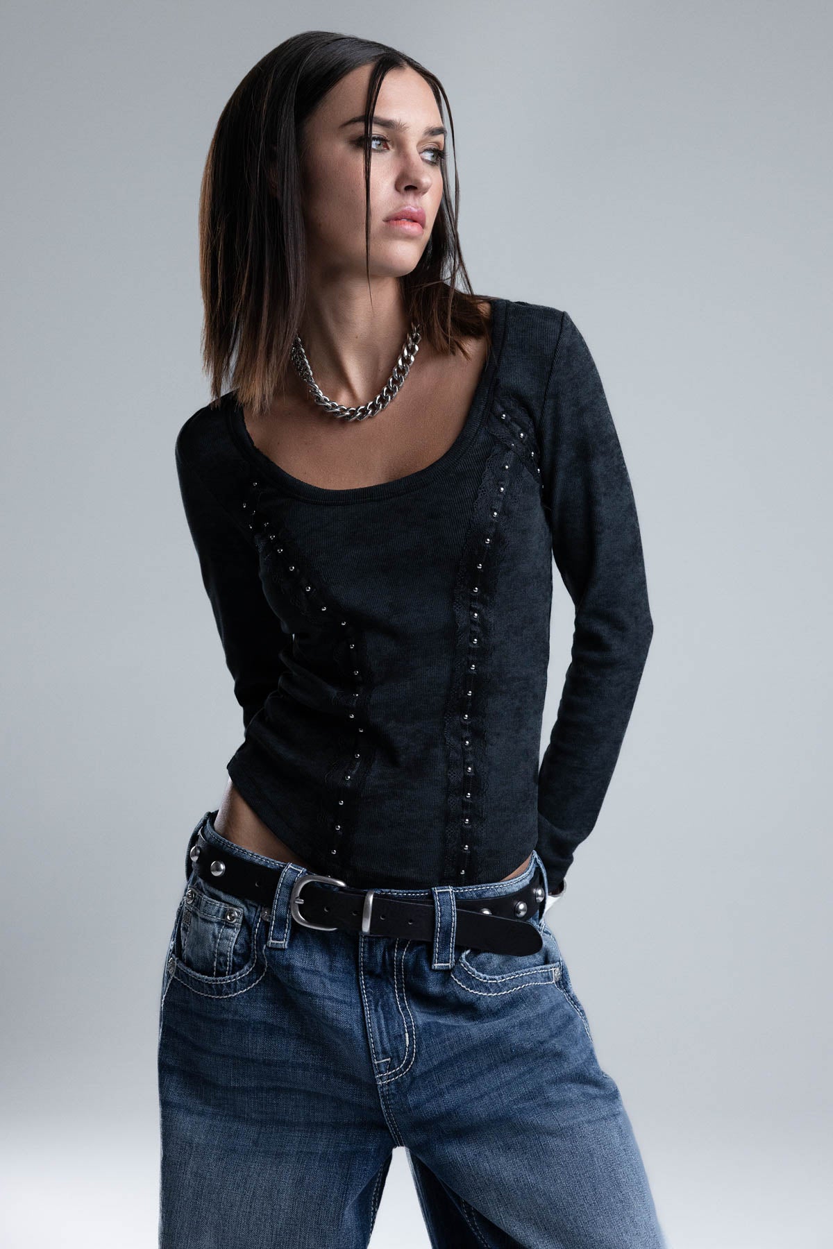 Fitted, acid-washed long-sleeve top – Soft ribbed knit construction – Tonal lace trim detailing – Silver-tone dome stud accents – Curved hem – Wide scoop neckline Style No. BMT0092L-CHRC BLK, BMT0092L-PINK