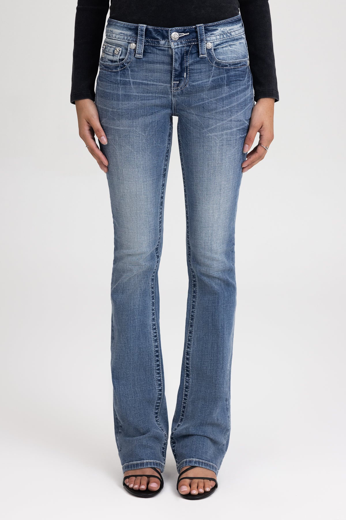 Washed, mid-rise bootcut jeans – Embroidered winged cross design – Leather appliqué overlay with ornate filigree stitching – Studs and rhinestone rivet accents – Embossed white studded leather cross Miss Me brand patch – Whiskering details – 5-pocket design Style No. M9534BL-M1074, M9534BS-M1074, M9534BV-M1074