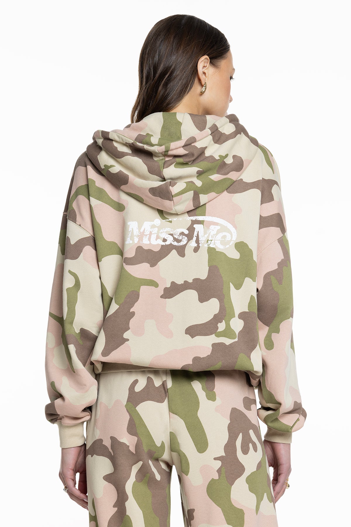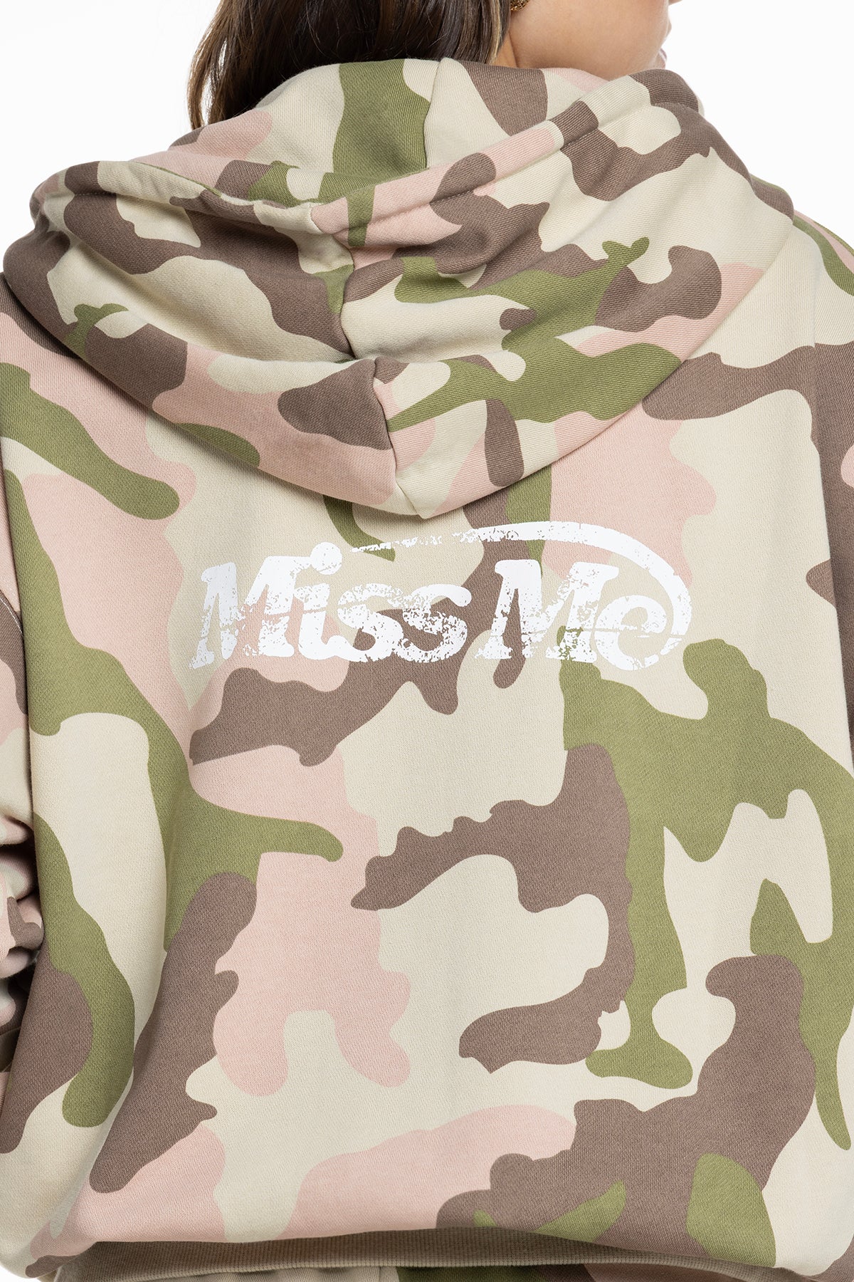 Oversized zip-up hoodie – Printed ’01 graphic design – Vintage-inspired Miss Me branding – Ribbed bottom hem and sleeve cuffs – Adjustable drawstring Model is wearing size: S Model Measurements: Height: 5??.5??Bust: 34??Waist: 24??Hips: 35??Fabric Content: Self: 51.2% Cotton, 48.8% Polyester; Contrast: 92.9% Cotton, 7.1% Spandex; Trim: 100% Cotton Care: Gentle machine wash inside-out with like colors in cold water. Tumble dry low. Style No. BMJ0027L-CAMO PINK