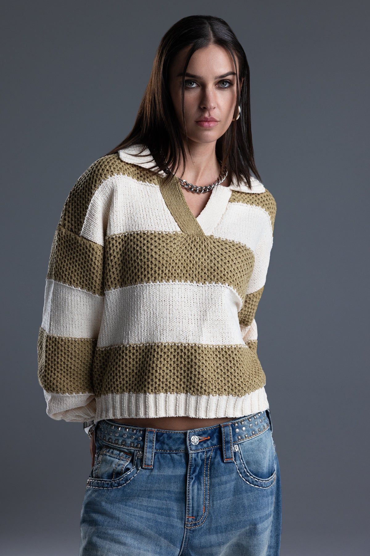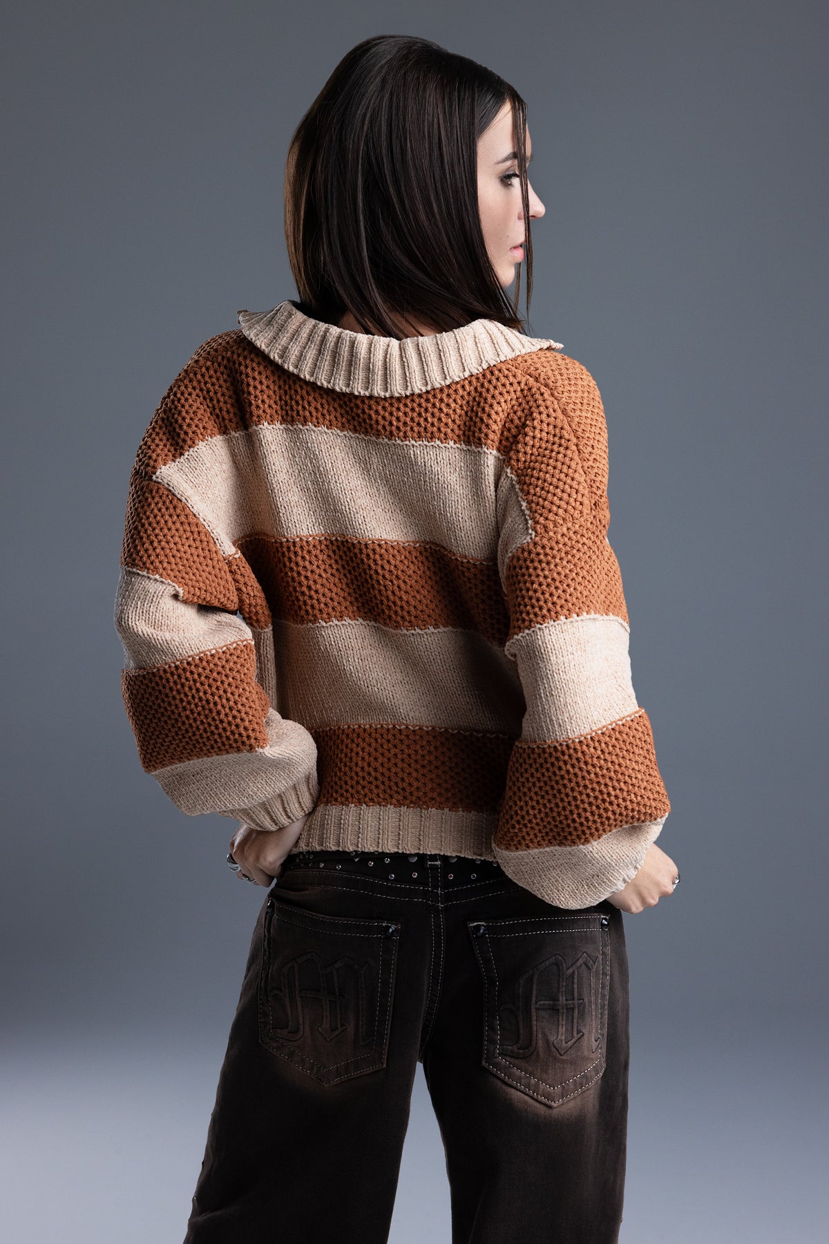 Striped crocheted sweater – Textured open-knit pattern – Striped color block design – Open collar with v-neckline – Ribbed trim accents – Relaxed fit with dropped shoulders Model is wearing size: S Model Measurements: Height: 5????Bust: 32A Waist: 24??Hips: 34??Fabric Content: Self: 100% Acrylic Care: Gentle hand wash cold. Lay flat to dry. Style No. MSW0476L-CHOCO BRN, MSW0476L-OLIVE GRN
