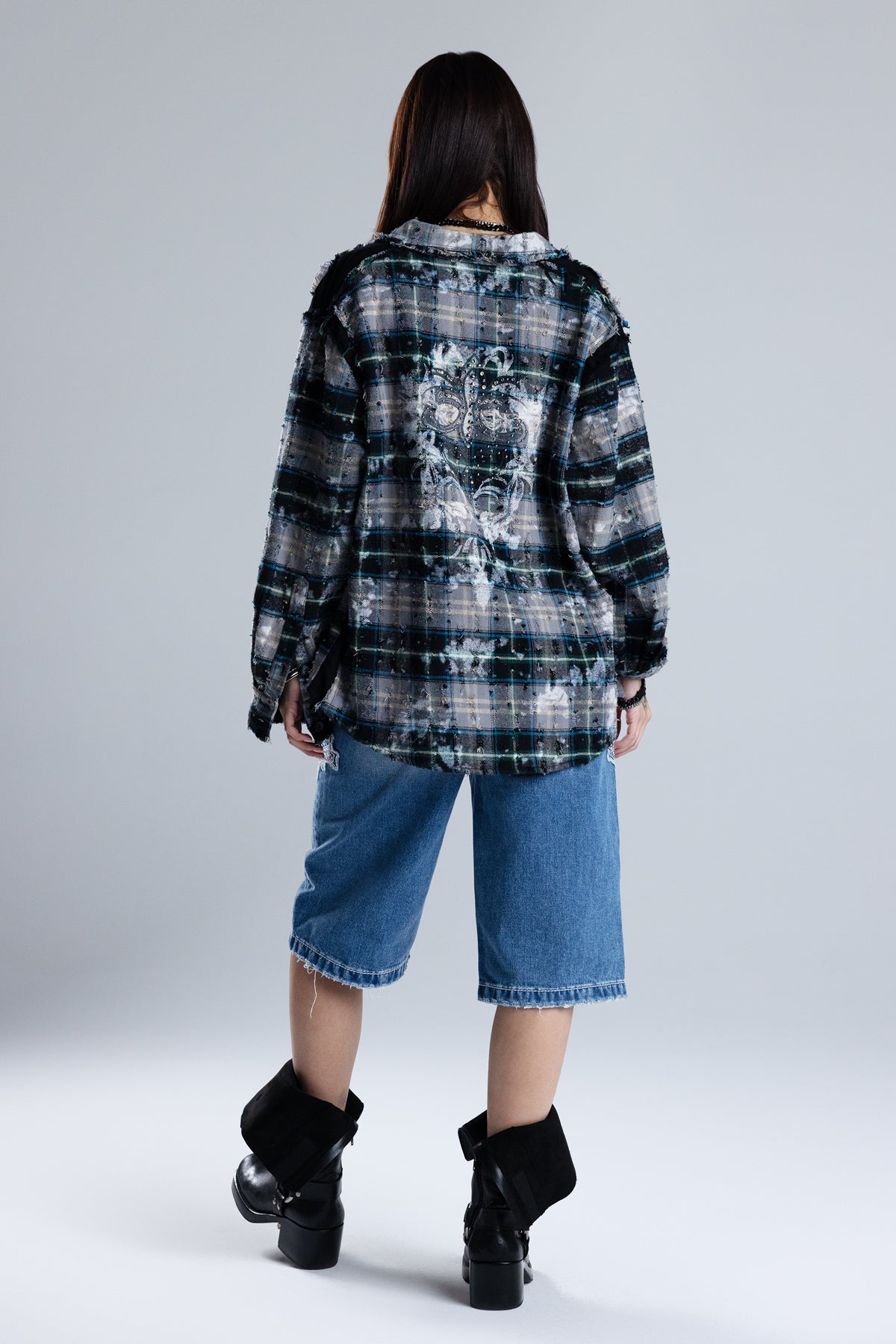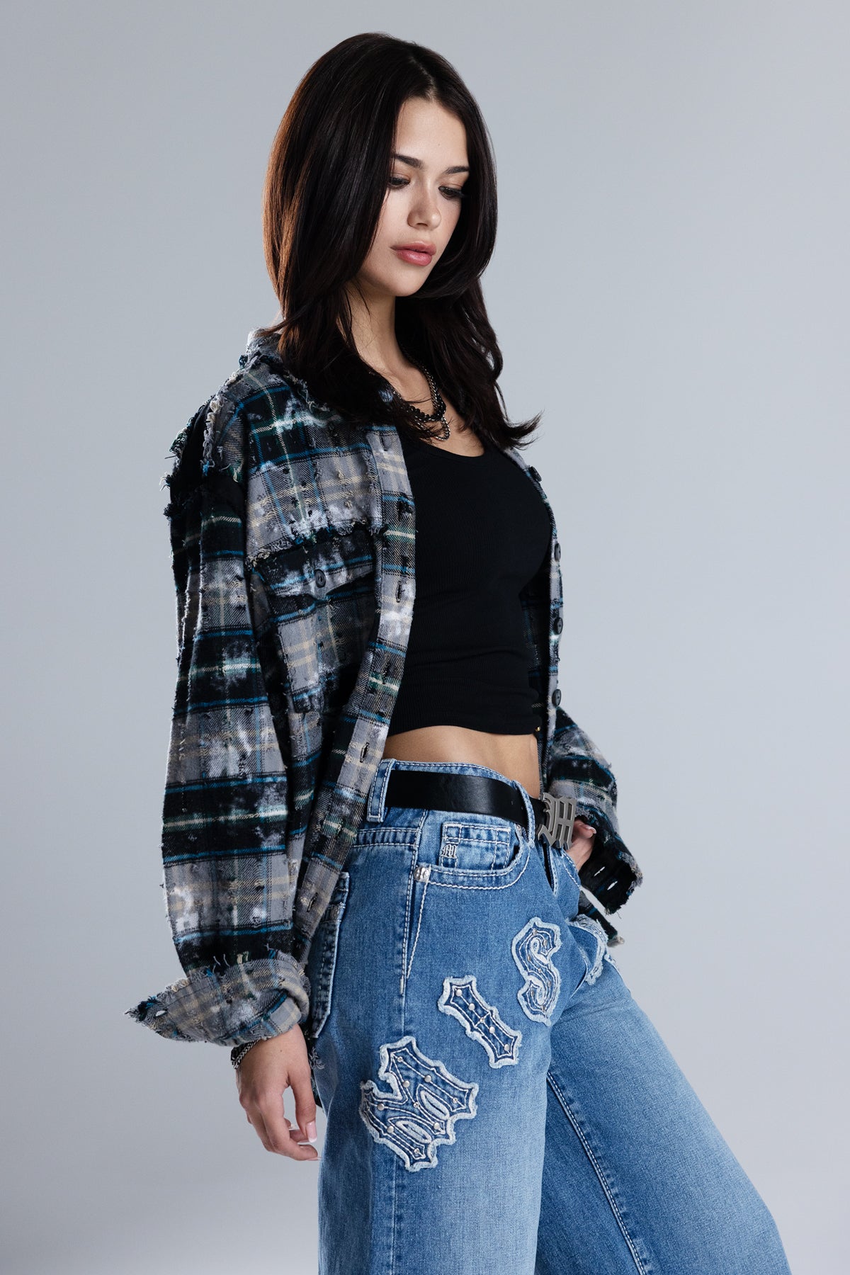 Relaxed-fit, pullover plaid top – Distressed fleur-de-lis–inspired graphic with stud embellishment – Contrast panel detailing – Flap pockets with durable construction – Button front closure Style No. BMT0122L-MULTI BLK