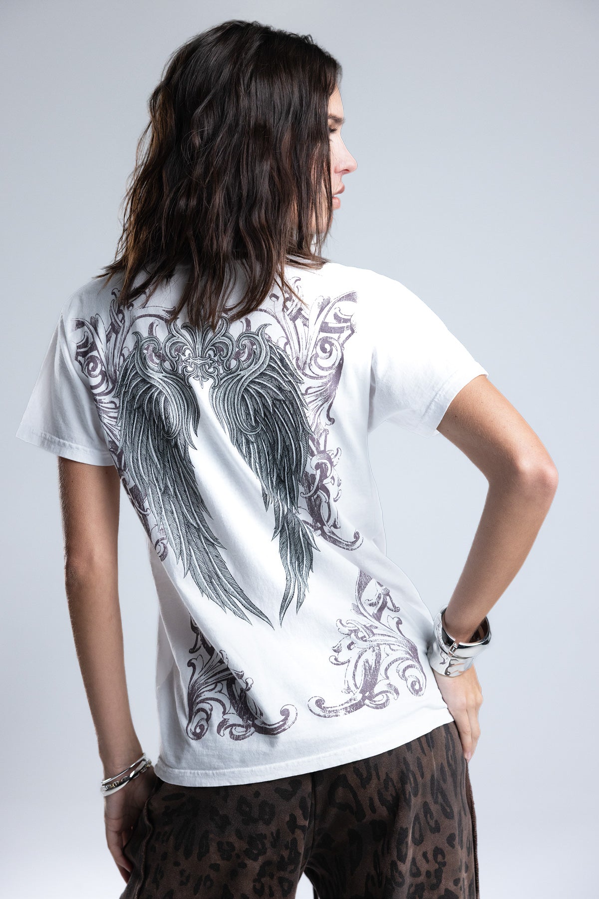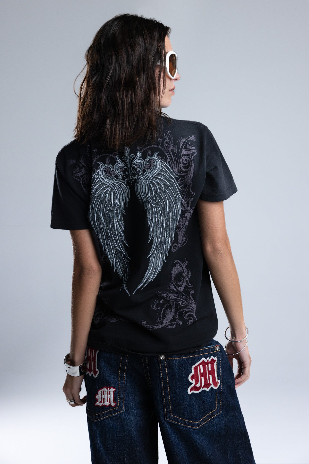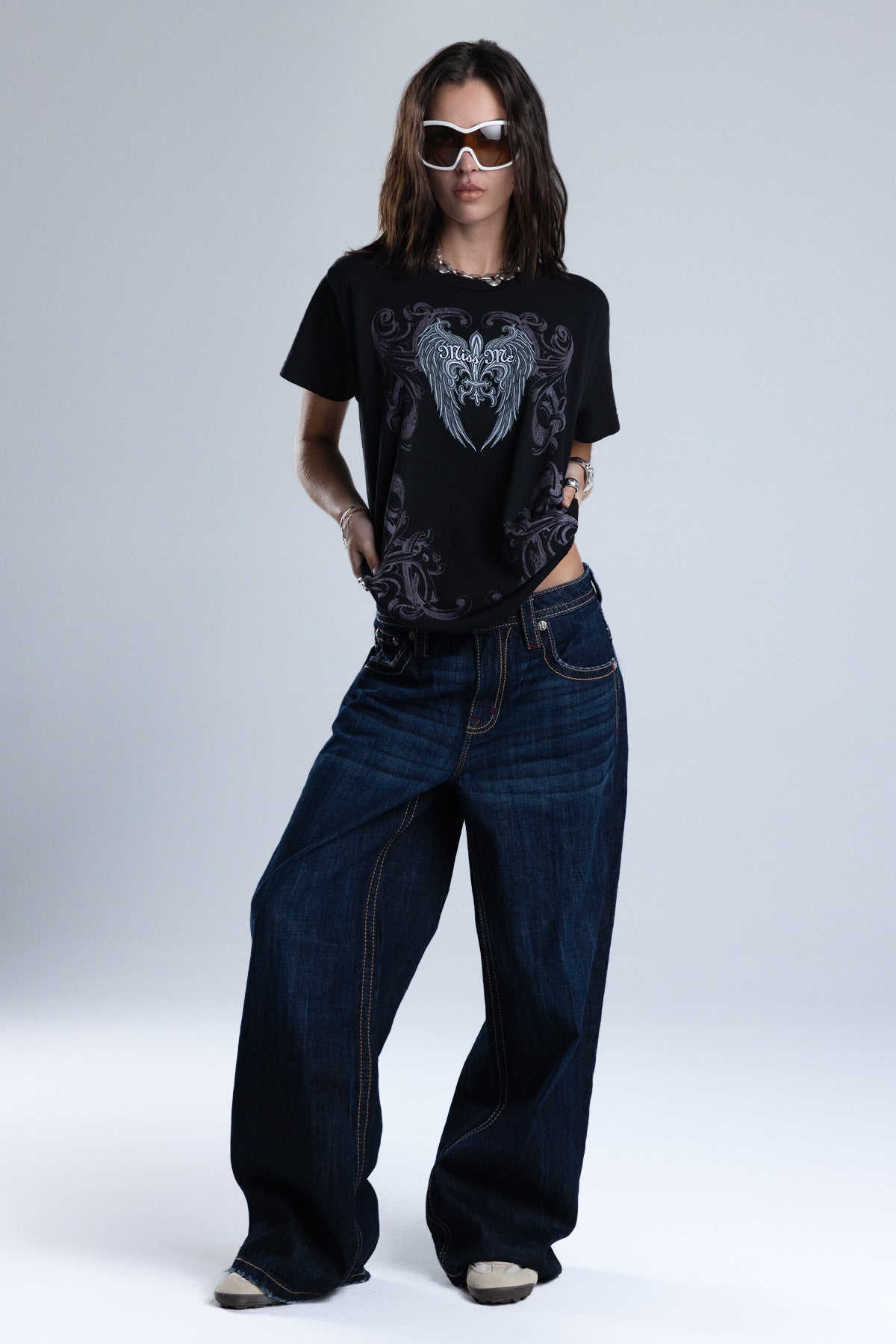 Relaxed fit graphic tee – Winged fleur-de-lis heart design – Miss Me script centerpiece – Ornamental filigree scrollwork – Subtle antiqued print detailing – Classic crew neckline Style No. BMT0169S-CHRC BLK, BMT0169S-WHITE