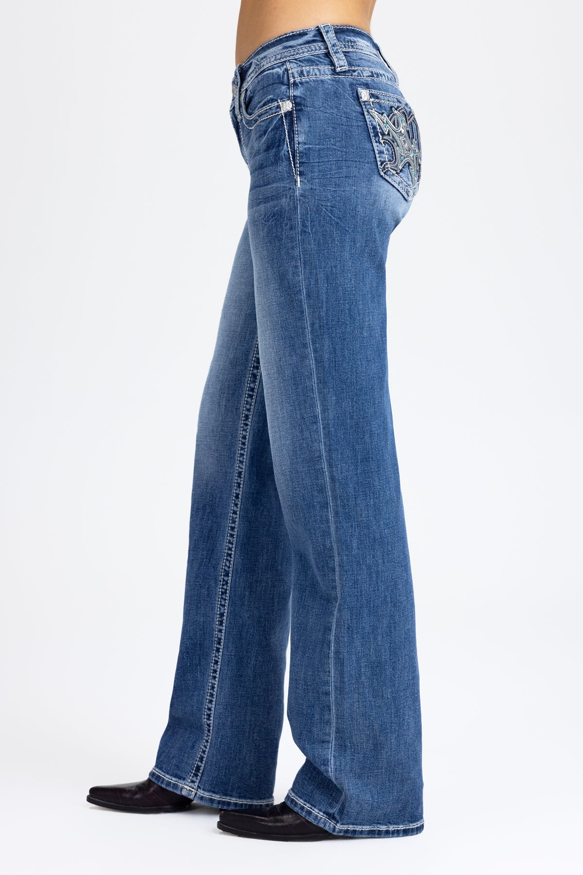 Washed finish, mid-rise slim wide jeans – Embroidered leather appliqué logo monogram design – Butterfly-inspired motif with rhinestone and faux pearl stud highlights – Metallic crosshatch mesh inset detailing – Embossed silver studded leather cross Miss Me brand patch – Whiskering details – 5-pocket design Style No. M9574SWV-M1089, M9574SWL-M1089