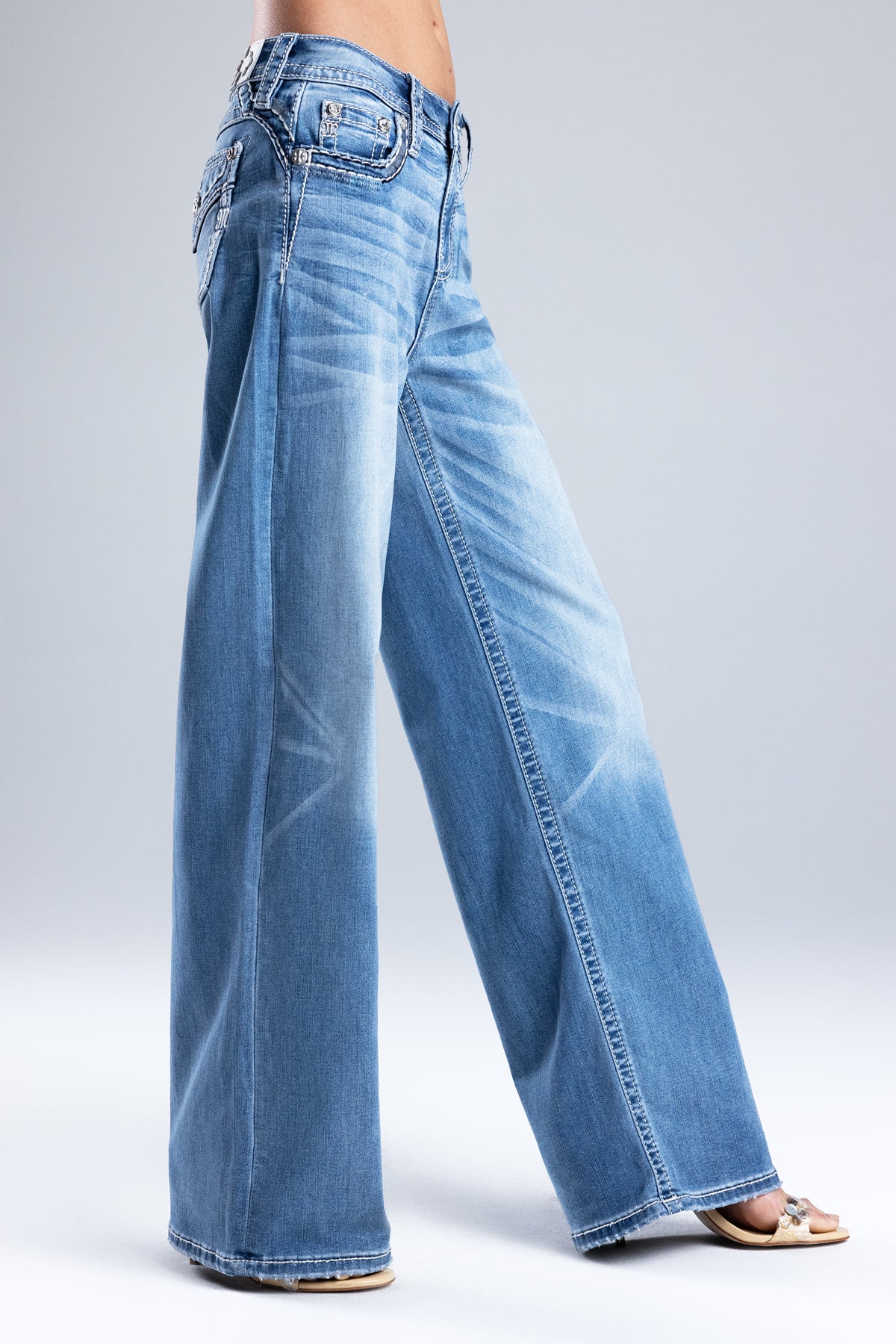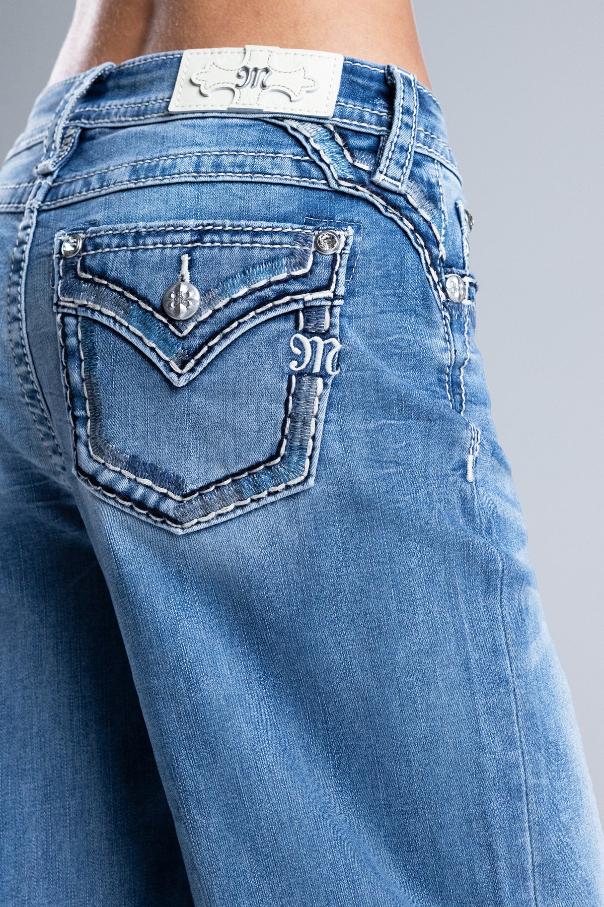 Washed, high-rise wide-leg jeans – Saddle-stitched border design – Textured soundwave embroidery – Embroidered mini Miss Me logo – Embossed white leather cross Miss Me brand patch – Whiskering details – 5-pocket design Style No. H5014W422L-M1036, H5014W422S-M1036, H5014W422V-M1036
