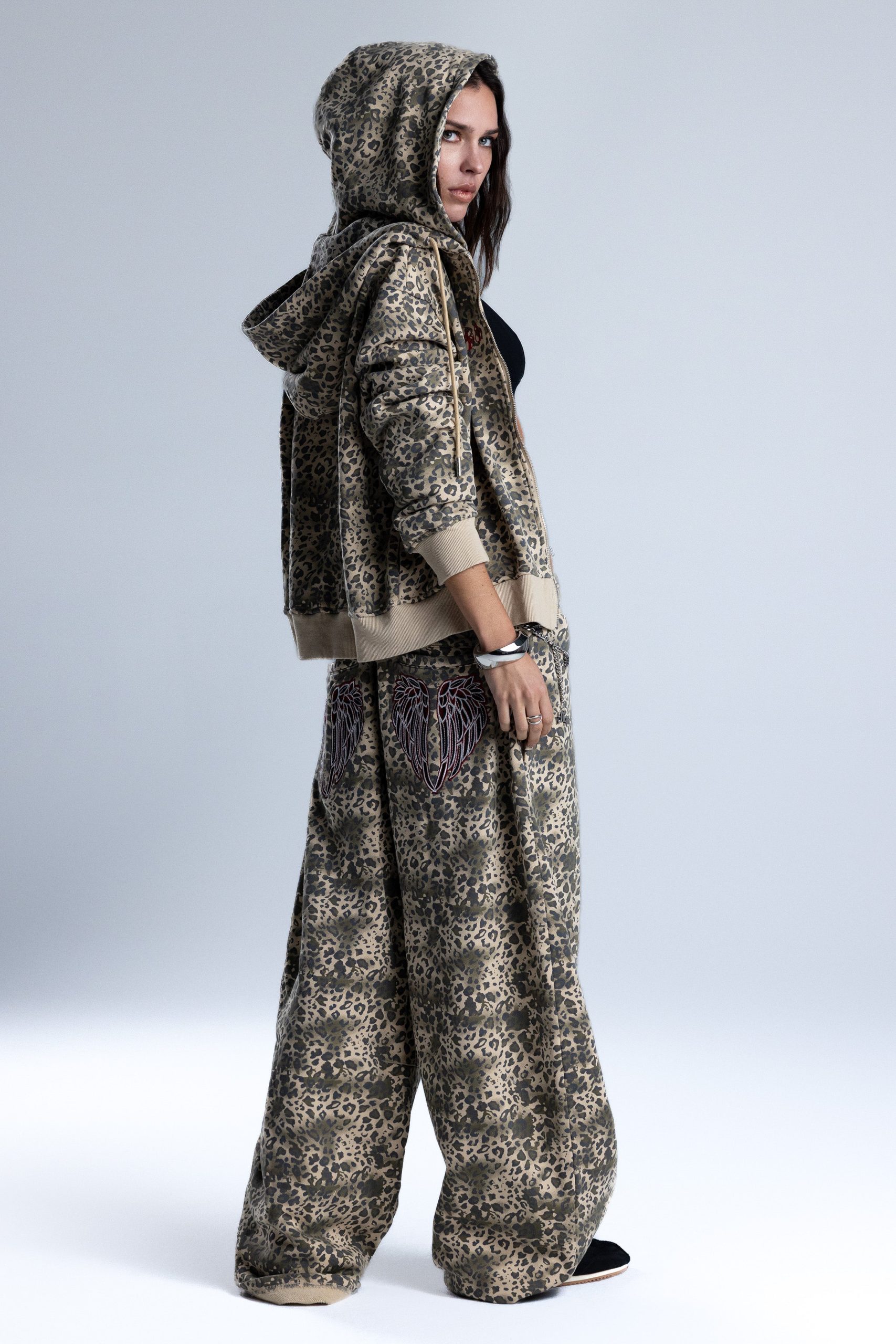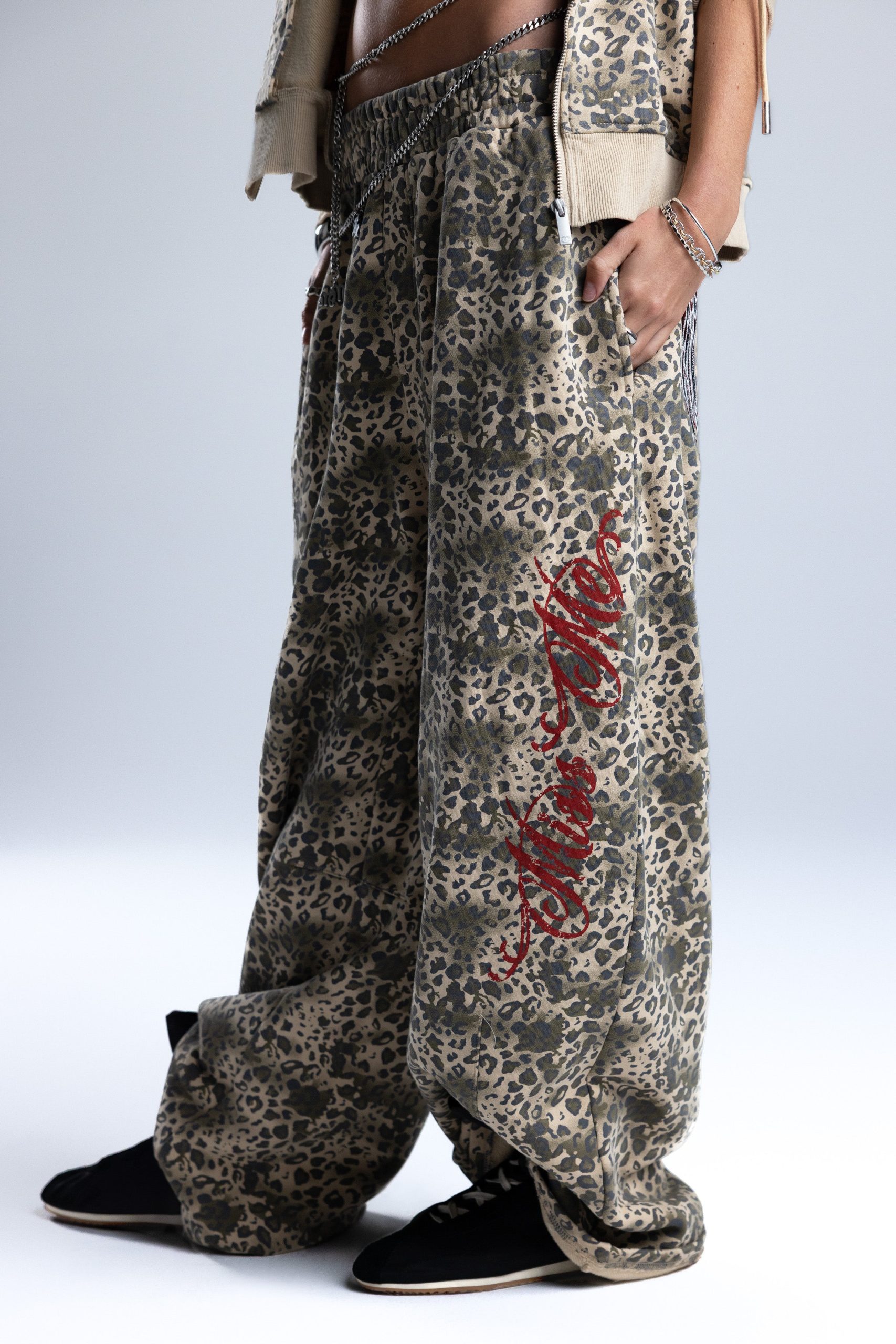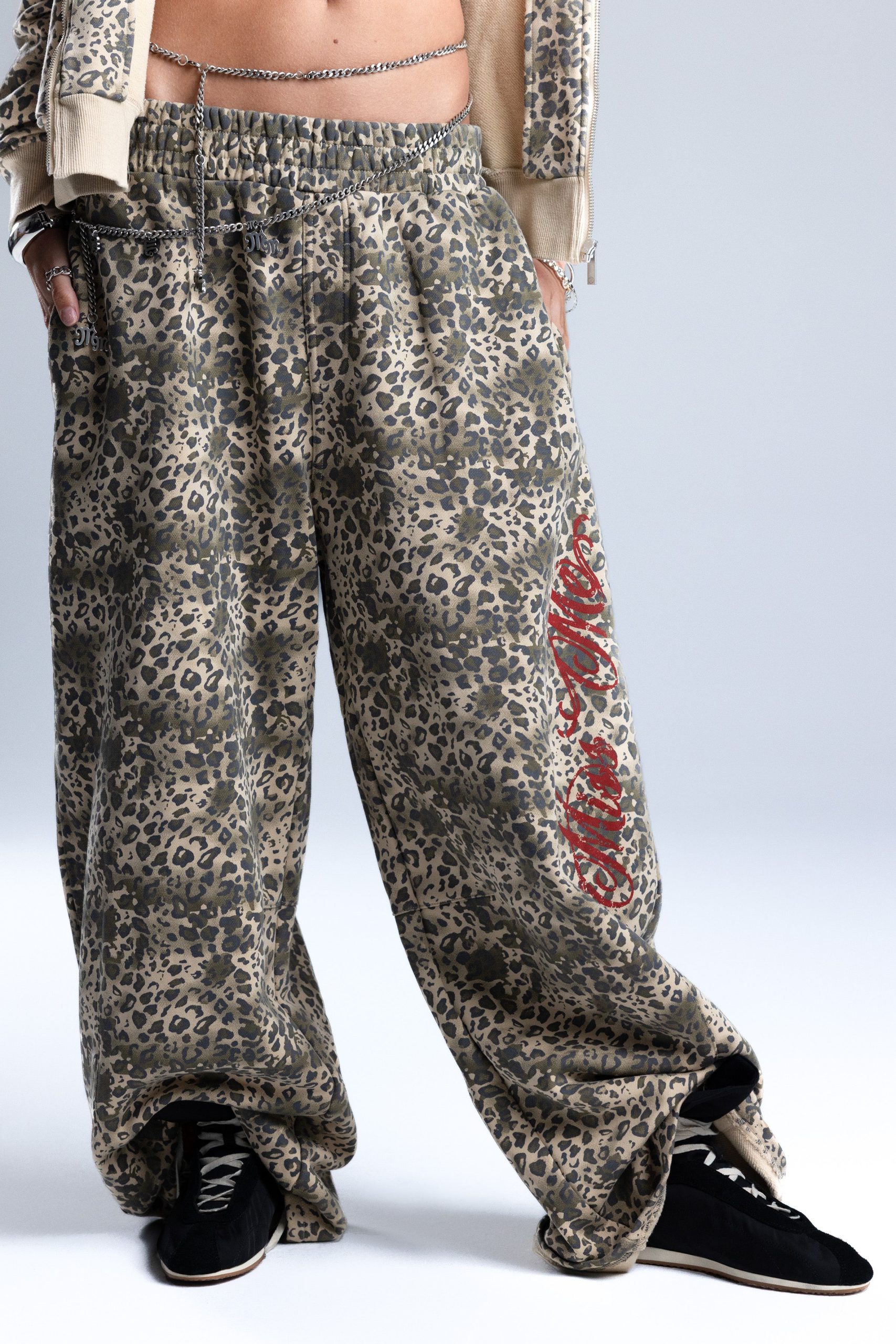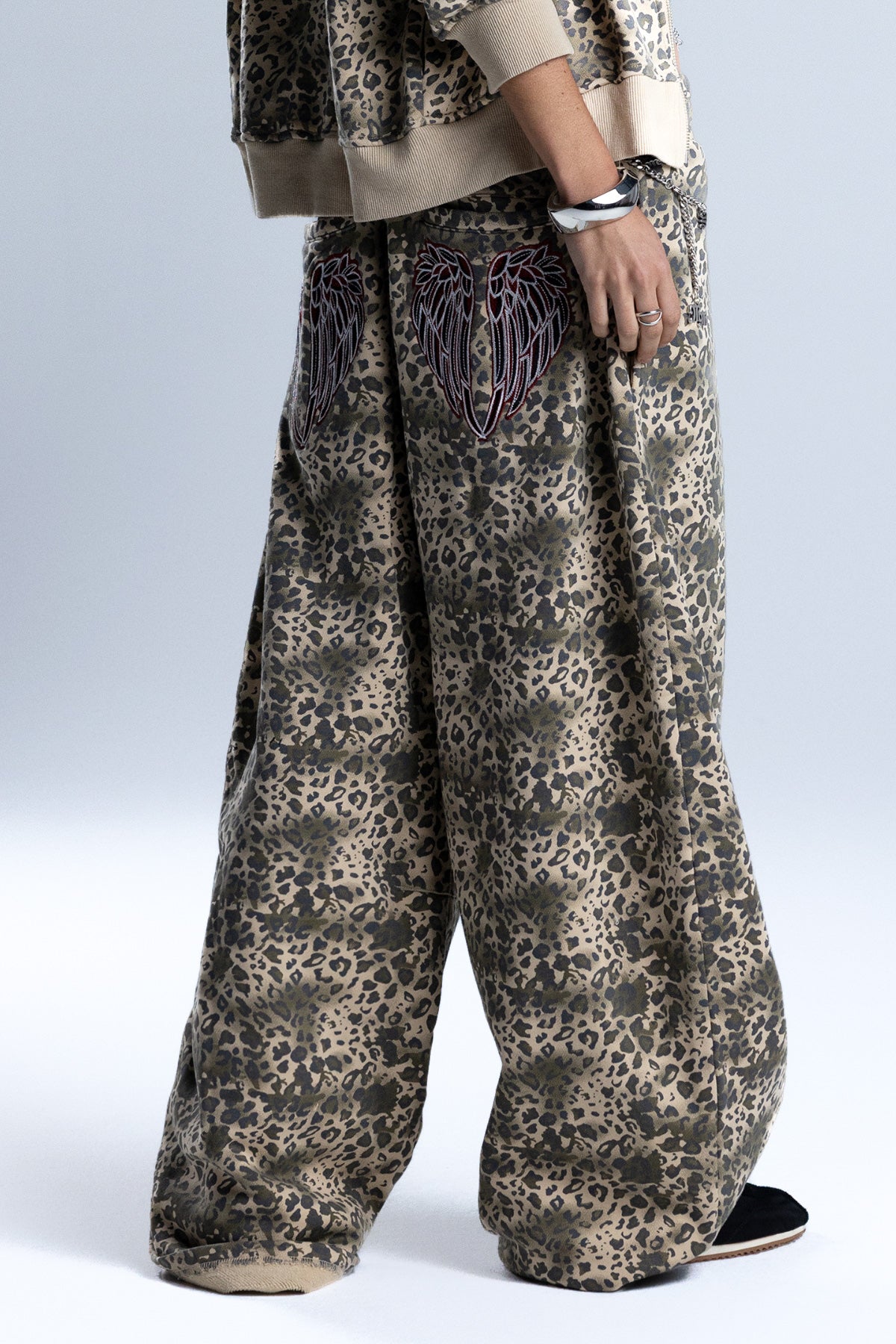 Relaxed fit leopard wide-leg sweatpants – Contrast embroidered wing design – Miss Me script branding – Cinched waistband – 4-pocket design Style No. BMP0064L-TAUPE BEIG