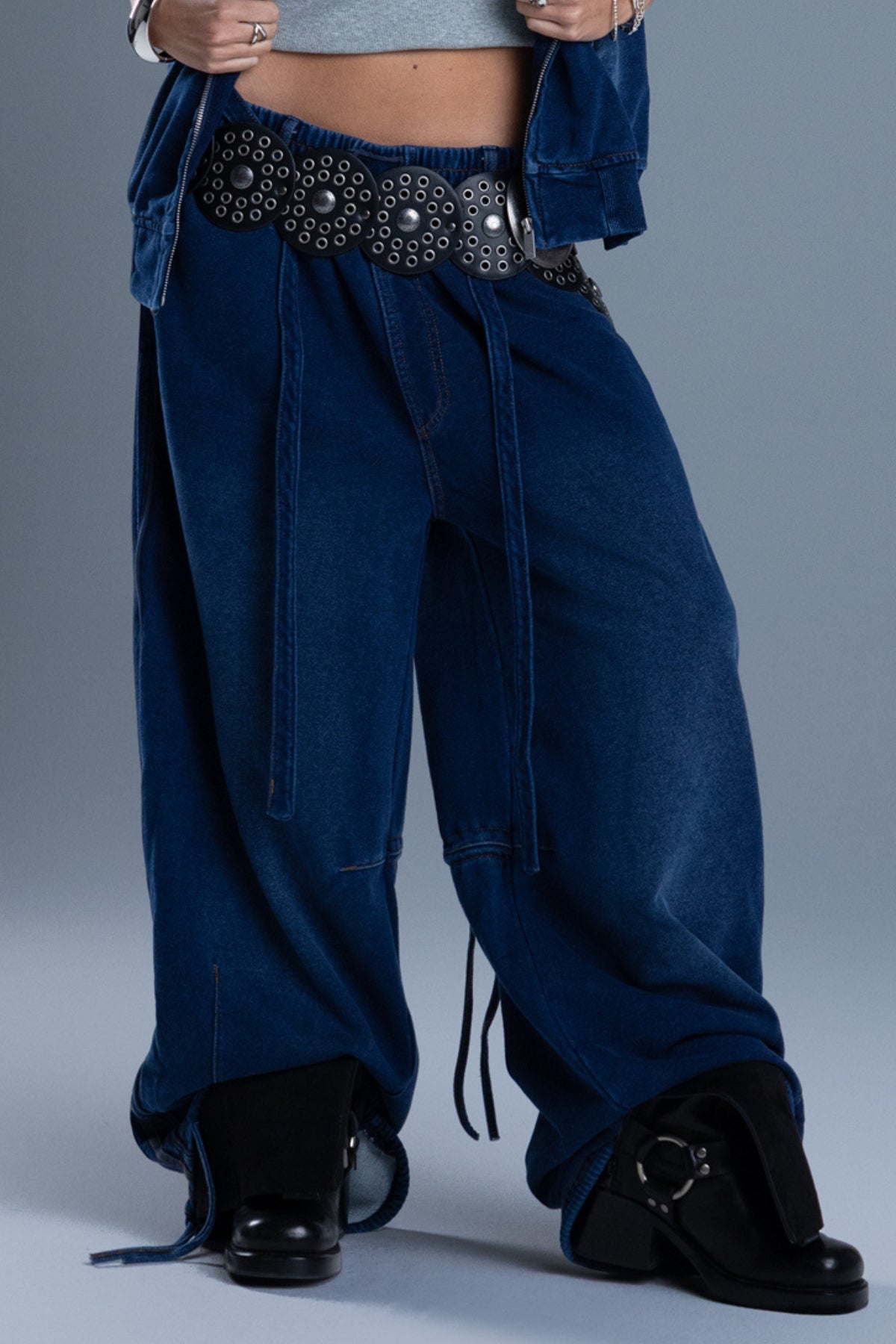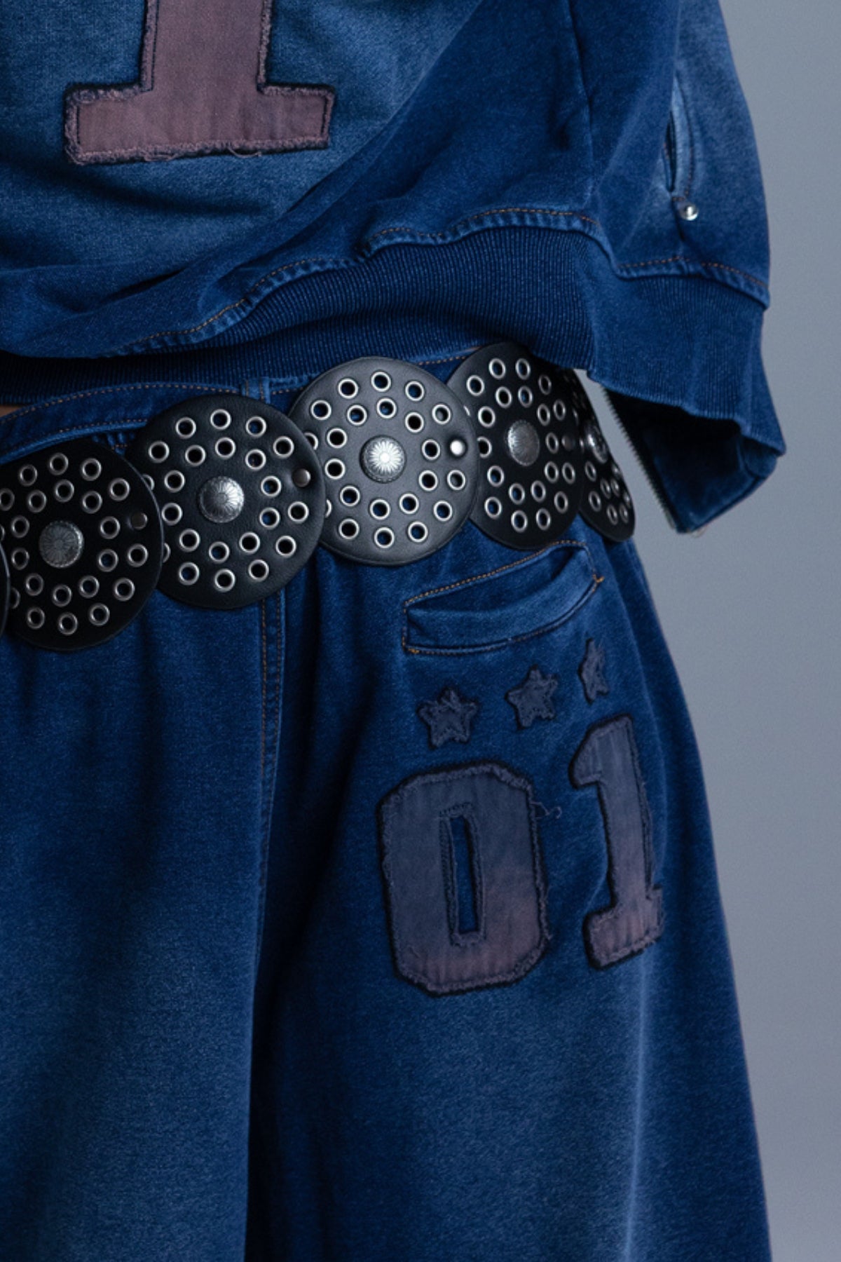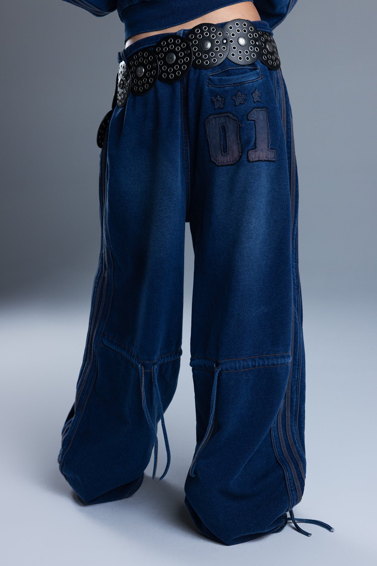 Relaxed fit, faux denim sweatpants – Frayed appliqué 01 and star patch detailing – Embroidered Miss Me branding – Raised stripe accents – Elasticized waistband with wide exterior tie belt – Adjustable back-knee and hem cinch-ties – 3-pocket design Model is wearing size: 25 Model Measurements: Height: 5????Bust: 32A Waist: 24??Hips: 34??Fabric Content: Self: 100% Cotton / Contrast1: 100% Cotton / Contrast2: 96% Cotton, 4% Spandex Care: Gentle machine wash inside-out with like colors in cold water. Tumble dry low. Style No. BMP0048L-DENIM BLU