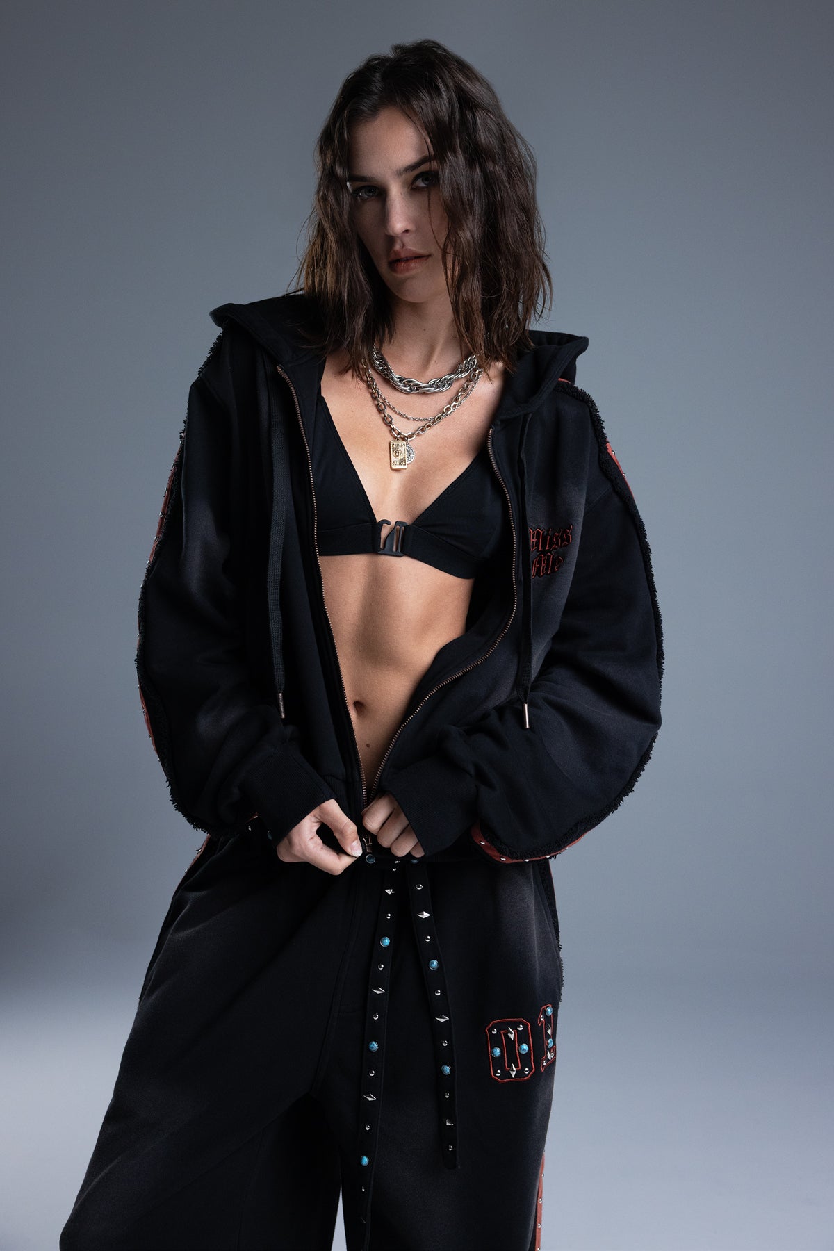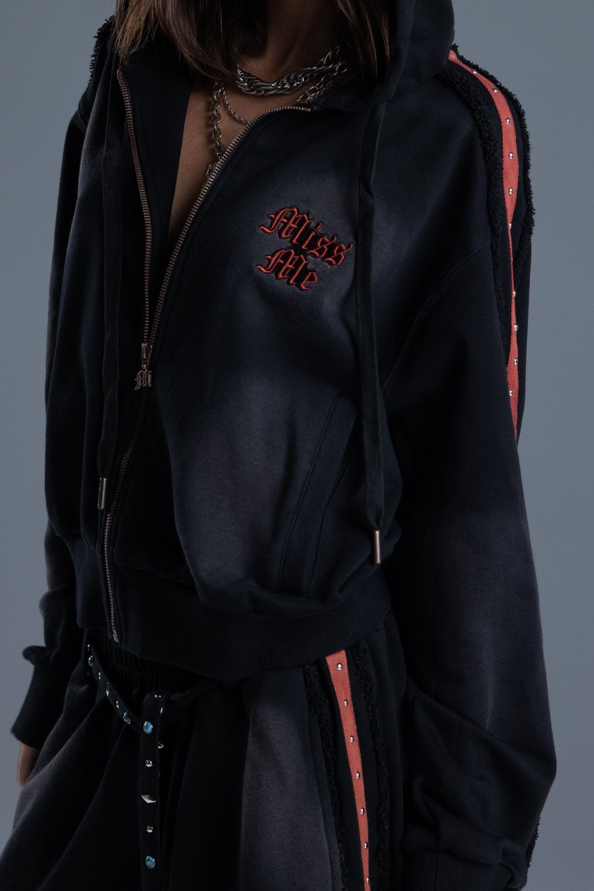 Relaxed fit, washed finish zip-up hoodie – Stitched appliqué Miss Me logo patch – Contrast sleeve taping with metallic dome stud accents – Frayed trim accents – Ribbed cuffs and hems – Adjustable wide drawstrings with branded aglets – Zip-front closure Model is wearing size: 25 Model Measurements: Height: 5????Bust: 32A Waist: 24??Hips: 34??Fabric Content: Self: 52.4% Cotton, 47.6% Polyester / Contrast: 95% Cotton, 5% Spandex / Trim1: 100% Cotton / Trim2: 100% Polyester Care: Gentle machine wash inside-out with like colors in cold water. Tumble dry low. Style No. BMJ0099L-BLACK