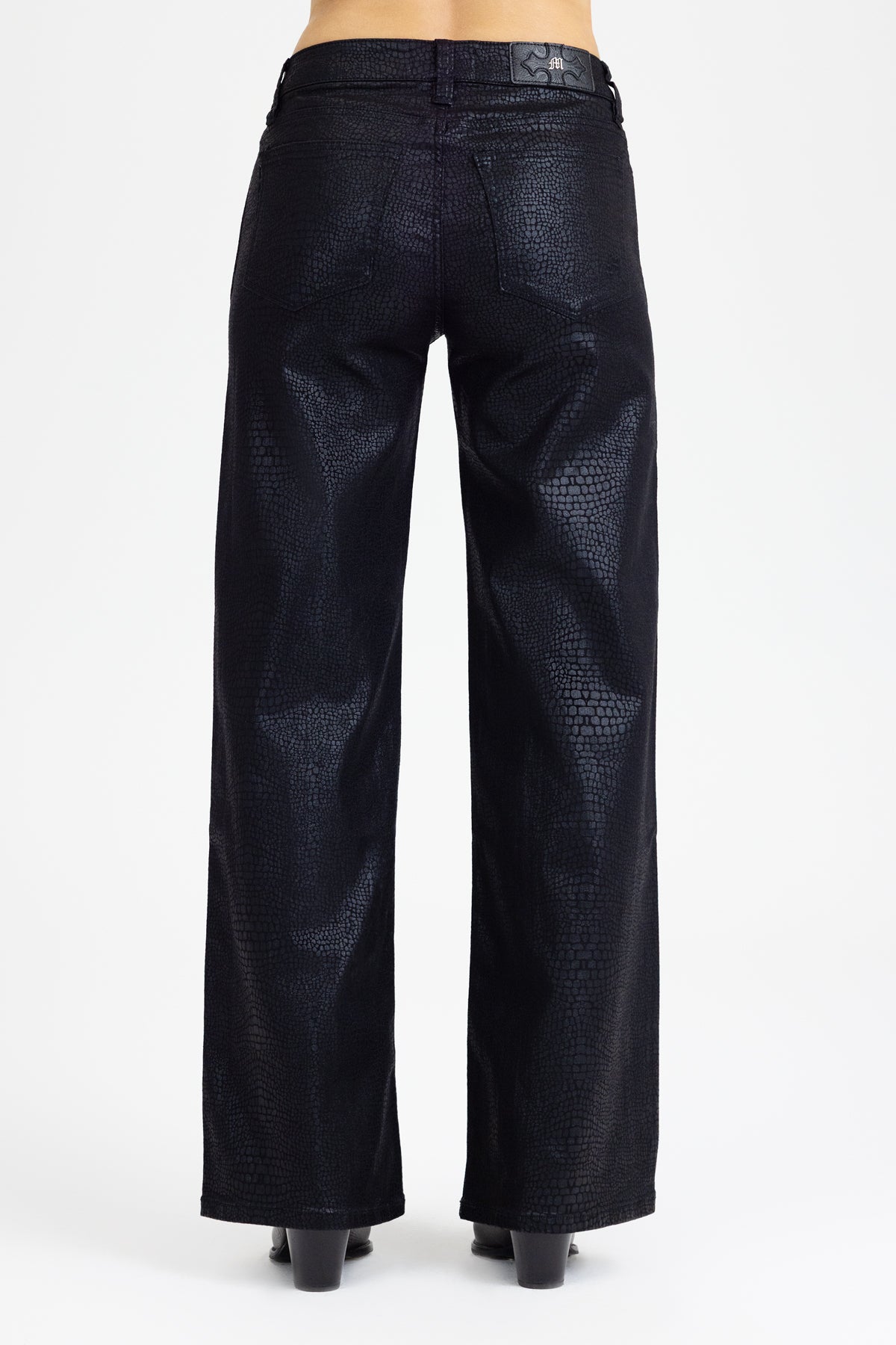 Mid-rise, wide-leg jeans – Metallic python-design coated finish – Tonal embroidered mini Gothic Miss Me logo – Embossed black leather cross Miss Me brand patch – 5-pocket design Model is wearing size: 25 Model Measurements: Height: 5????Bust: 32B Waist: 25??Hips: 35??Fabric Content: 61% Cotton, 28% Polyester, 10% Rayon, 1% Elastane (Spandex) Care: Gentle machine wash inside-out with like colors in cold water. Tumble dry low. Style No. M2388WS-MT PYTHON CTD, M2388WV-MT PYTHON CTD