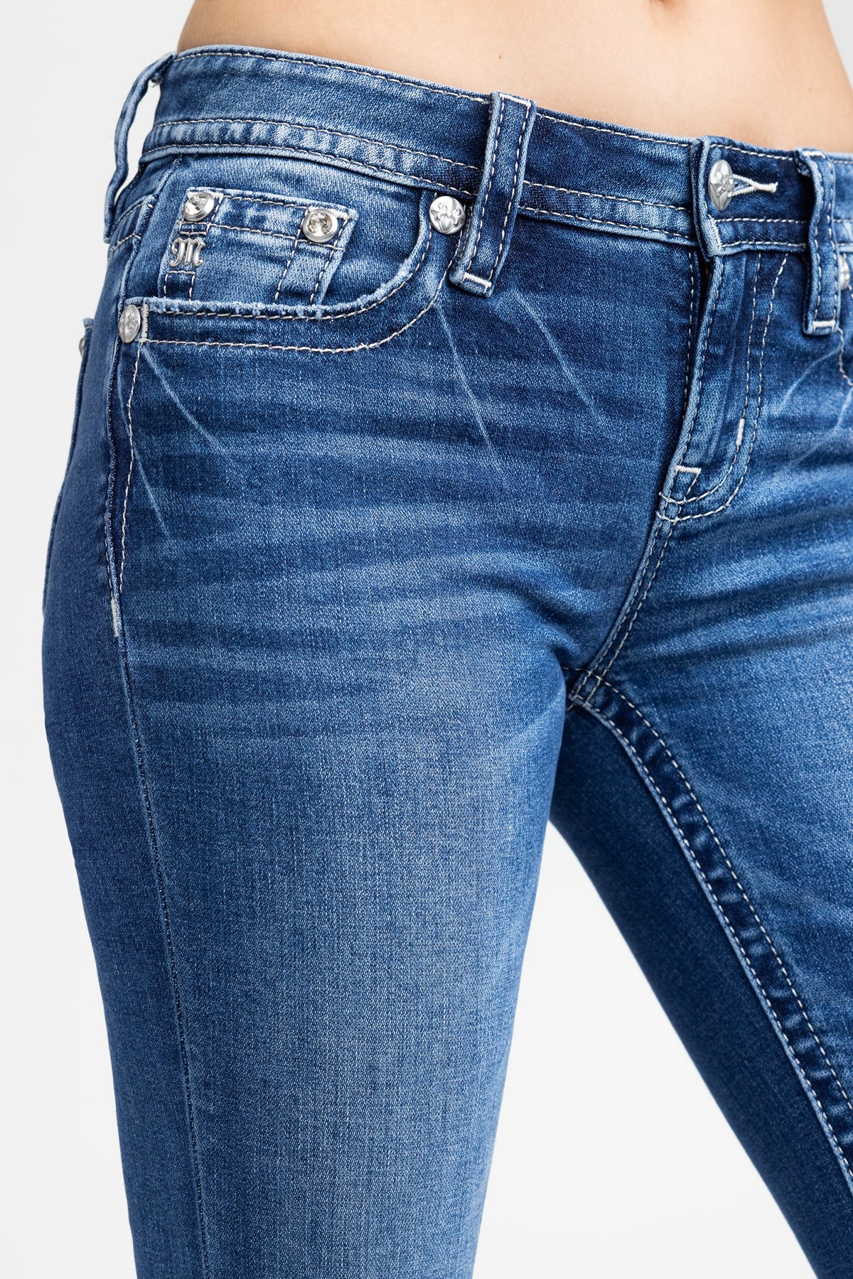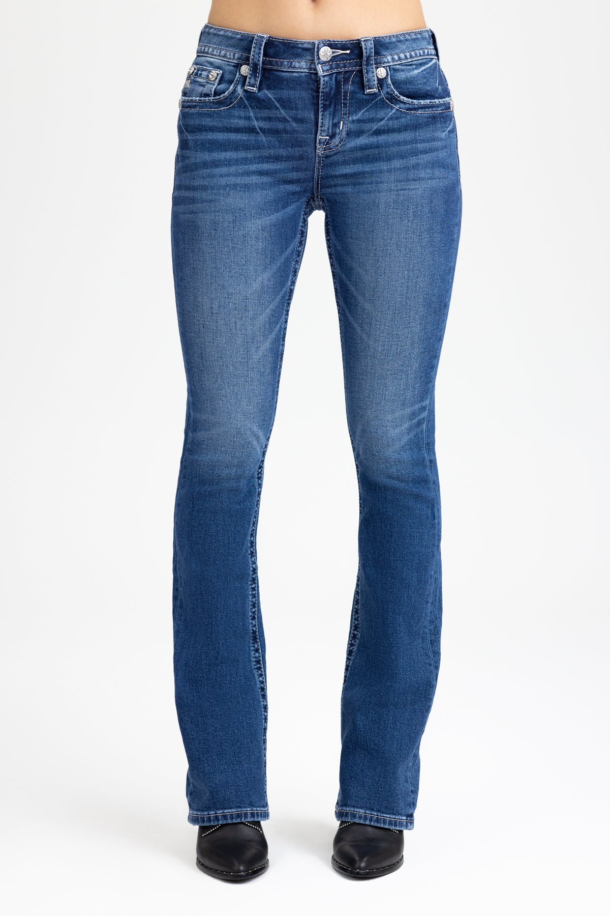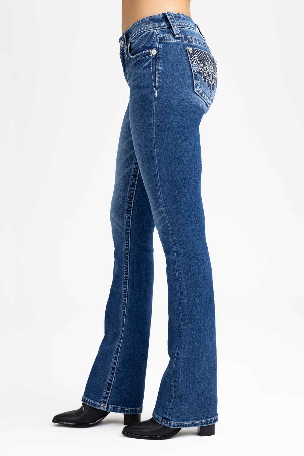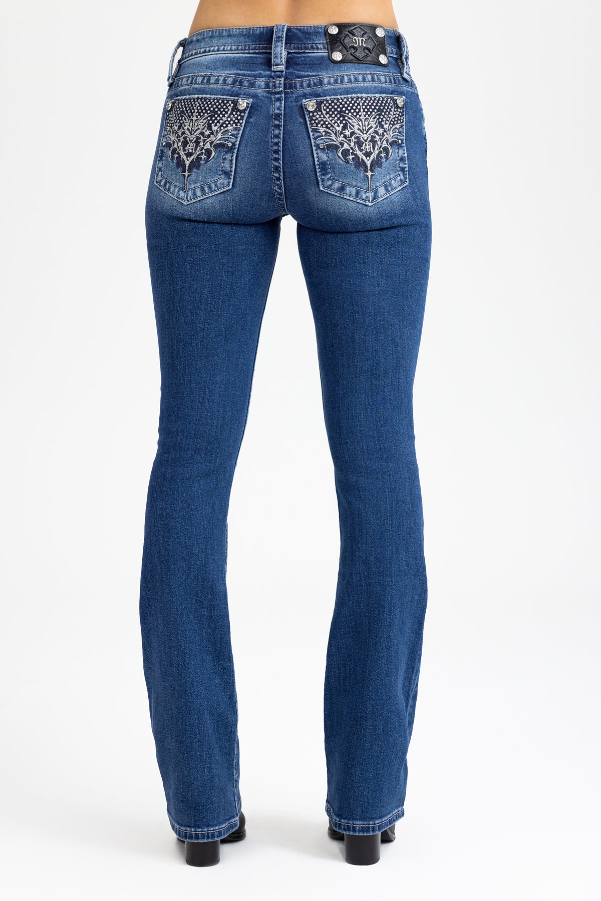Washed finish, mid-rise bootcut jeans – Embroidered baroque filigree scroll design – Studded rhinestone and rhinestone rivet accents – Abraded pocket edging – Embossed black studded leather cross Miss me brand patch – Whiskering details – 5-pocket design Model is wearing size: 25 Model Measurements: Height: 5????Bust: 32B Waist: 25??Hips: 35??Fabric Content: 99% Cotton, 1% Elastane Care: Gentle machine wash inside-out with like colors in cold water. Tumble dry low. Style No. M9674BS-K1540, M9674BV-K1540, M9674BL-K1540