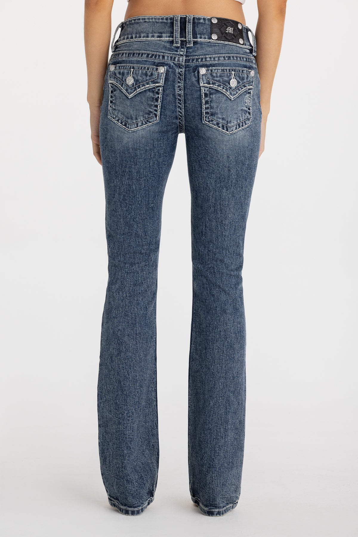 Washed, low-rise bootcut jeans – Subtle saddle-stitched embroidery – Embroidered mini Gothic Miss Me logo – Embossed black studded leather cross Miss Me brand patch – Double waistband construction – Whiskering details – 5-pocket design Model is wearing size: 25 Model Measurements: Height: 5’9″ Bust: 34B Waist: 25″ Hips: 36″ Fabric Content: 99% Cotton, 1% Elastane Care: Gentle machine wash inside-out with like colors in cold water. Tumble dry low. Style No. L9545B2L-V149, L9545B2S-V149, L9545B2V-V149