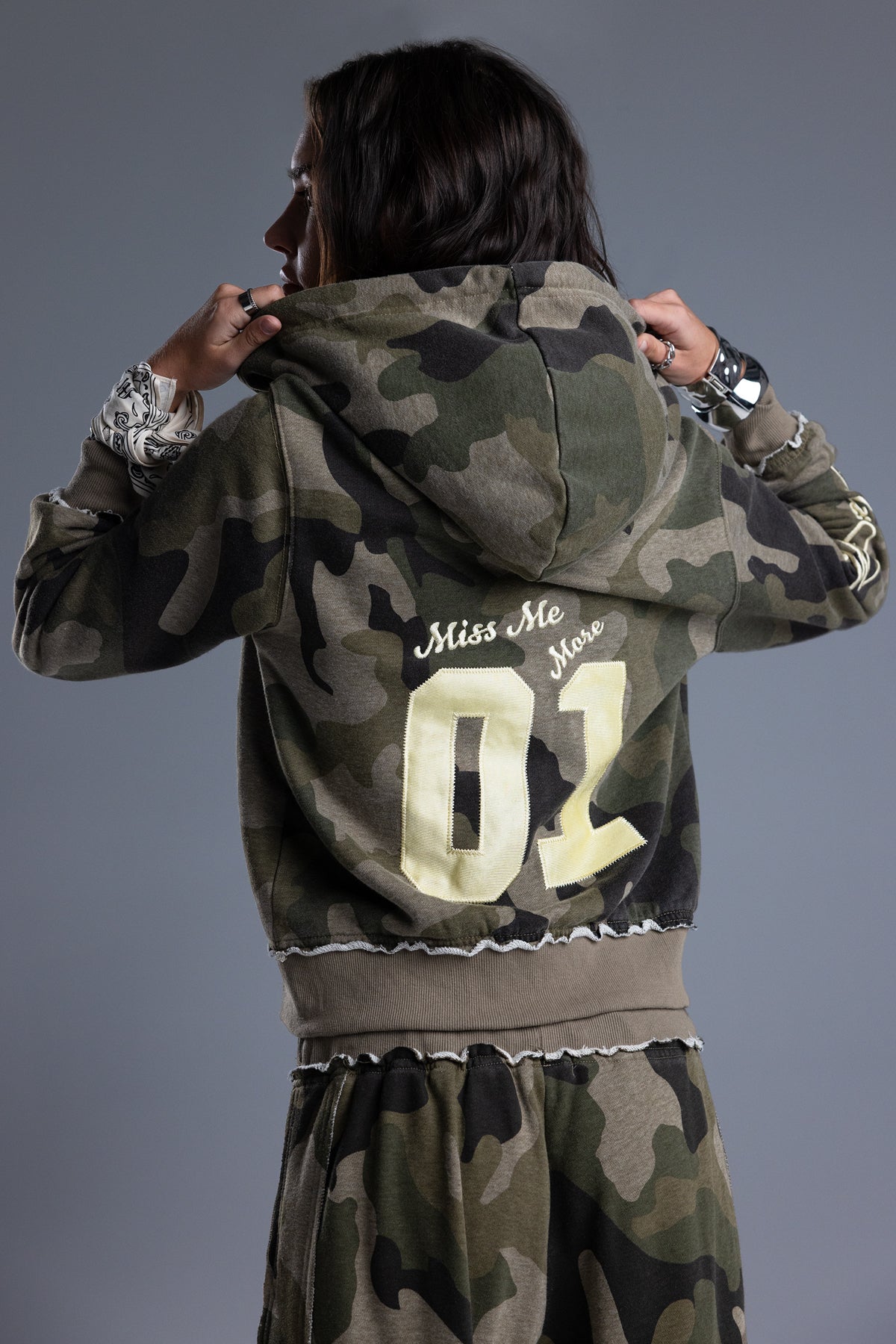 Zip-up hoodie jacket – Embroidered Miss Me 01 graphics – Distressed ribbed hem and sleeve cuffs – Branded zipper pull tab – Adjustable drawstring Model is wearing size: S Model Measurements: Height: 5????Bust: 32A Waist: 24??Hips: 34??Fabric Content: Self: 51.2% Cotton, 48.8% Polyester; Contrast 1: 100% Polyester; Contrast 2: 92.9% Cotton, 7.1% Spandex Care: Gentle machine wash inside-out with like colors in cold water. Tumble dry low. Style No. BMJ0028L-CAMO GRN