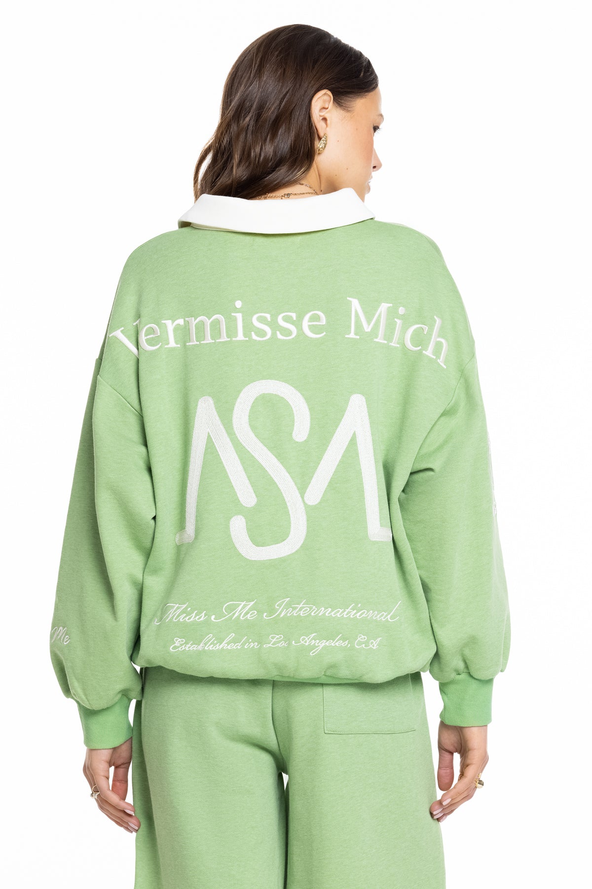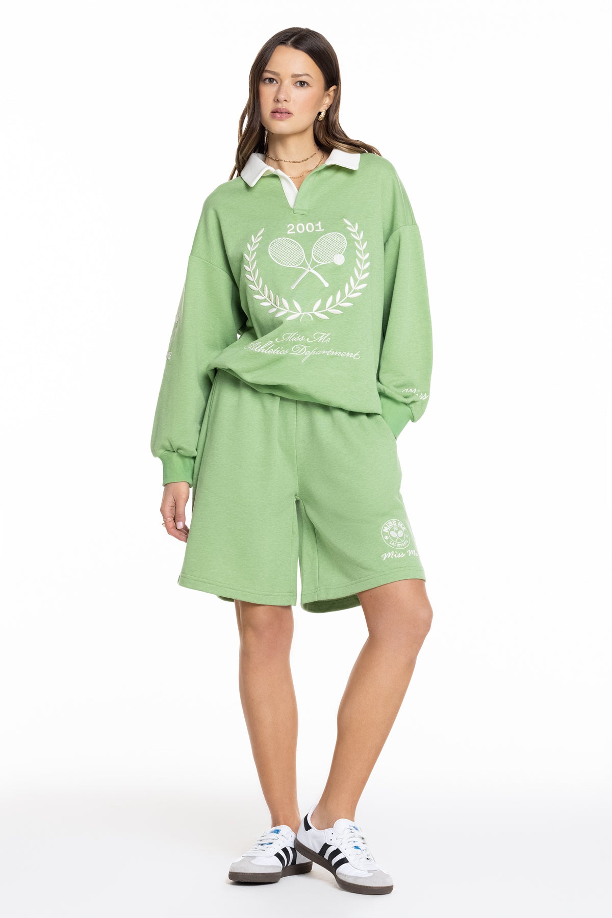 Collared graphic pullover sweatshirt – Miss Me Athletics Department graphic design – Embroidered Miss Me branding – Ribbed hem and cuffs – Contrast wide-collar Model is wearing size: S Model Measurements: Height: 5??.5??Bust: 34??Waist: 24??Hips: 35??Fabric Content: Self: 51.2% Cotton, 48.8% Polyester; Contrast1: 51.2% Cotton, 48.8% Polyester; Contrast2: 92.8% Cotton, 7.2% Spandex Care: Gentle machine wash inside-out with like colors in cold water. Tumble dry low. Style No. BMT0019L-GREEN