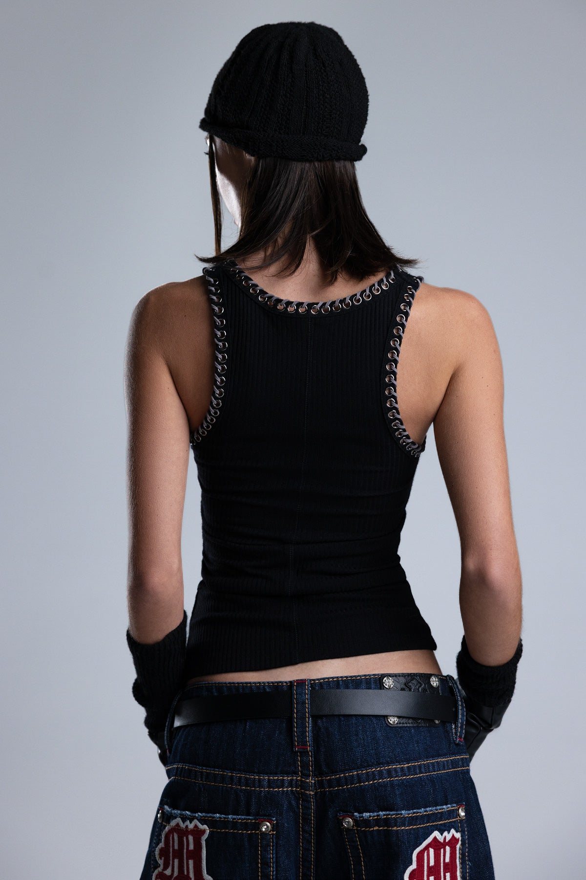 Slim fit, ribbed knit racerback tank top – Corded eyelet trim – Cropped hemline – Tonal back seam construction – Scoop neckline Style No. MT3279T-BEIGE, MT3279T-BLACK, MT3279T-GREY