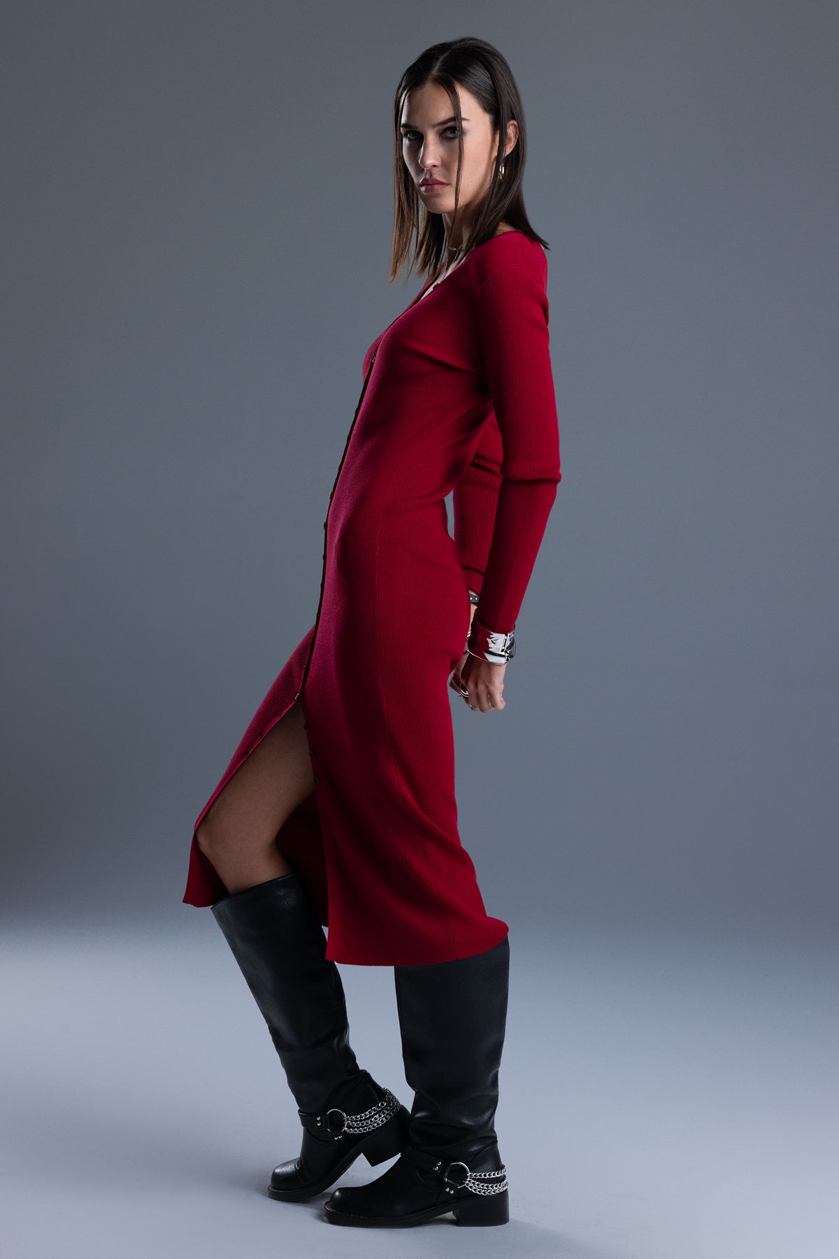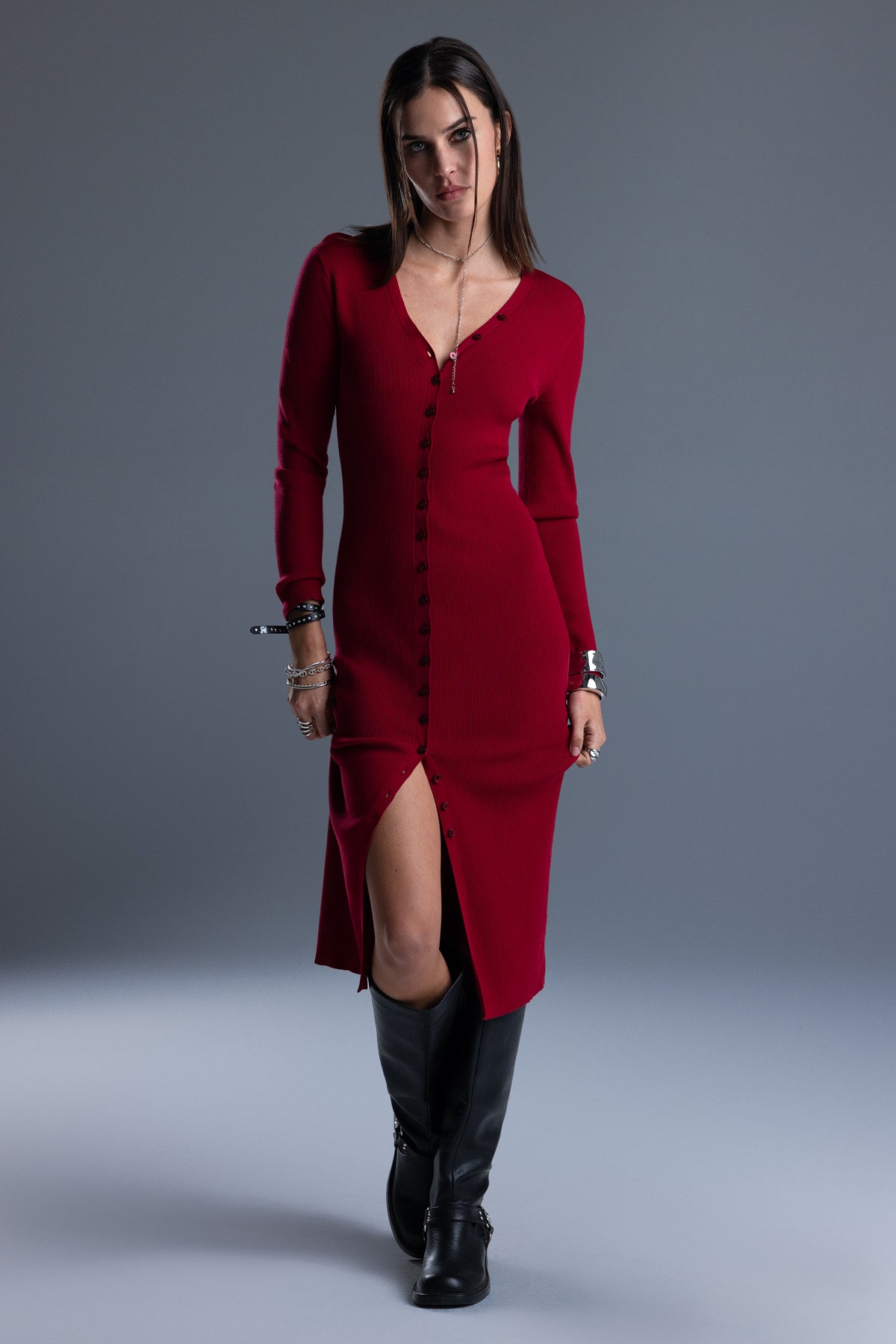 Fitted midi dress – Soft, ribbed knit construction – Button-front closure – Front walking slit – Deep V-neckline Model is wearing size: 25 Model Measurements: Height: 5????Bust: 32A Waist: 24??Hips: 34??Fabric Content: Self: 56% Tencel, 21% Cotton, 18% Nylon, 5% Silk Care: Gentle machine wash inside-out with like colors in cold water. Tumble dry low. Style No. BMD0002L-BLACK, BMD0002L-RED