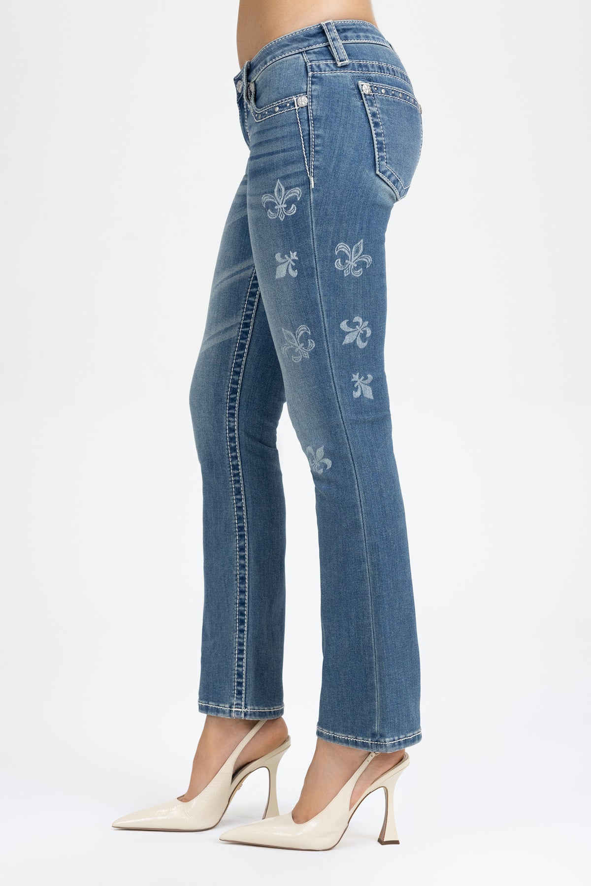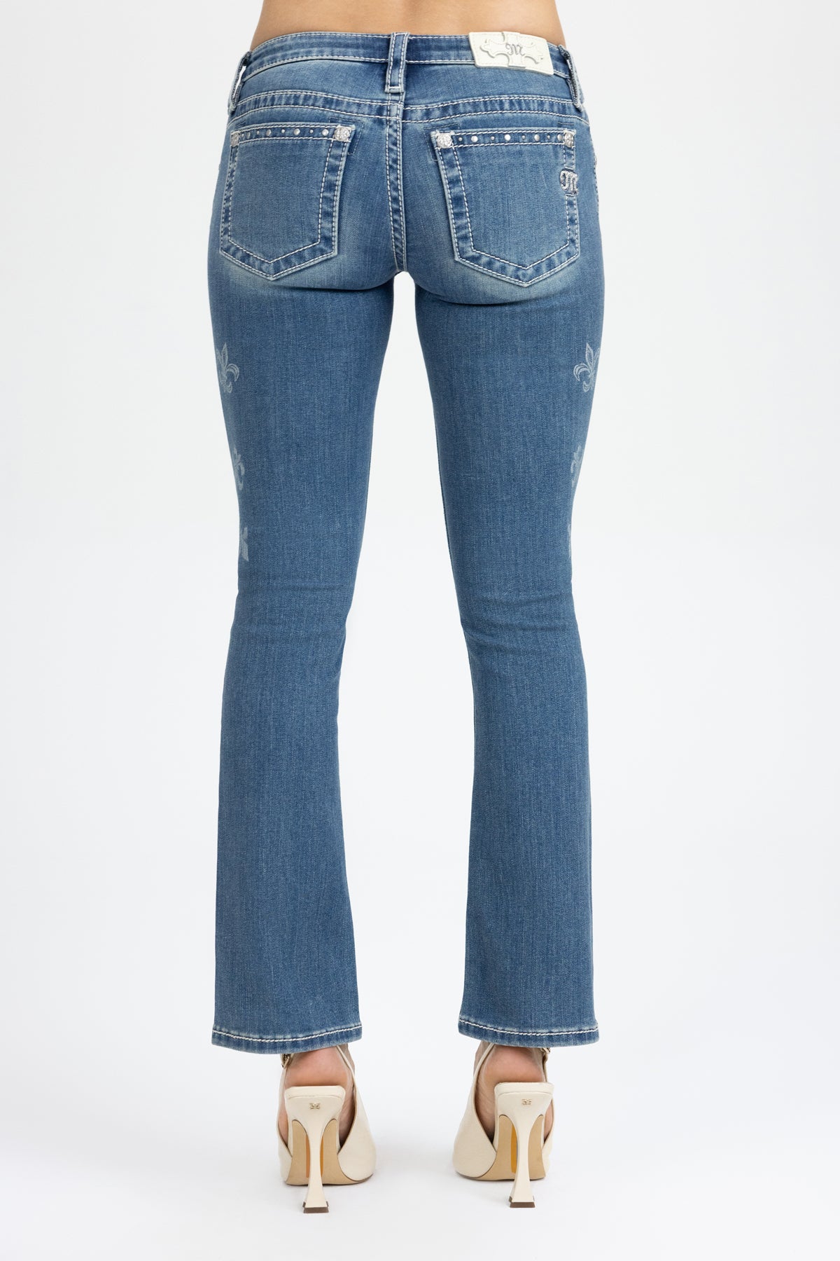 Low-rise, washed slim bootcut jeans – Simple M logo with mini rhinestone details – Flat silver rivet hem detail on front and back pockets – Laser etched Fleur-De-Lis on front – Rhinestone rivets – Embossed white leather logo brand patch – Slight fading Fabric Content: 52% Cotton, 27% Lyocell, 20% Polyester, 1% Elastane Care: Gentle machine wash inside-out with like colors in cold water, Tumble dry low Model is wearing size: 26 Model Measurements: Height: 5????Bust: 34B Waist: 25??Hips: 36??Style No. L9344SB-V114, L9344SBS-V114