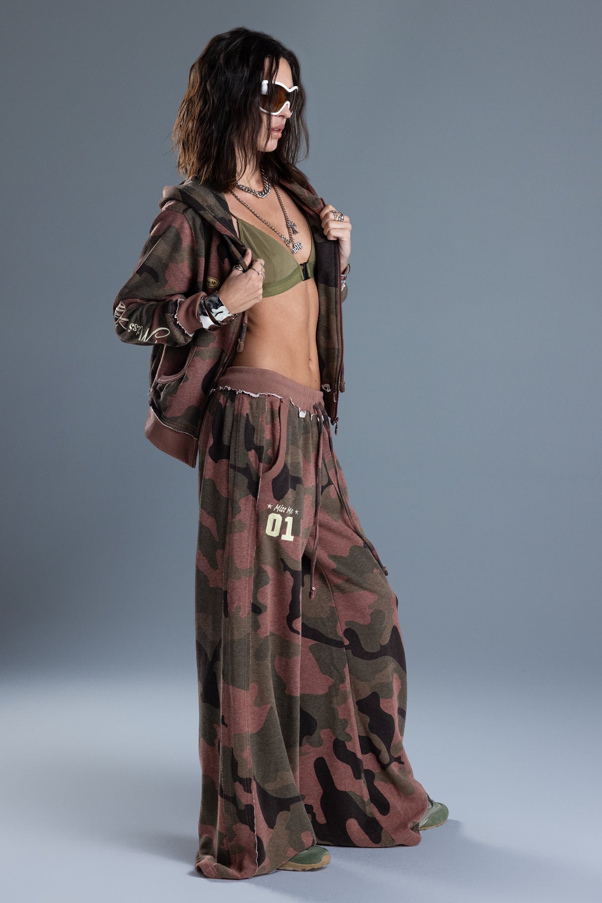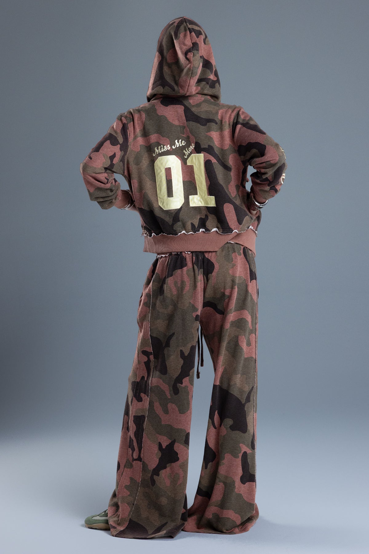 Relaxed fit, wide-leg camo sweatpants – Embroidered “Miss Me 01” design – Distressed ribbed waistband – Layered side seams – Adjustable drawstrings – 2-pocket design Style No. BMP0018L-MAROON RED
