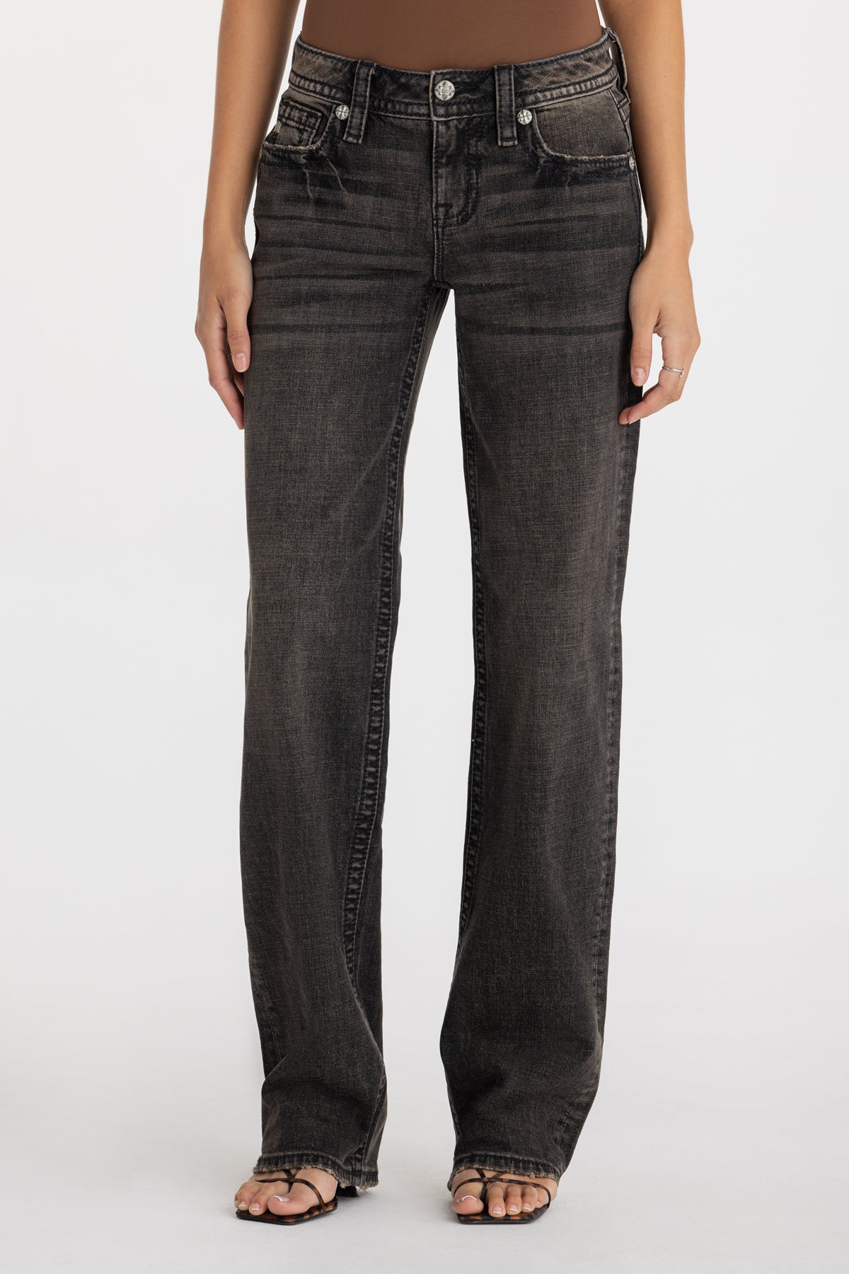 Washed, mid-rise bootcut jeans – Embroidered leather appliqué border design – Rhinestone rivet accents – Abraded pocket edges – Embossed black studded leather cross Miss Me brand patch – Whiskering details – Functional back pockets – 5-pocket design Model is wearing size: 25 Model Measurements: Height: 5’9″ Bust: 34B Waist: 25″ Hips: 36″ Fabric Content: 99% Cotton, 1% Elastane Care: Gentle machine wash inside-out with like colors in cold water. Tumble dry low. Style No.L9546SWL-B051, L9546SWS-B051, L9546SWV-B051
