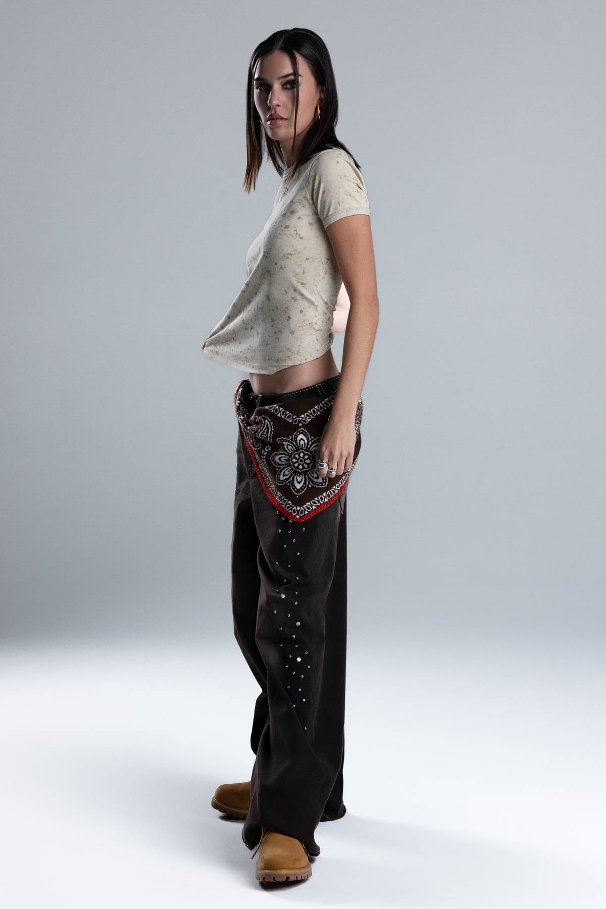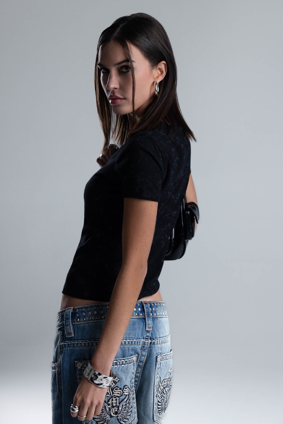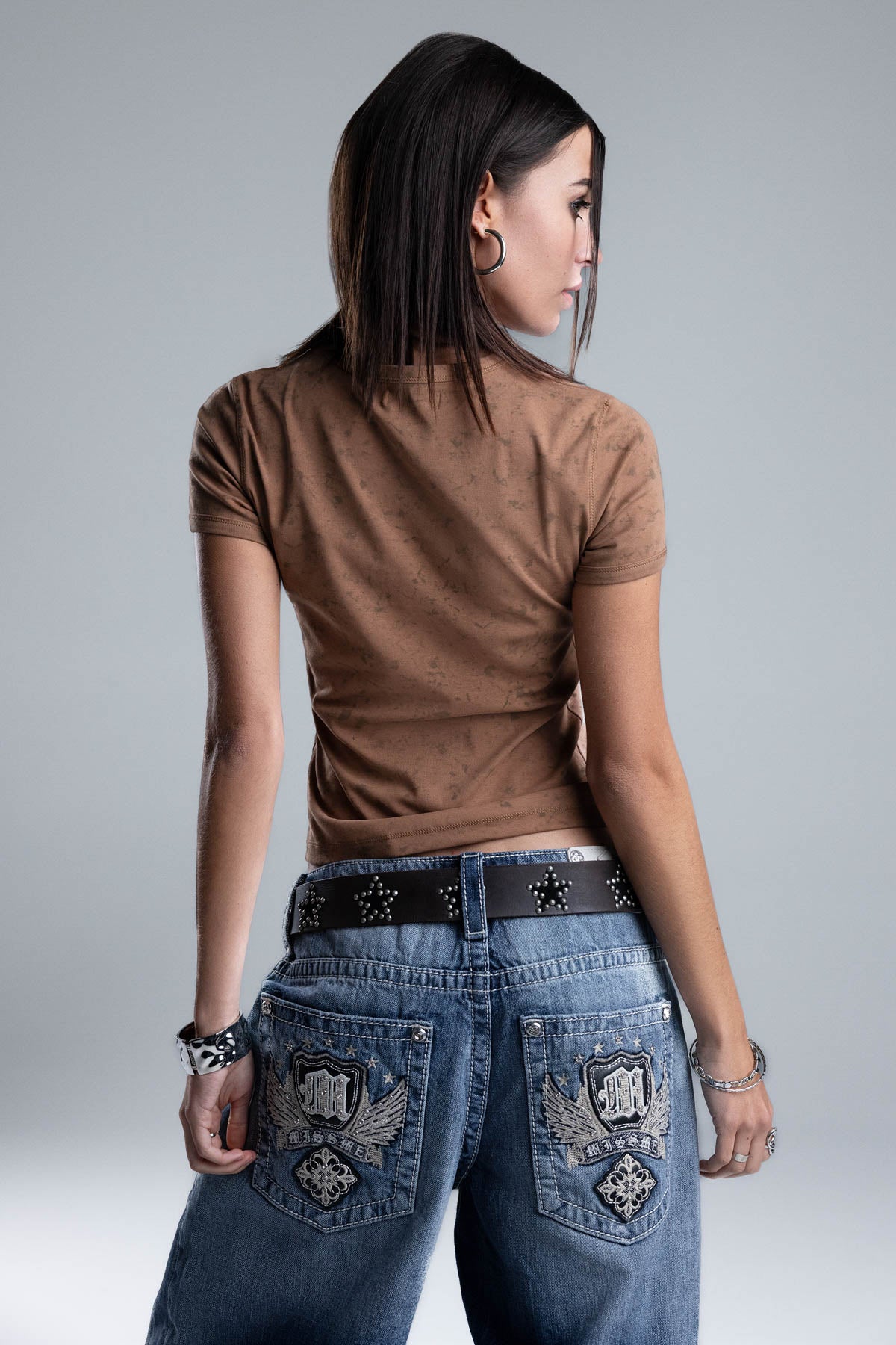 Acid-washed graphic tee – Barbed wire-framed logo graphic – Classic crew neckline – Slim fit silhouette Style No. BMT0061S-BEIGE, BMT0061S-BLACK, BMT0061S-COCOA BRN