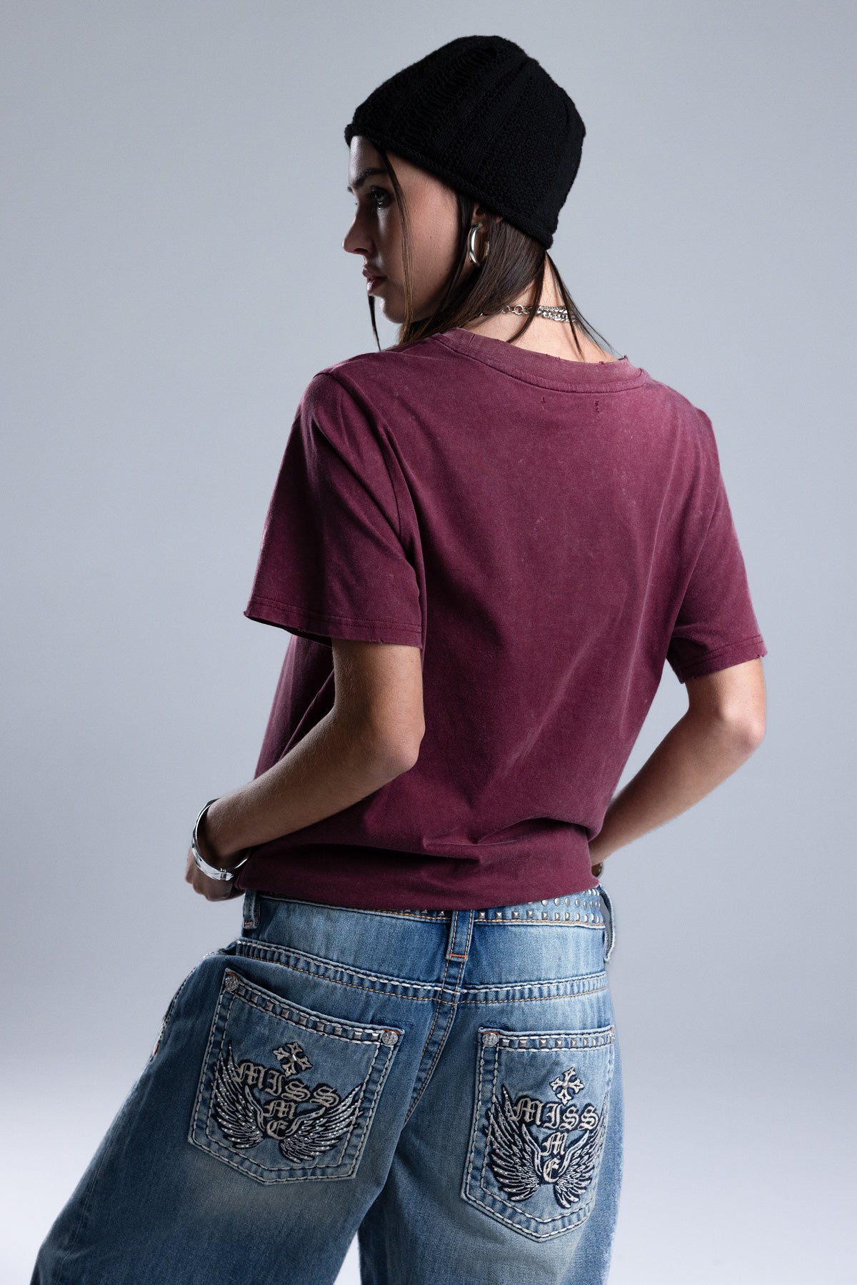 Relaxed fit graphic tee – Vintage gothic Miss Me script graphic – Soft washed cotton finish – Straight hem – Crew neckline Style No. BMT0879S-CHRC BLK, BMT0879S-RUSSET RED