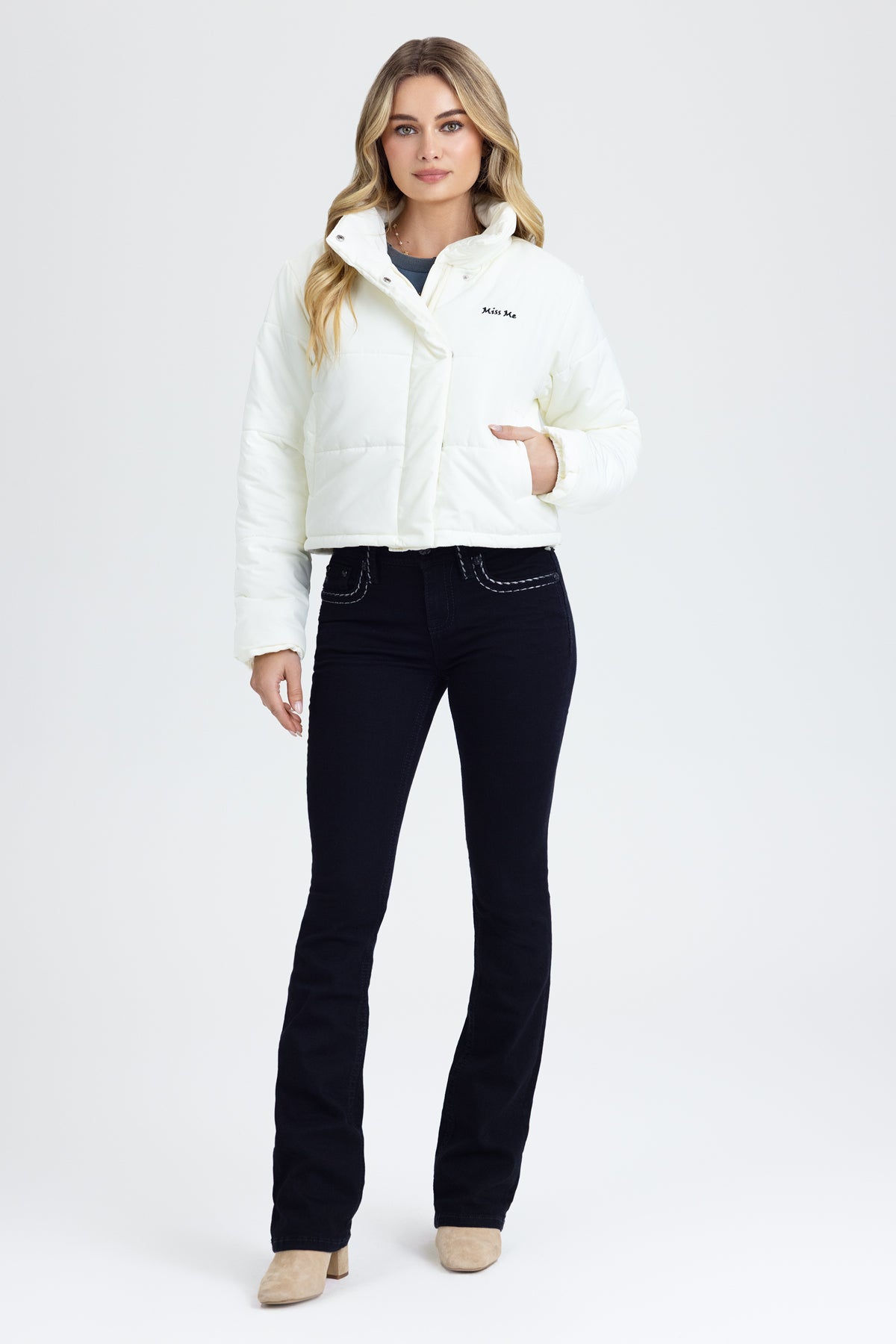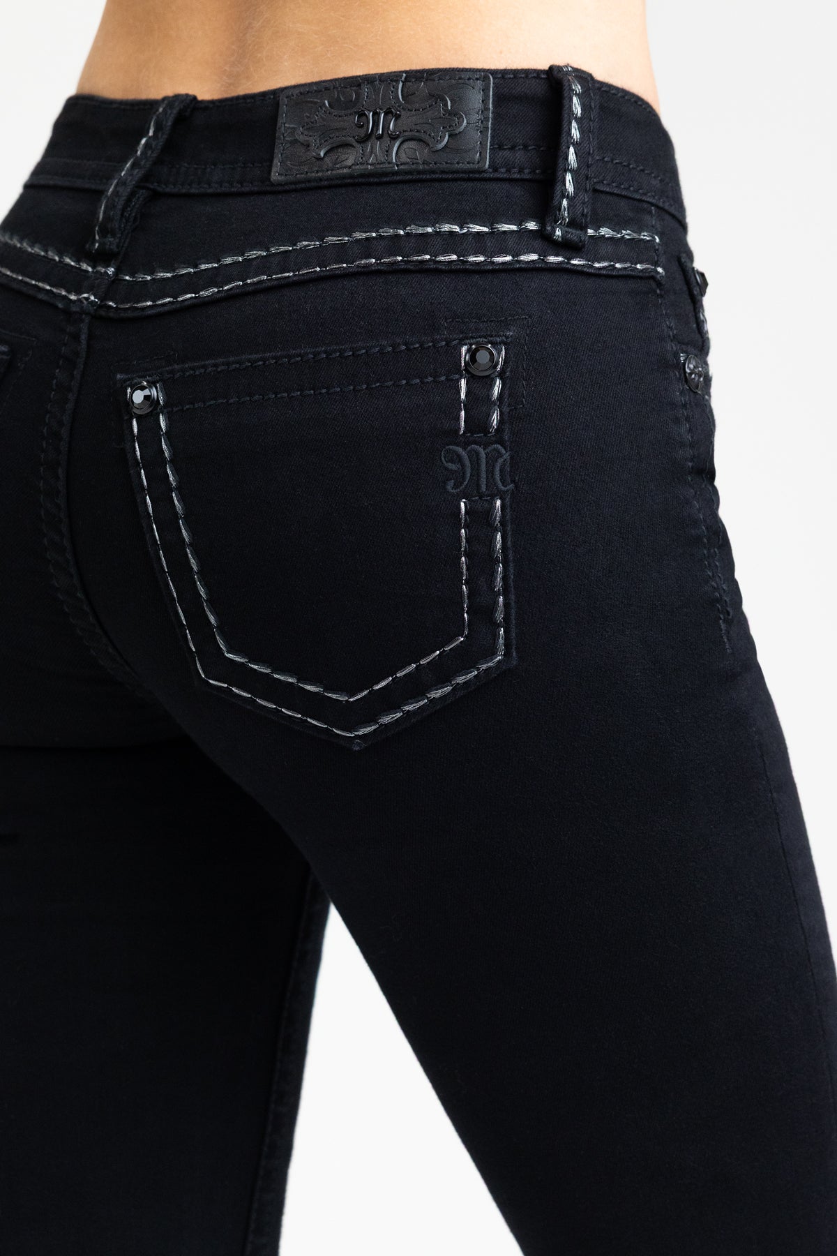 Mid-rise bootcut jeans – Contrast saddle-stitched border design – Embroidered mini stitched logo – Rhinestone rivet accents – Embossed black leather cross Miss Me brand patch – 5-pocket design Model is wearing size: 25 Model Measurements: Height: 5????Bust: 32B Waist: 25??Hips: 35??Fabric Content: 70% Cotton, 20% Polyester, 8% Rayon, 2% Elastane Care: Gentle machine wash inside-out with like colors in cold water. Tumble dry low. Style No. M5012B72S-B01, M5012B72V-B01, M5012B72L-B01